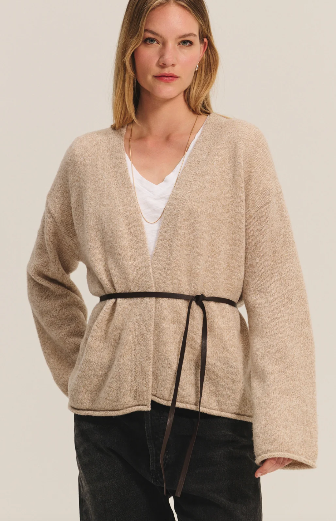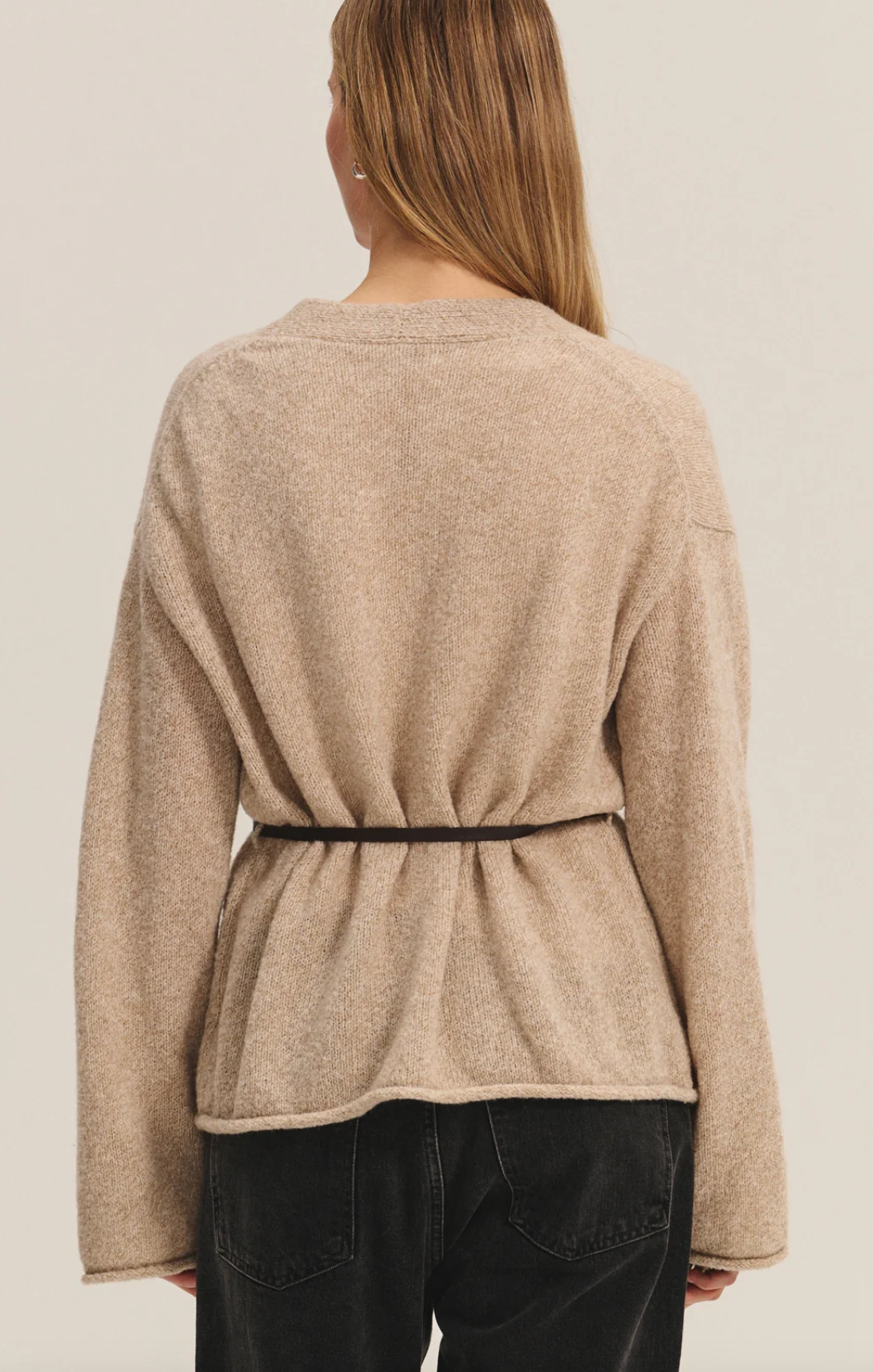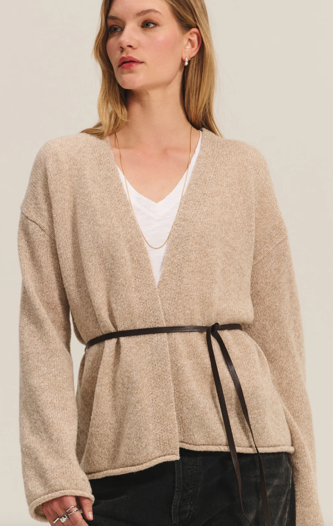 Offering effortless versatility, this cardigan is crafted from a soft wool blend with an open-front design and relaxed silhouette. Rolled cuffs, a drop shoulder, and side belt loops for adding your own detachable belt make it a chic, adaptable layer for any occasion.