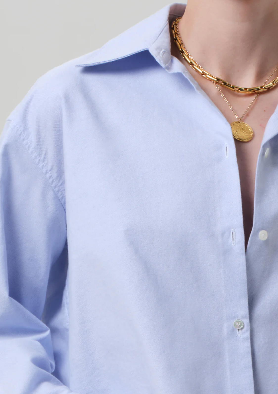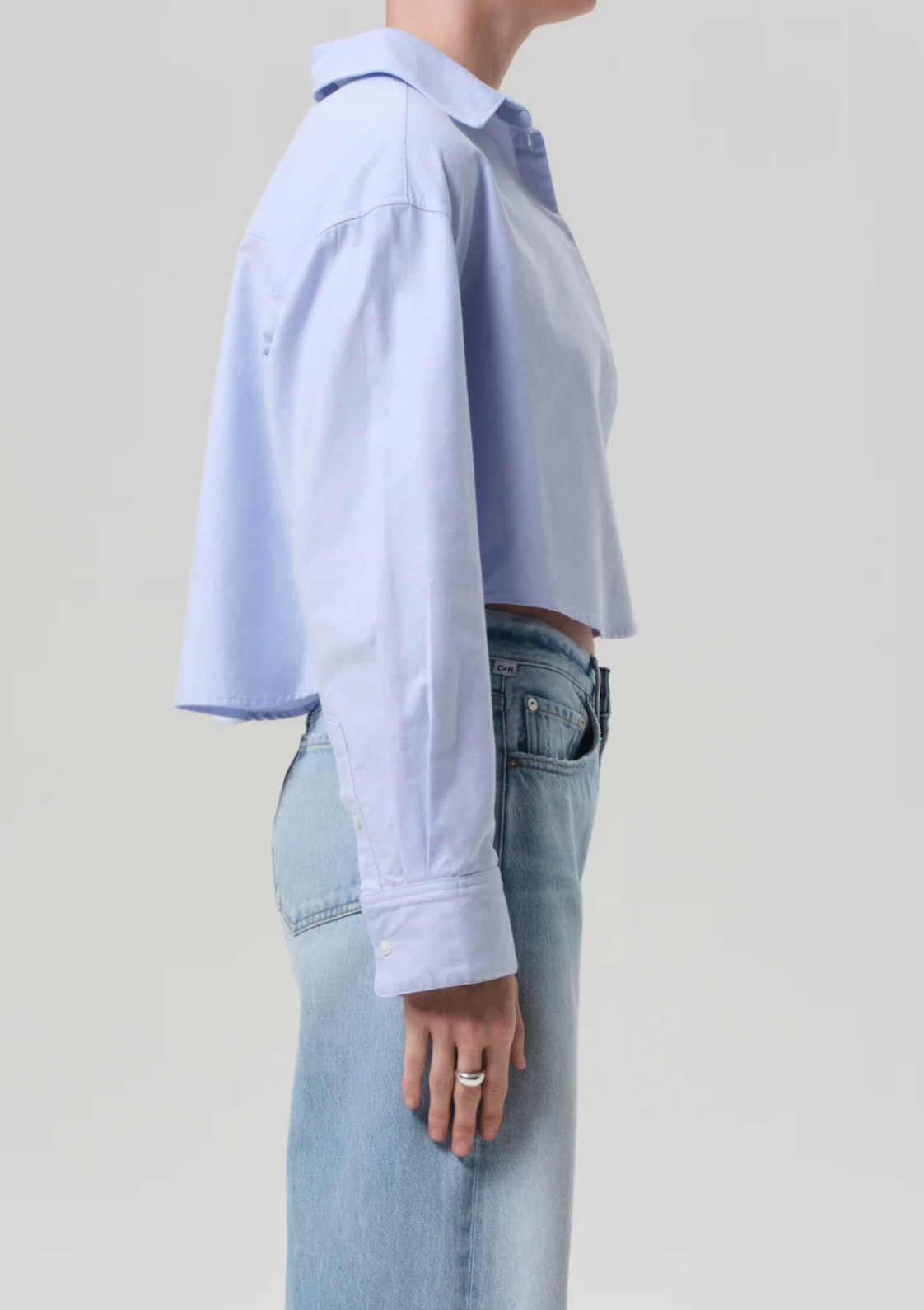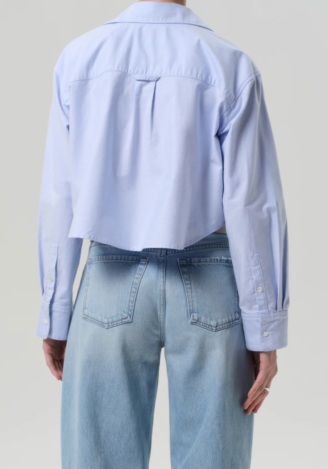 Crisp and lightweight, the Ana shirt is cut from airy oxford cotton with a soft hand. The cropped silhouette, pointed collar, and long sleeves offer a modern play on shirting proportions. In a clean light blue, it brings a fresh, tailored feel—ideal layered over tanks or styled with high-rise denim.