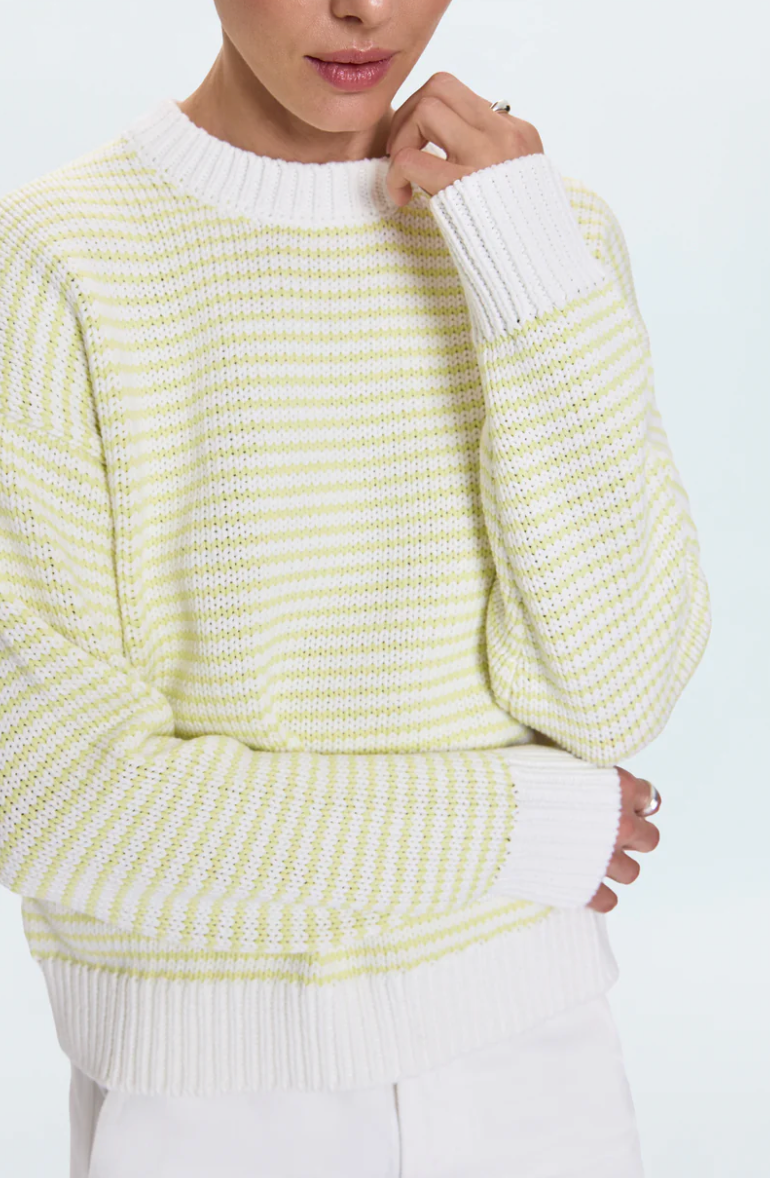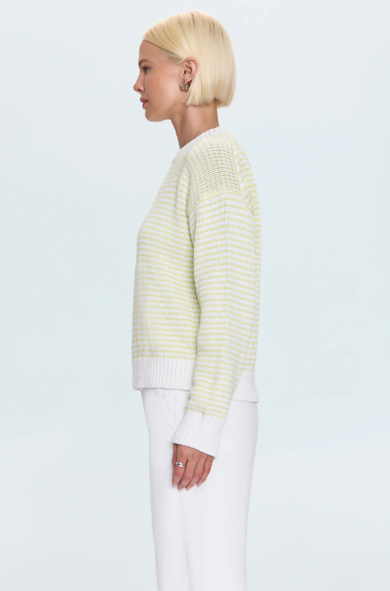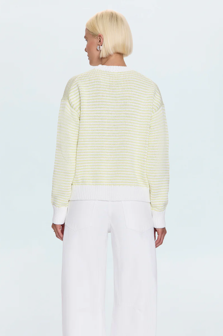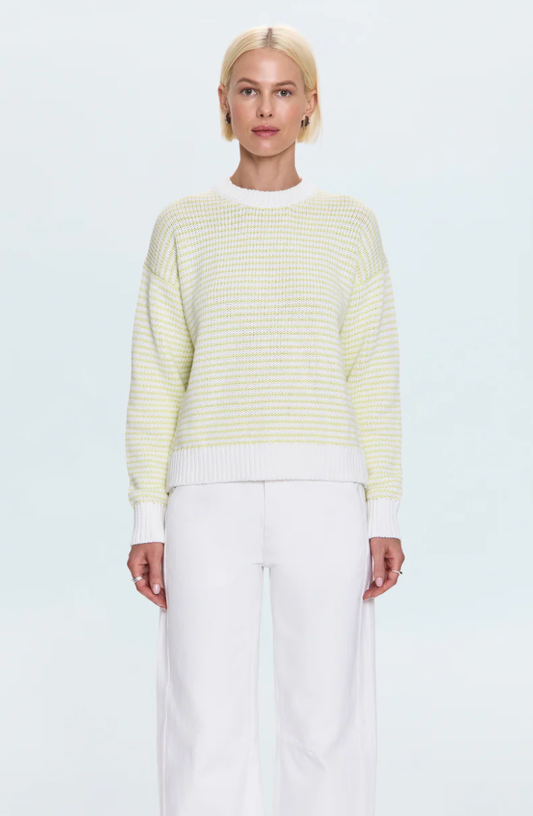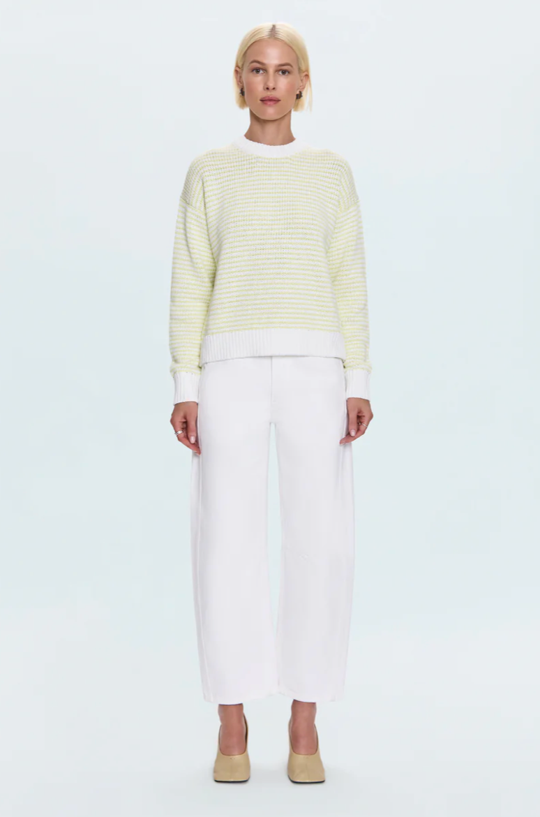 A classic made modern, Aura features a crew neckline and relaxed fit that drapes effortlessly over denim, trousers, or skirts. Knit from 100% cotton, it’s soft yet structured—easy to layer, easy to love. Finished with ribbed details for a touch of texture. Limeade, a refreshing pastel green, adds a playful hit of color that brightens the season.