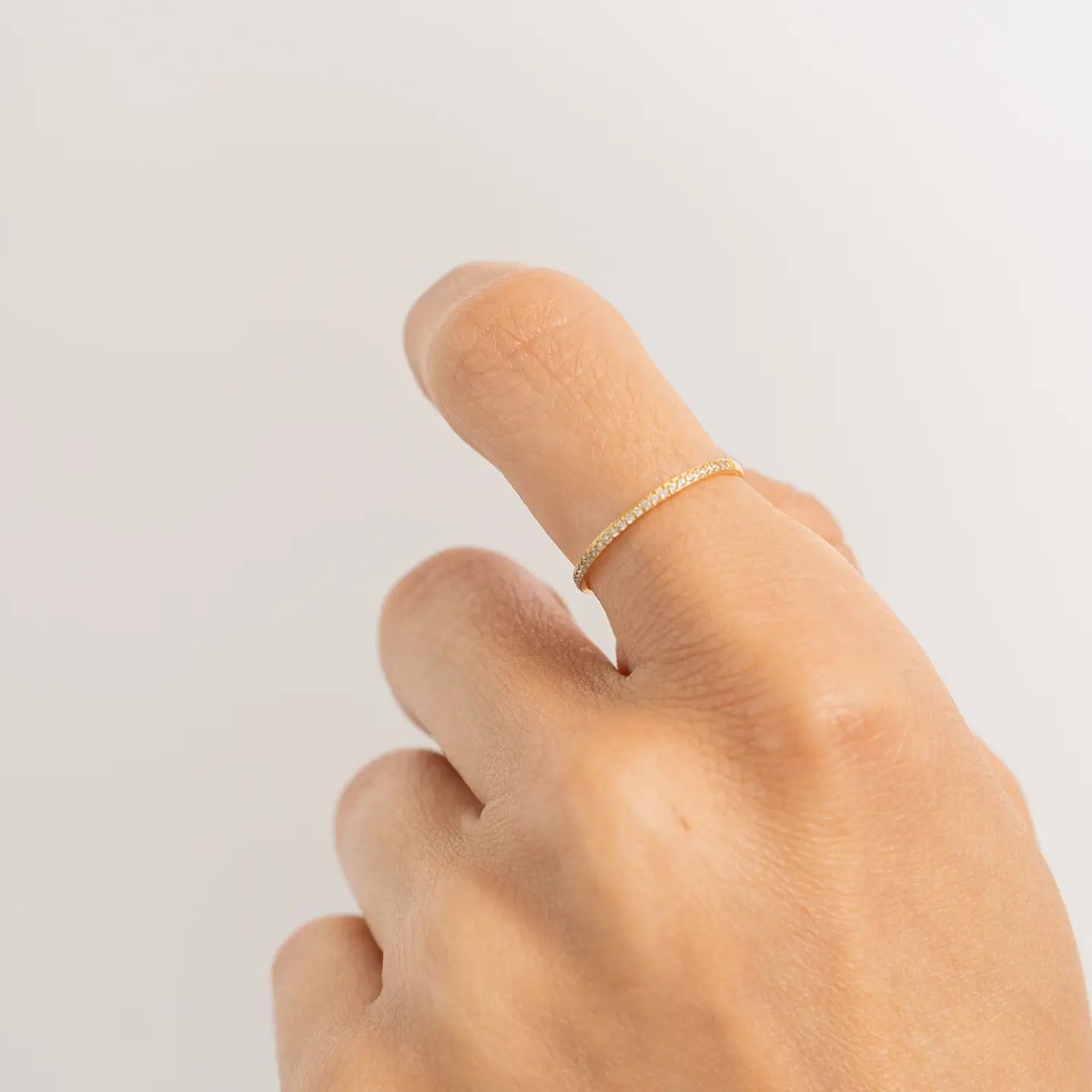Simple elegance. These dainty diamond bands add a touch of sparkle to your stack. Perfectly understated and beautifully crafted from waterproof 18K gold plated stainless steel.