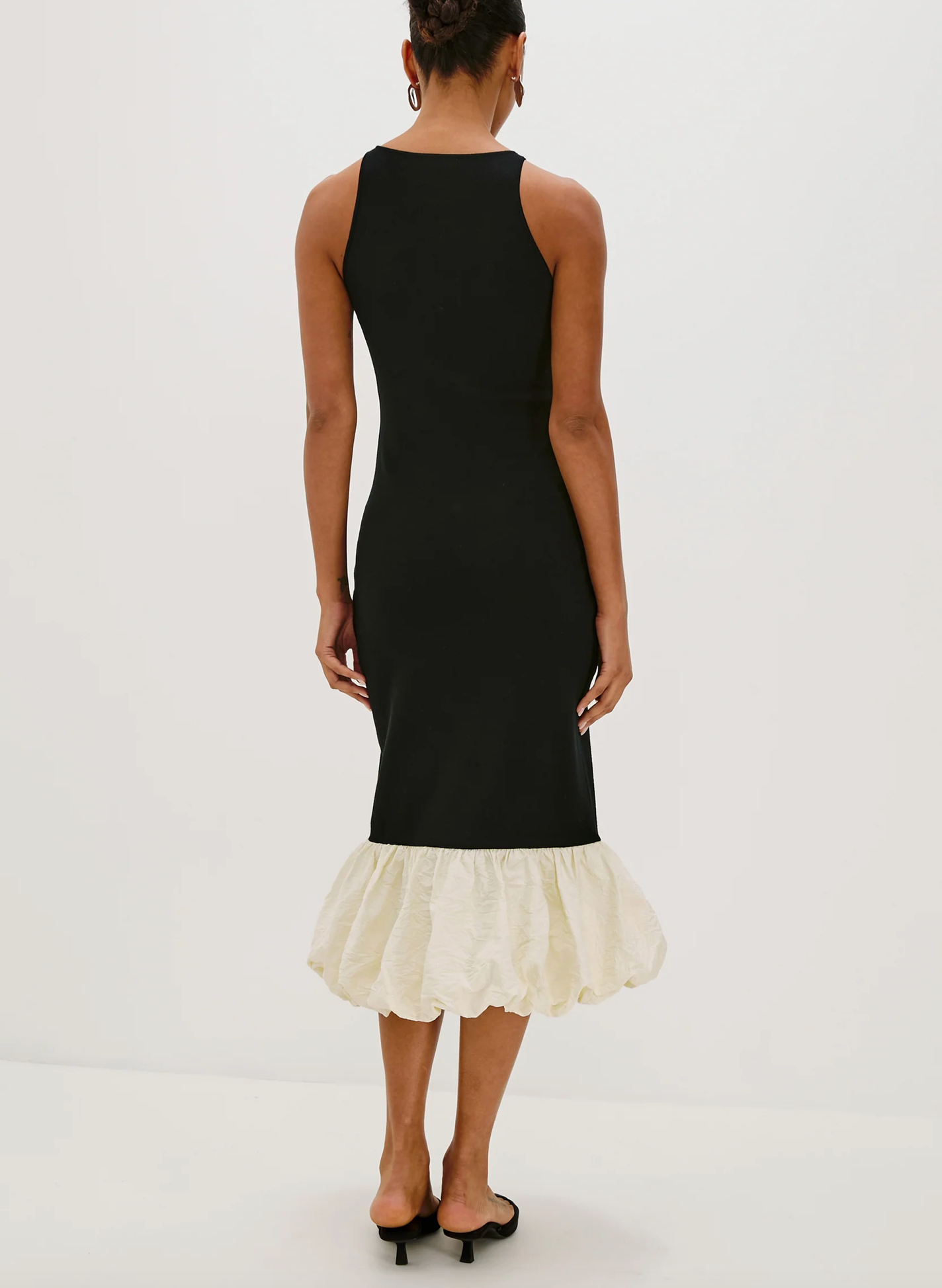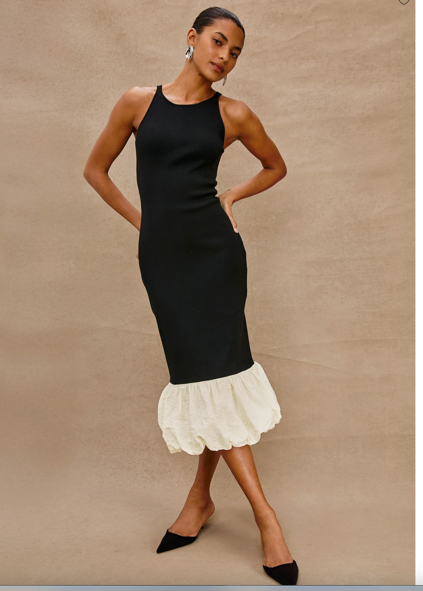 The Cheryl is a maxi-length dress with standout details. It features a fitted top crafted in a fine-gauge sweater knit and a contrast bubble hem in cotton poplin.