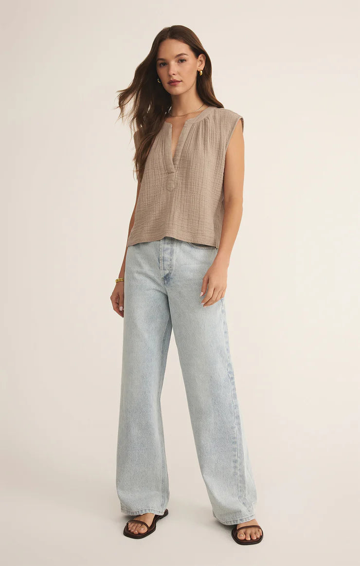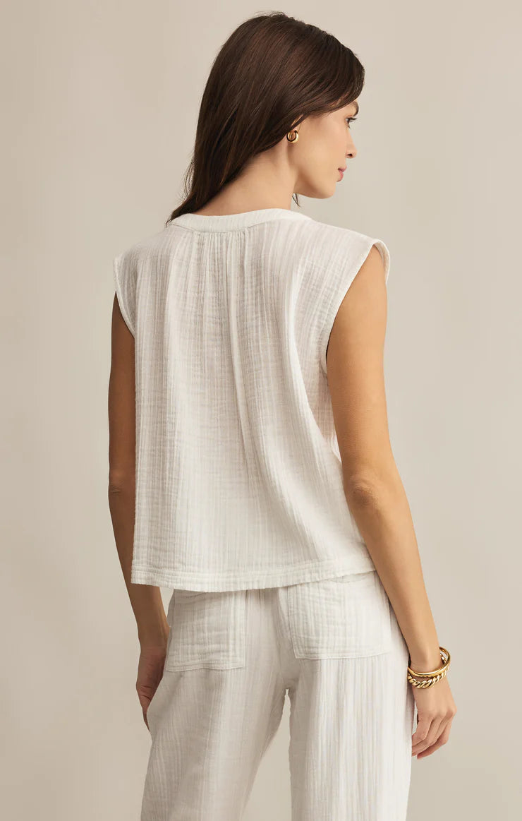This sleeveless v-neck top is crafted from lightweight, 100% cotton gauze with soft shirring at the neckline for a touch of texture. With its breezy fit and airy feel, it's a warm-weather essential for everything from beach days to brunch.