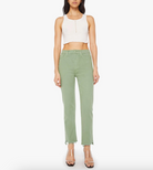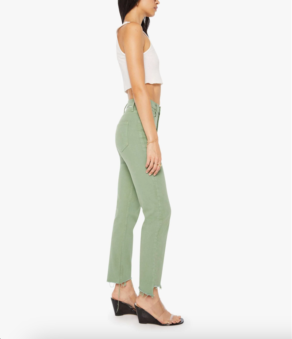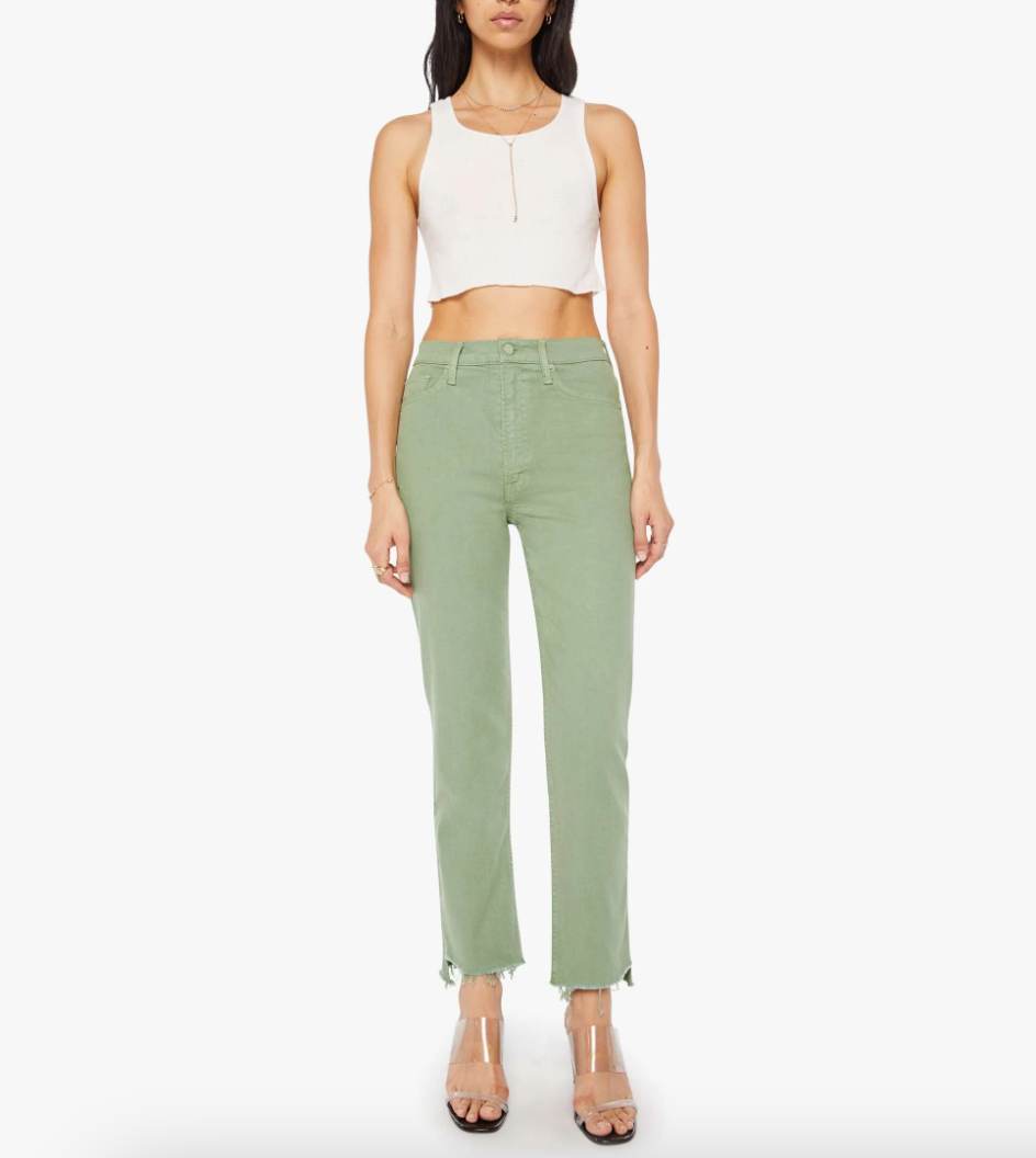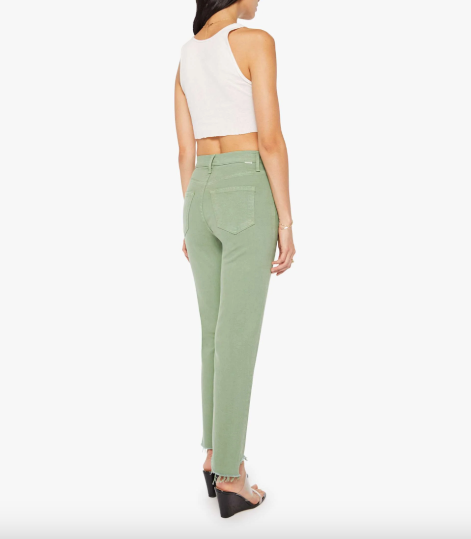 High-rise straight-leg jeans with a zip fly, ankle-length inseam and a frayed step-hem. Made from stretch denim, the jeans are designed in a faded army green with tonal hardware.
