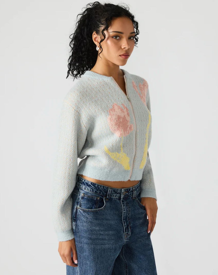 The Jena Sweater Jacket combines versatile layering with distinctive style. This long-sleeved zip-up design features an eye-catching floral pattern that adds visual interest to any outfit. The sweater jacket construction offers the comfort of a cozy knit with the structured appeal of a jacket, making it ideal for transitional seasons or layering over basics. The full-zip front allows for easy styling adjustments throughout the day, whether worn open as a statement layer or zipped for warmth. Perfect for elevating casual ensembles with a touch of botanical-inspired sophistication.