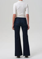 The Kimberly is a high-rise flare inspired by classic '70s silhouettes, designed to elongate the leg and contour the waist. Crafted from comfort stretch denim with a super soft hand, it offers lasting shape and all-day ease. The Madison wash—a dark indigo with soft fading and whiskering—adds a touch of vintage refinement. Style with slim knits or structured shirting for a clean finish.