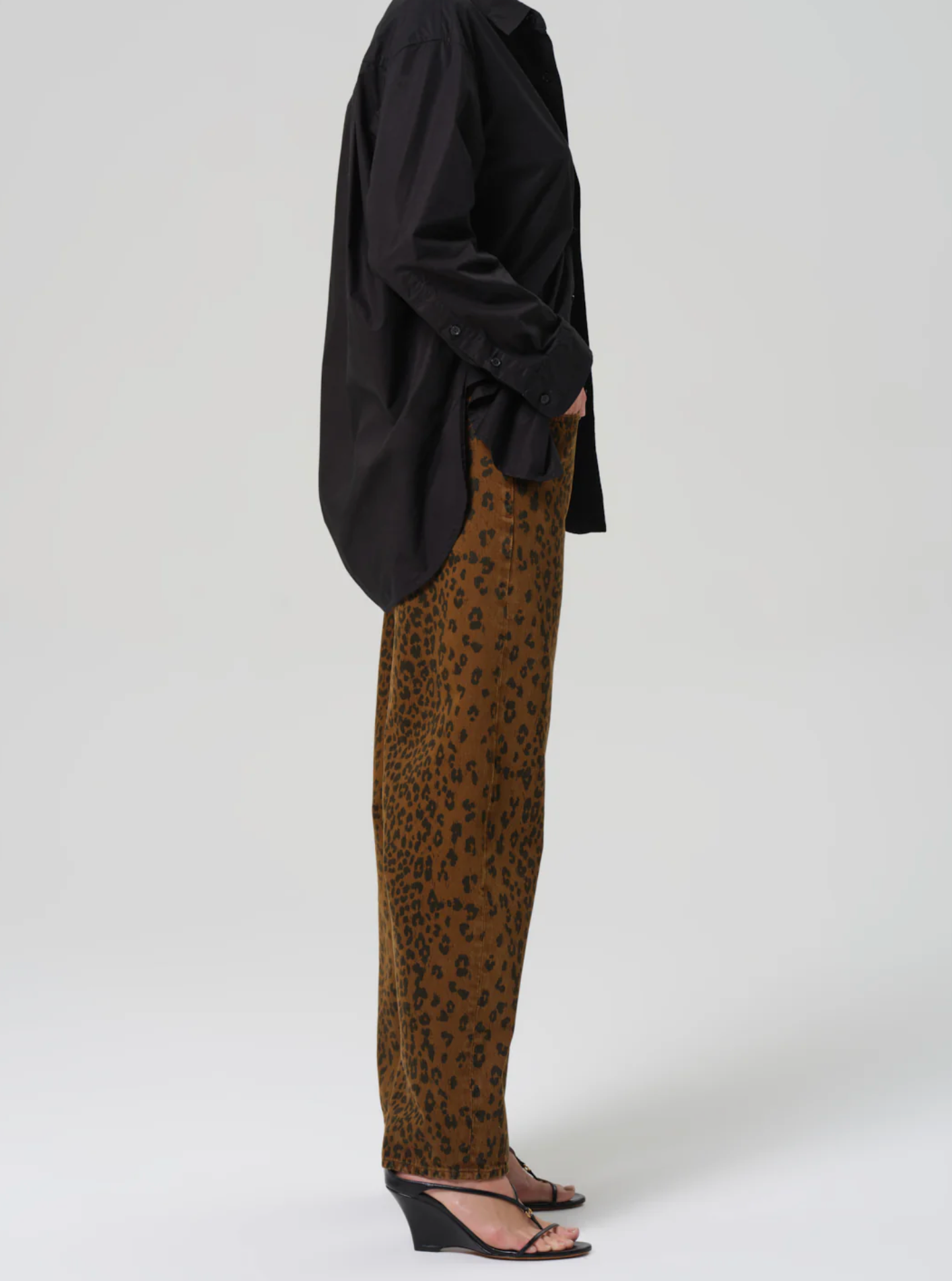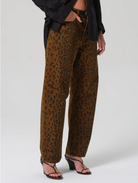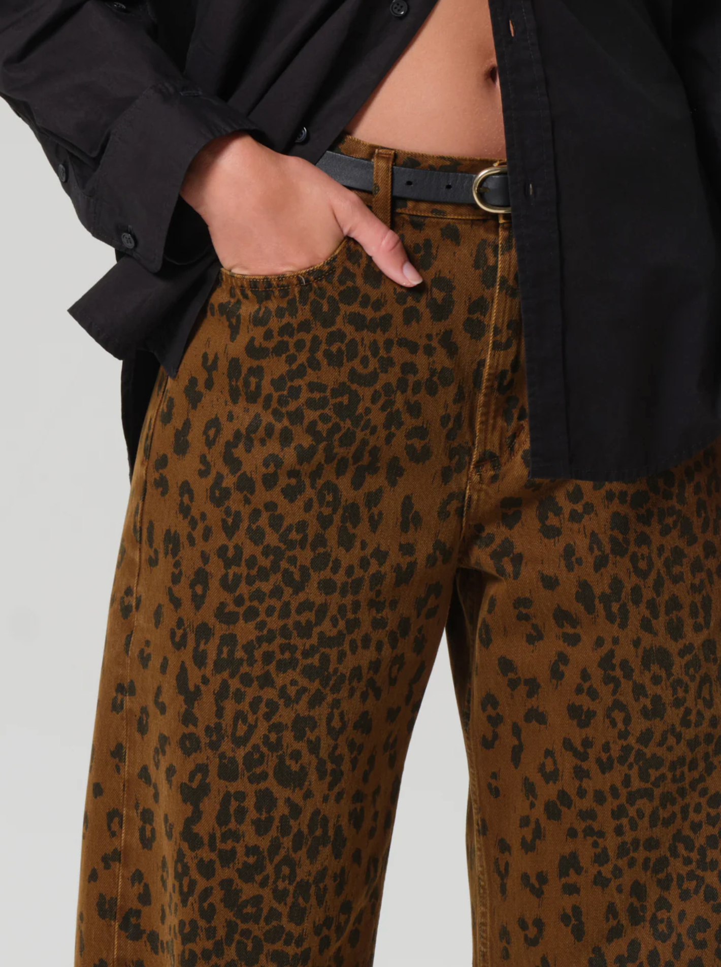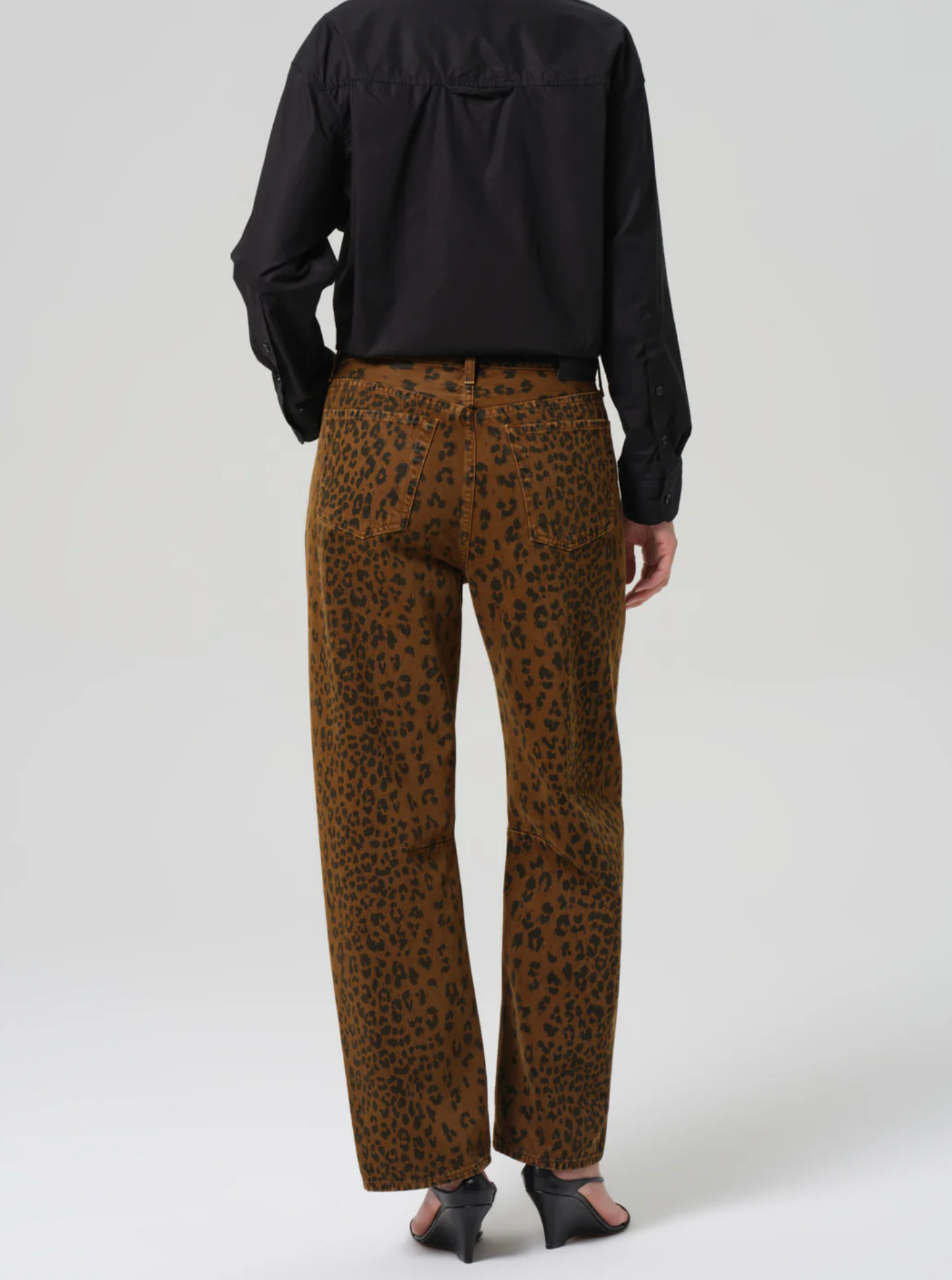 A low-slung relaxed jean crafted from rigid, non-stretch denim for a structured yet effortless feel. The silhouette tapers to the ankle, creating a clean, contemporary line. Dark brown denim with subtle black cheetah print detailing brings a refined, unexpected touch—perfect styled with minimal layers and sleek footwear for a polished, modern look.