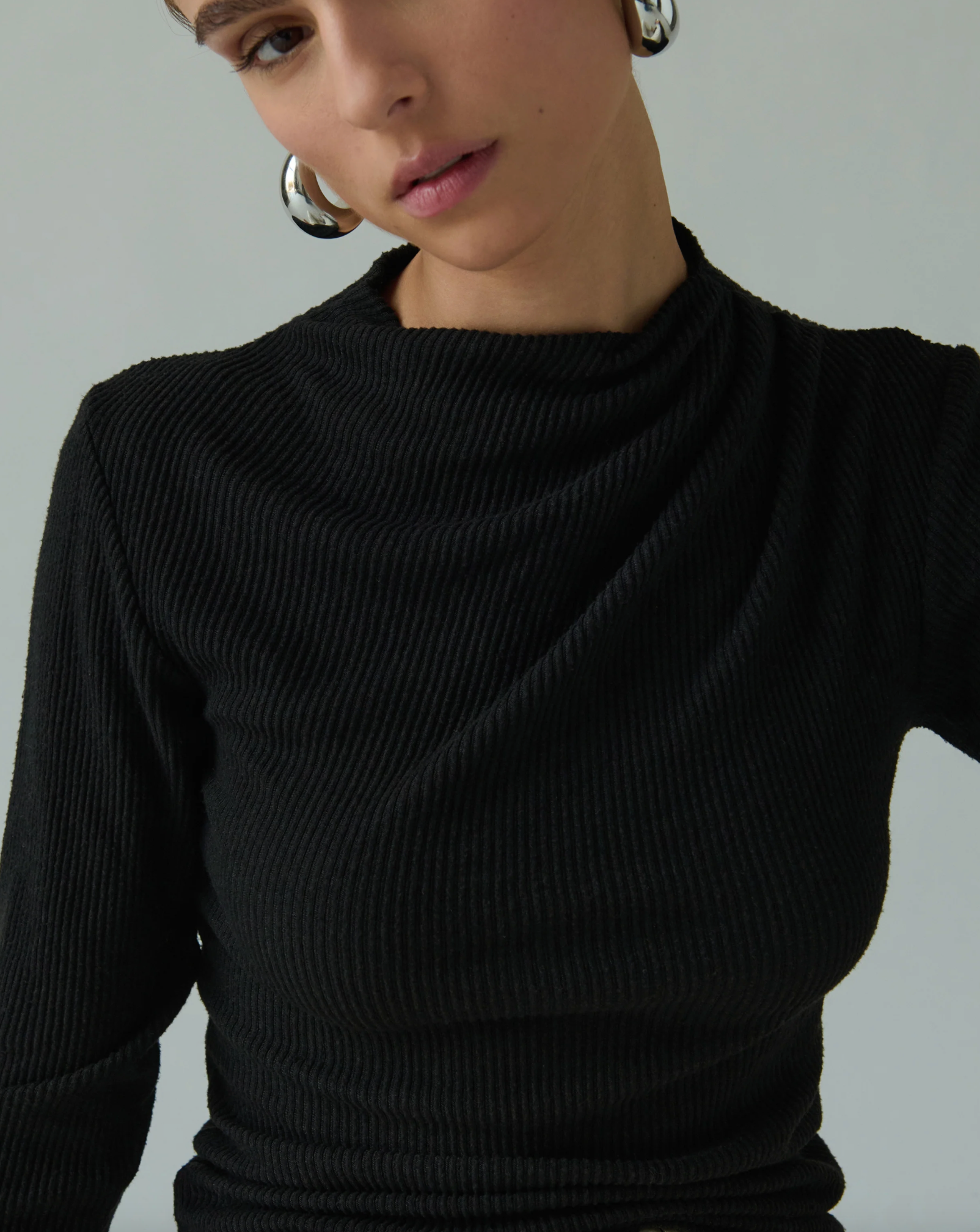 Unapologetically asymmetric, the Neda is a cool girl’s go-to for a night out. (Or in. Wink, wink.) Made of our super-soft, eco-friendly Hacci Rib, with a mock neck and classic long sleeves.