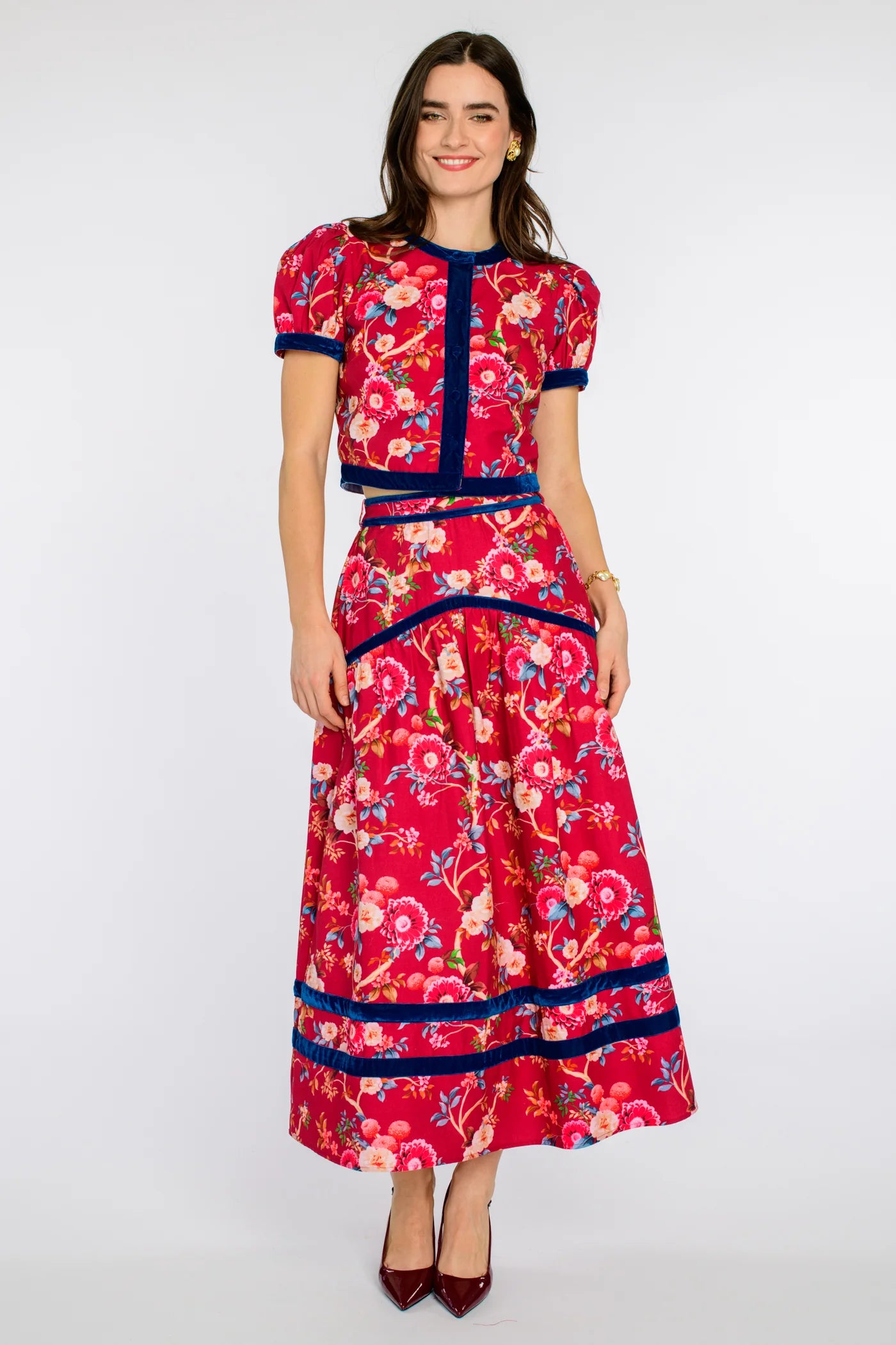 You know & love her! Phoebe is a classic EJ skirt style, known for her flattering drop waist silhouette. We've elevated this season's Phoebe, adding velvet trim to complement this Holiday print.Shown in Chinoiserie Scarlett