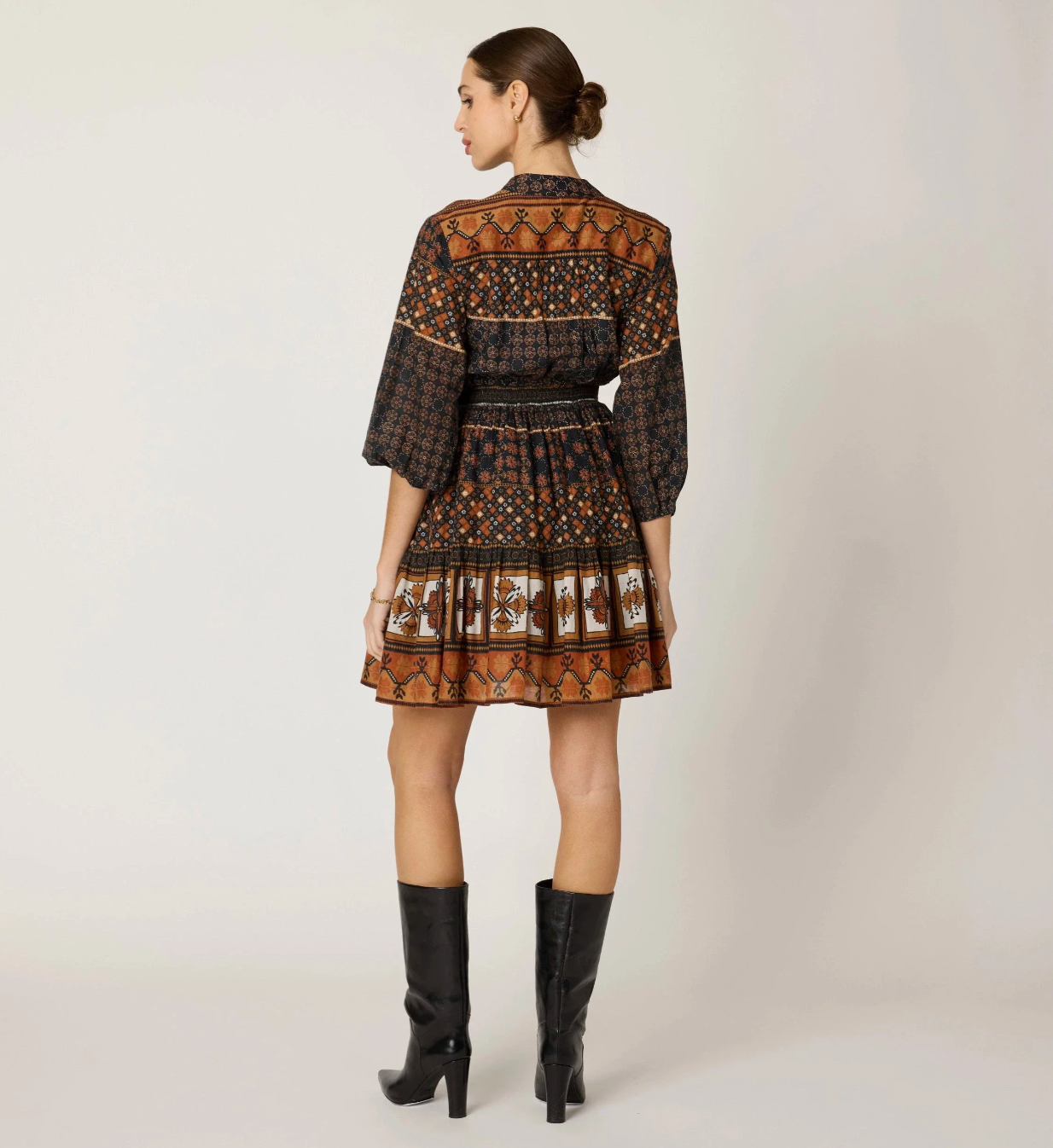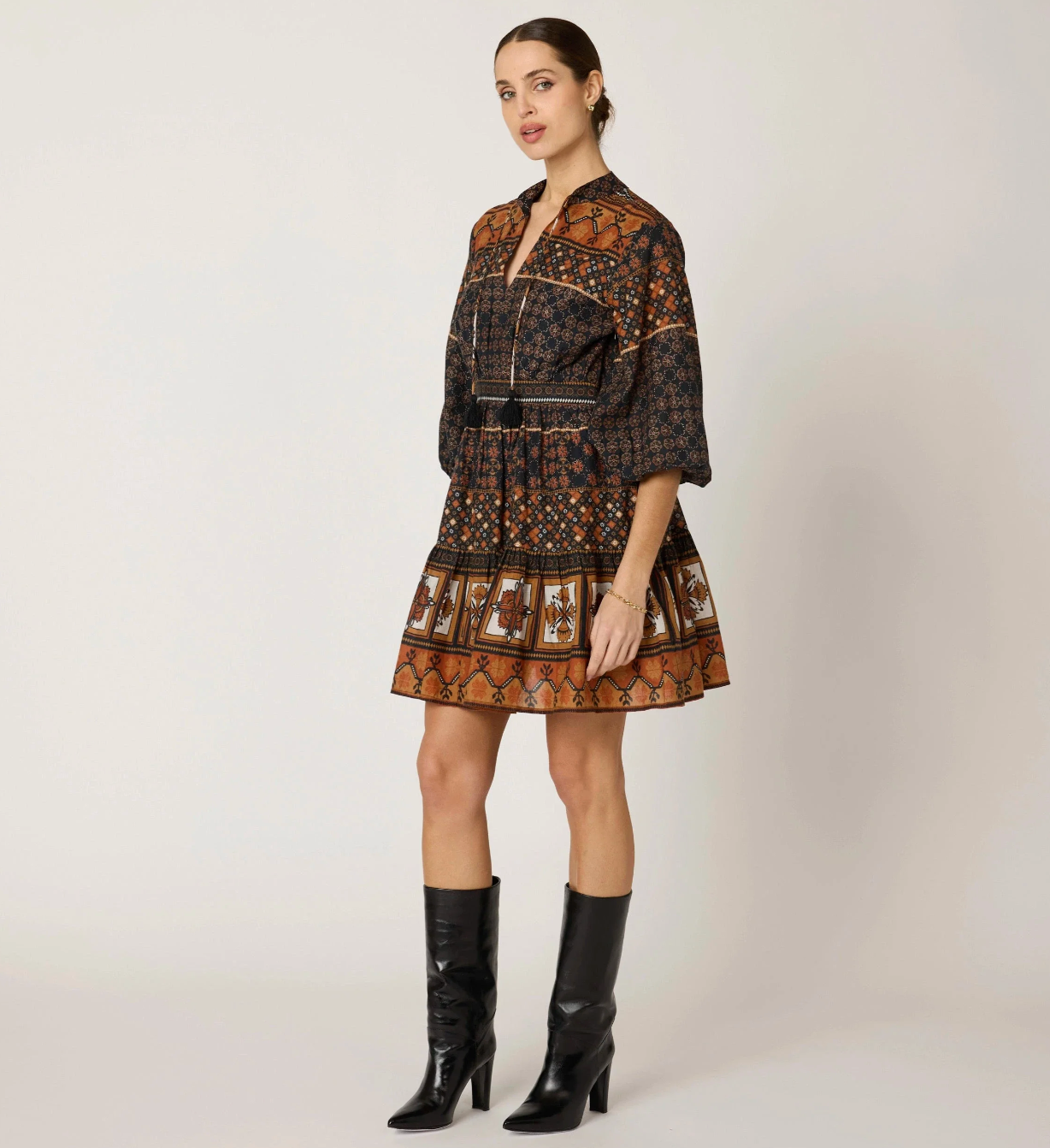 Ethically handmade in India from 100% GOTS certified organic cotton, the Priyanka Mini Dress flows effortlessly in our fall-favorite Zocalo print, making it a carefree, throw-on-and-go favorite. The 3/4 sleeves and delicate tassels at the neck ties add subtle, playful detail. Pair with your favorite boots and a relaxed leather jacket, or let it shine on its own with simple sandals for an easy, sunlit afternoon look.