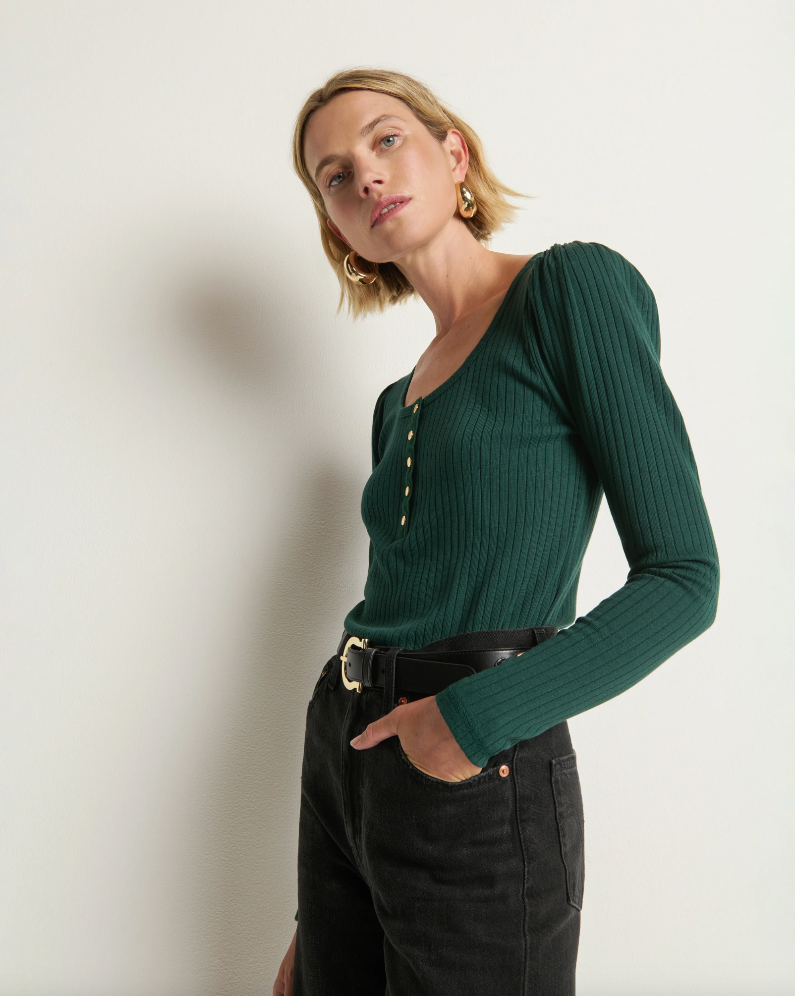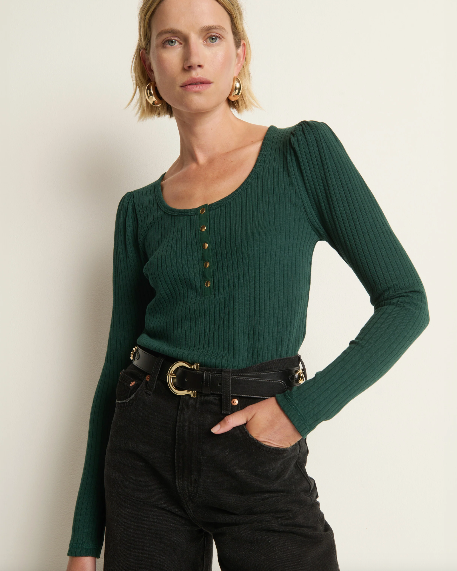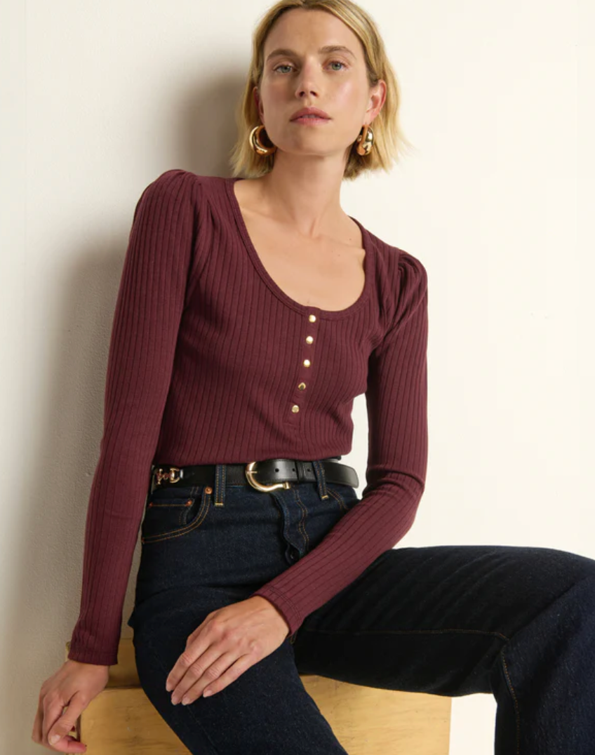 A staple you’ll find new ways to incorporate every time you wear it. The Reeva Henley is a fitted essential cut from an extra soft rib with just the right amount of stretch. Puff long sleeves and snap front closures add balanced, quiet confidence.