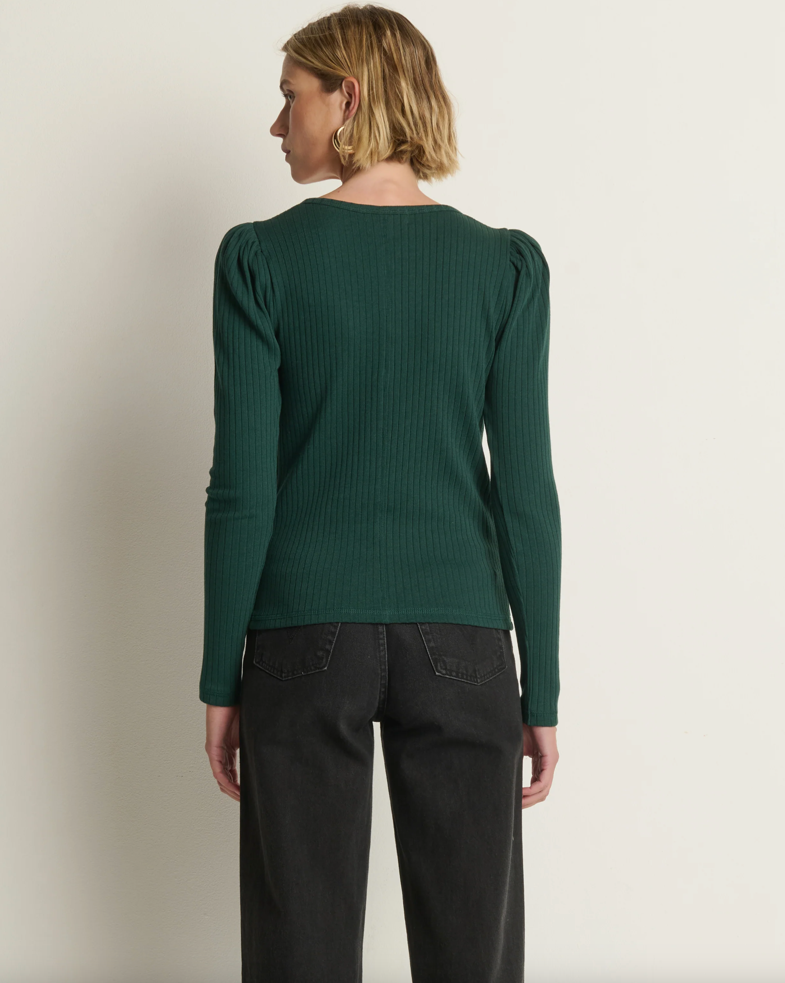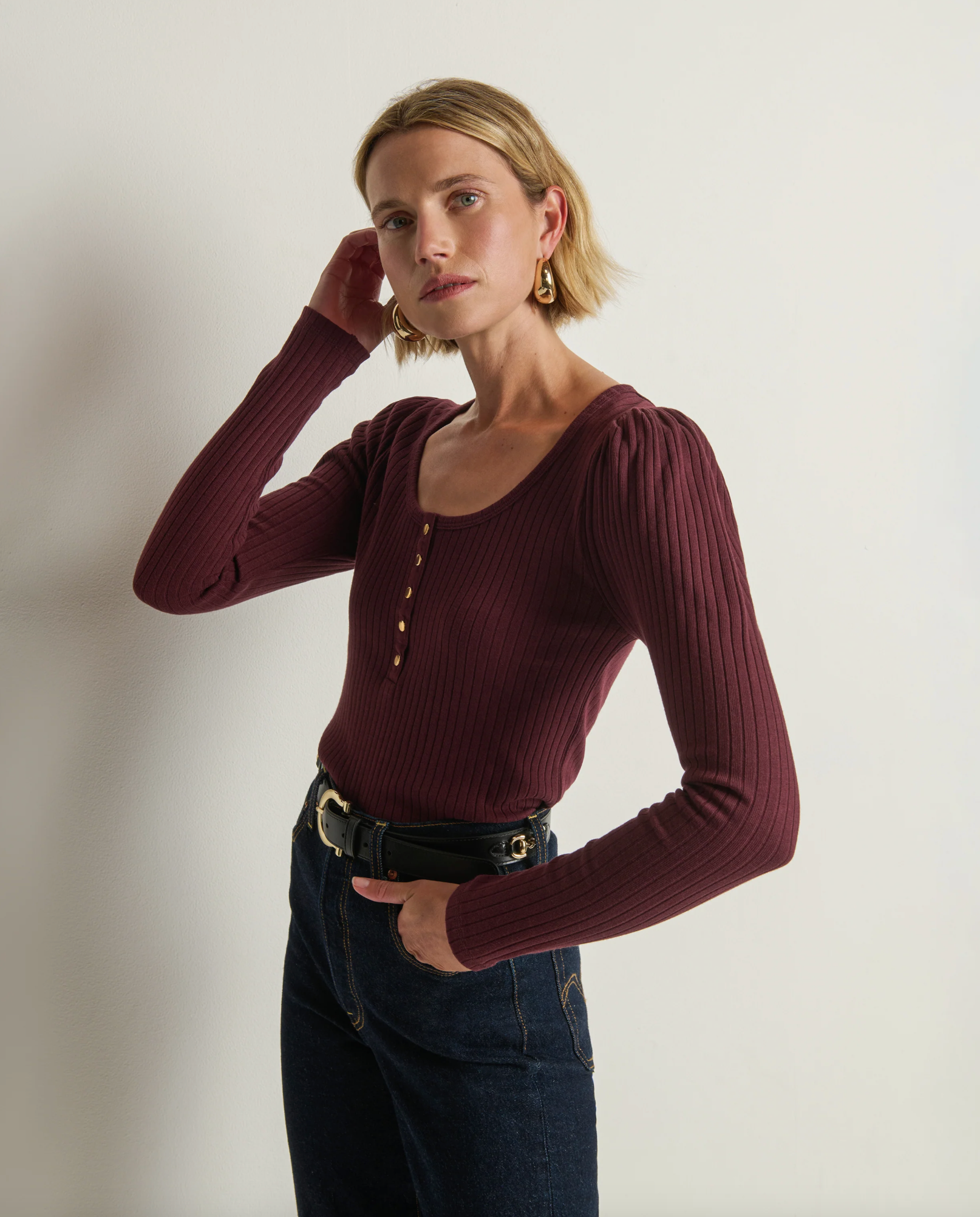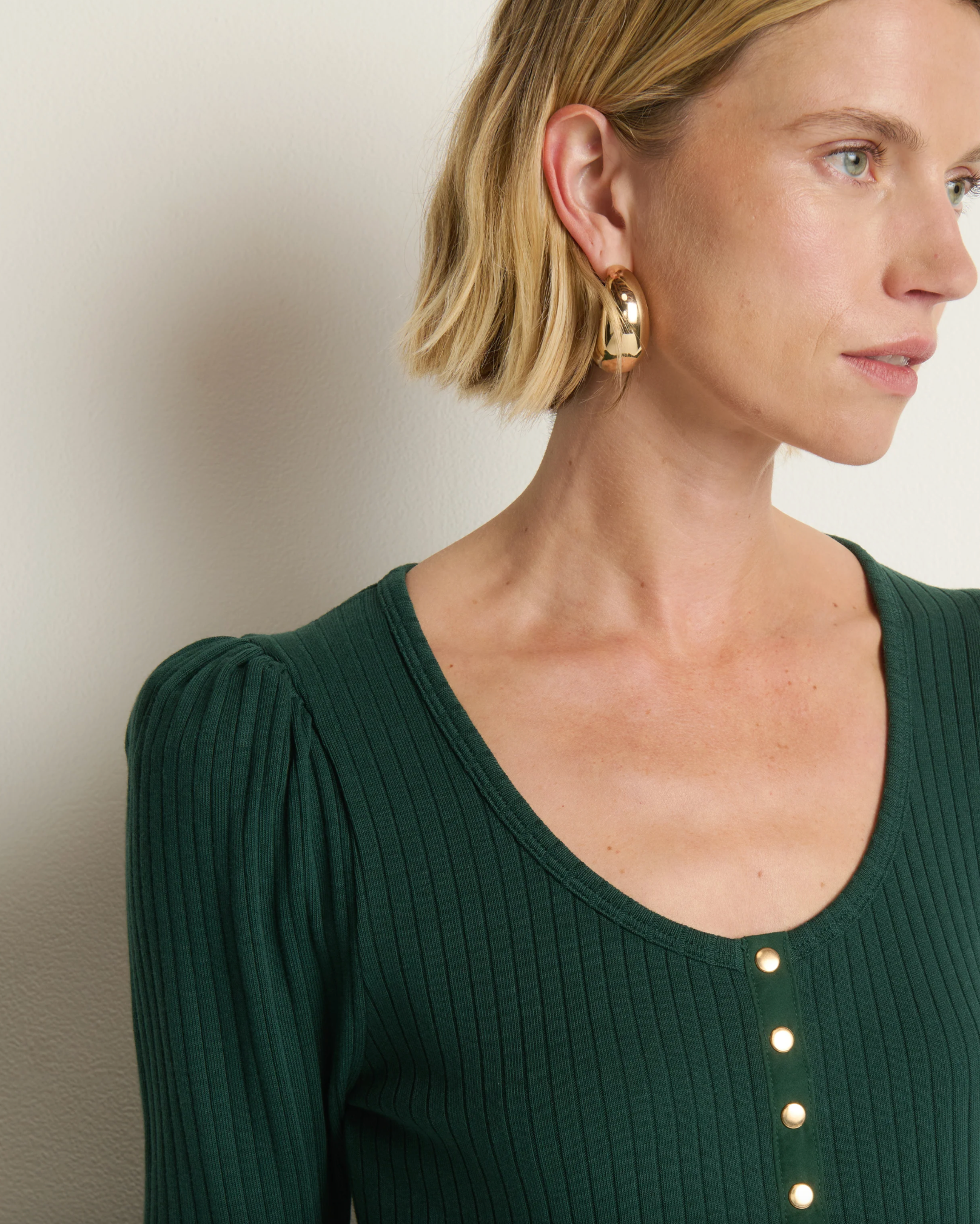 A staple you’ll find new ways to incorporate every time you wear it. The Reeva Henley is a fitted essential cut from an extra soft rib with just the right amount of stretch. Puff long sleeves and snap front closures add balanced, quiet confidence.