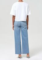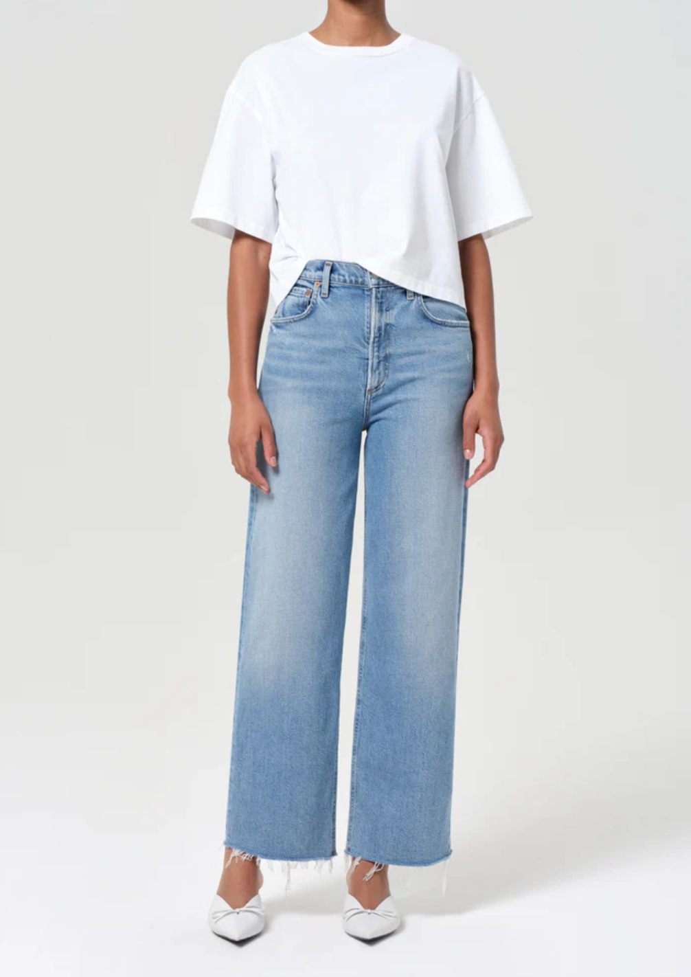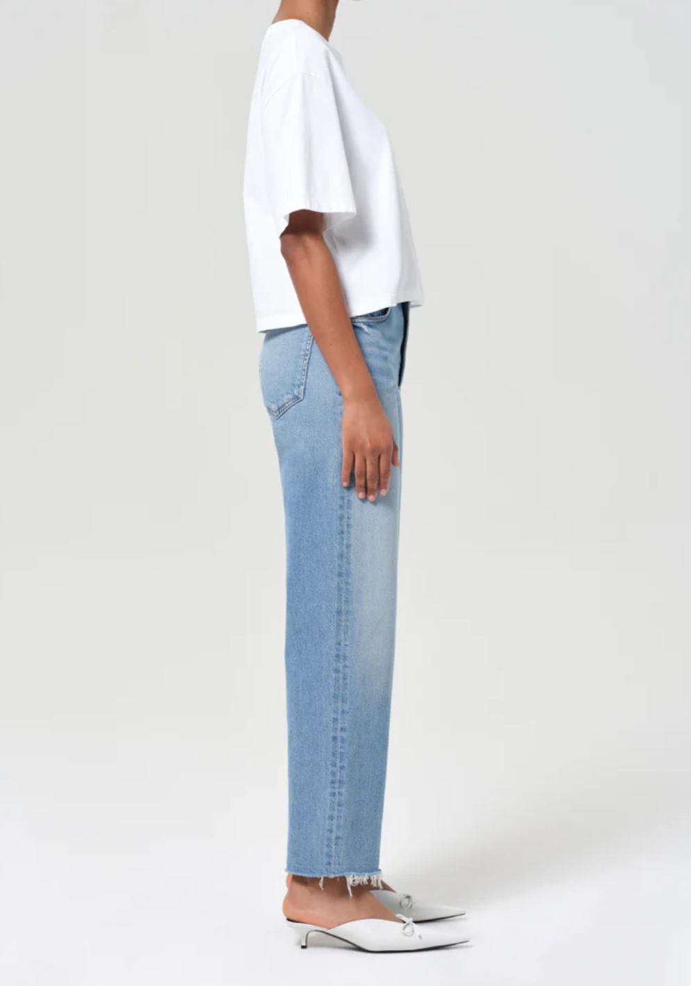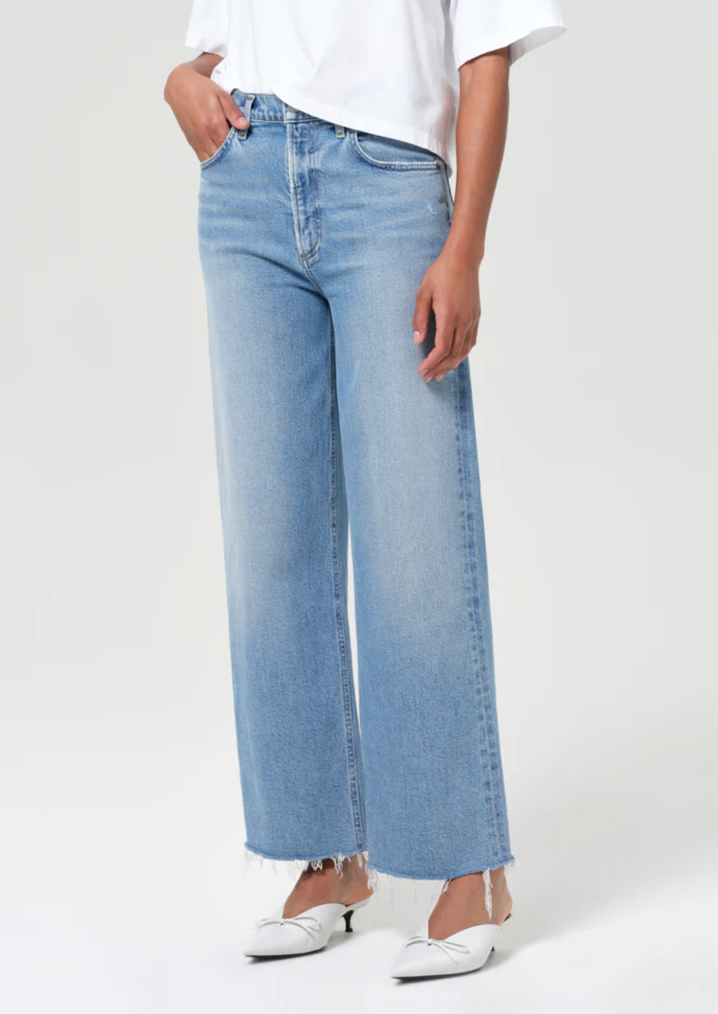 AGOLDE's Ren jeans are crafted with EcoMade Fiber, combining regeneratively grown cotton, Eco-Indigo dye, and plant-based LYCRA® EcoMade Fiber to set a new standard for sustainable denim. Offering a relaxed fit with a high-rise waist and cropped wide legs, these jeans are perfect for casual days. Pair them with a half-tucked tee or sleek bodysuit for an effortlessly chic look.