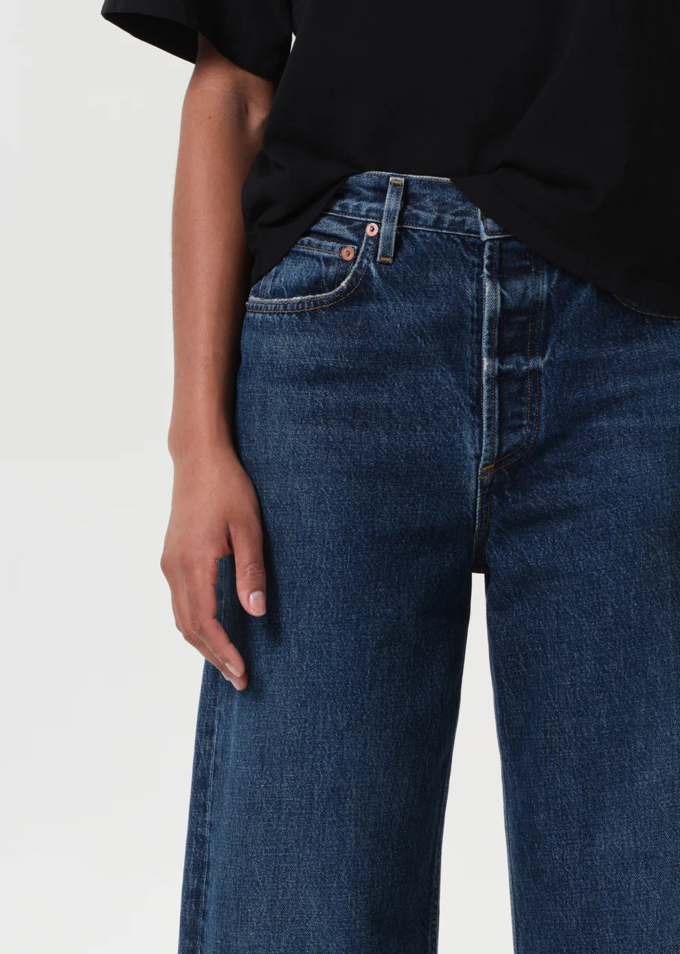 AGOLDE’s Ren Jean features a dark tinted indigo in a classic wide-leg silhouette. Made from 100% weightless, non-stretch denim with a super soft hand, these high-rise jeans offer a relaxed yet flattering fit with subtle fading, marbling, and whiskering details. Pair with a simple tee or structured jacket for effortless style.
