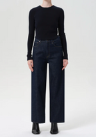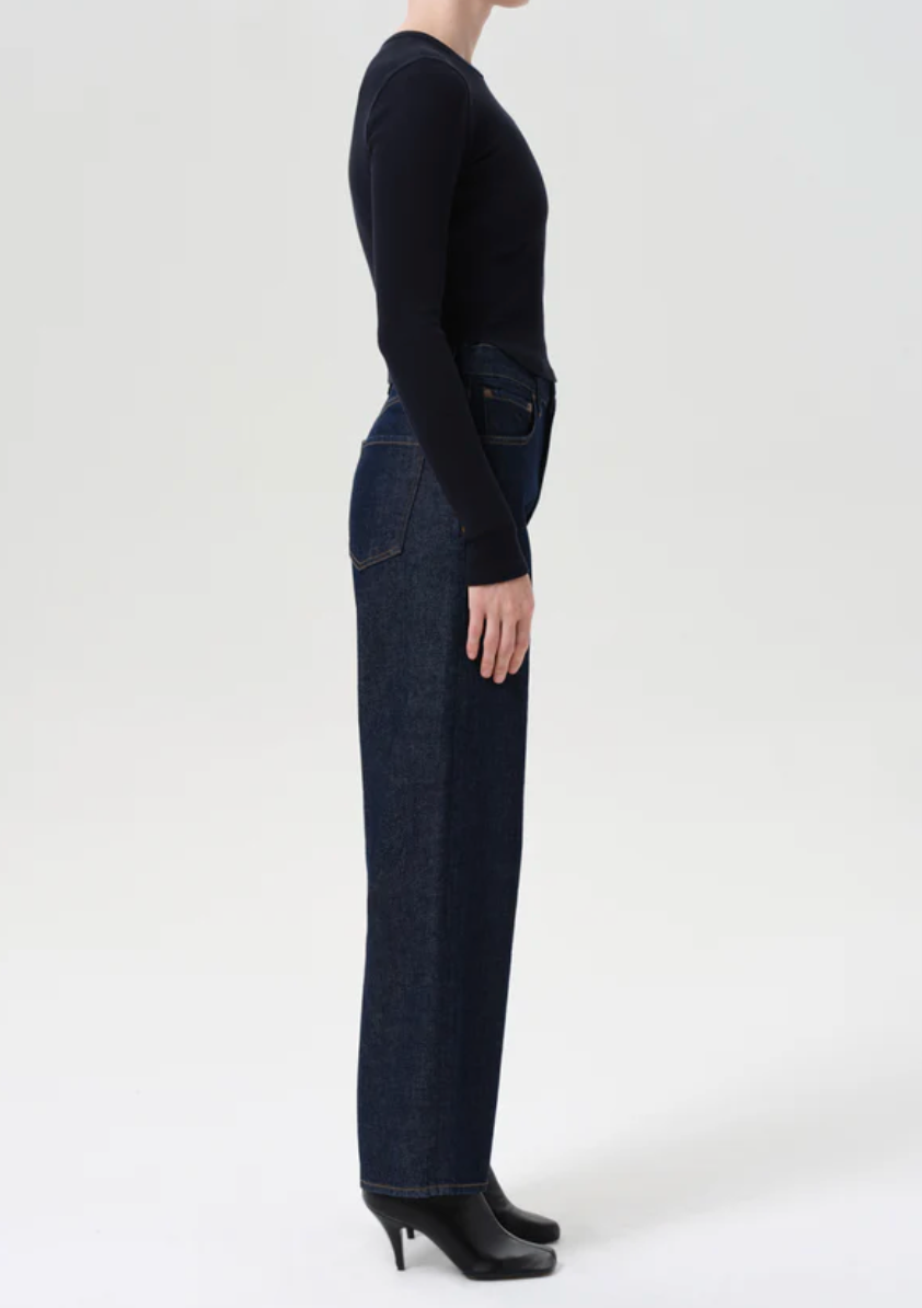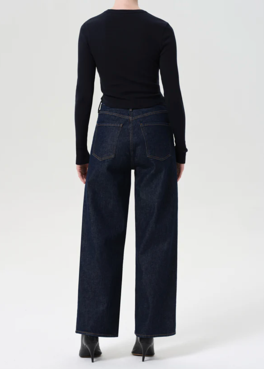 AGOLDE's Ren jeans are crafted with EcoMade Fiber, combining regeneratively grown cotton, Eco-Indigo dye, and plant-based LYCRA® EcoMade Fiber to set a new standard for sustainable denim. Offering a relaxed fit with a high-rise waist and cropped wide legs, these jeans are perfect for casual days. Pair them with a half-tucked tee or sleek bodysuit for an effortlessly chic look.