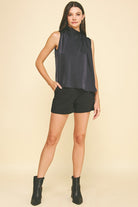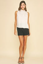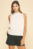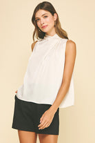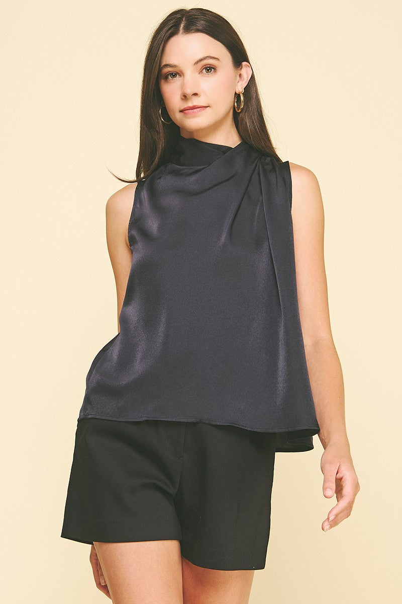 - High neck with gathered detail