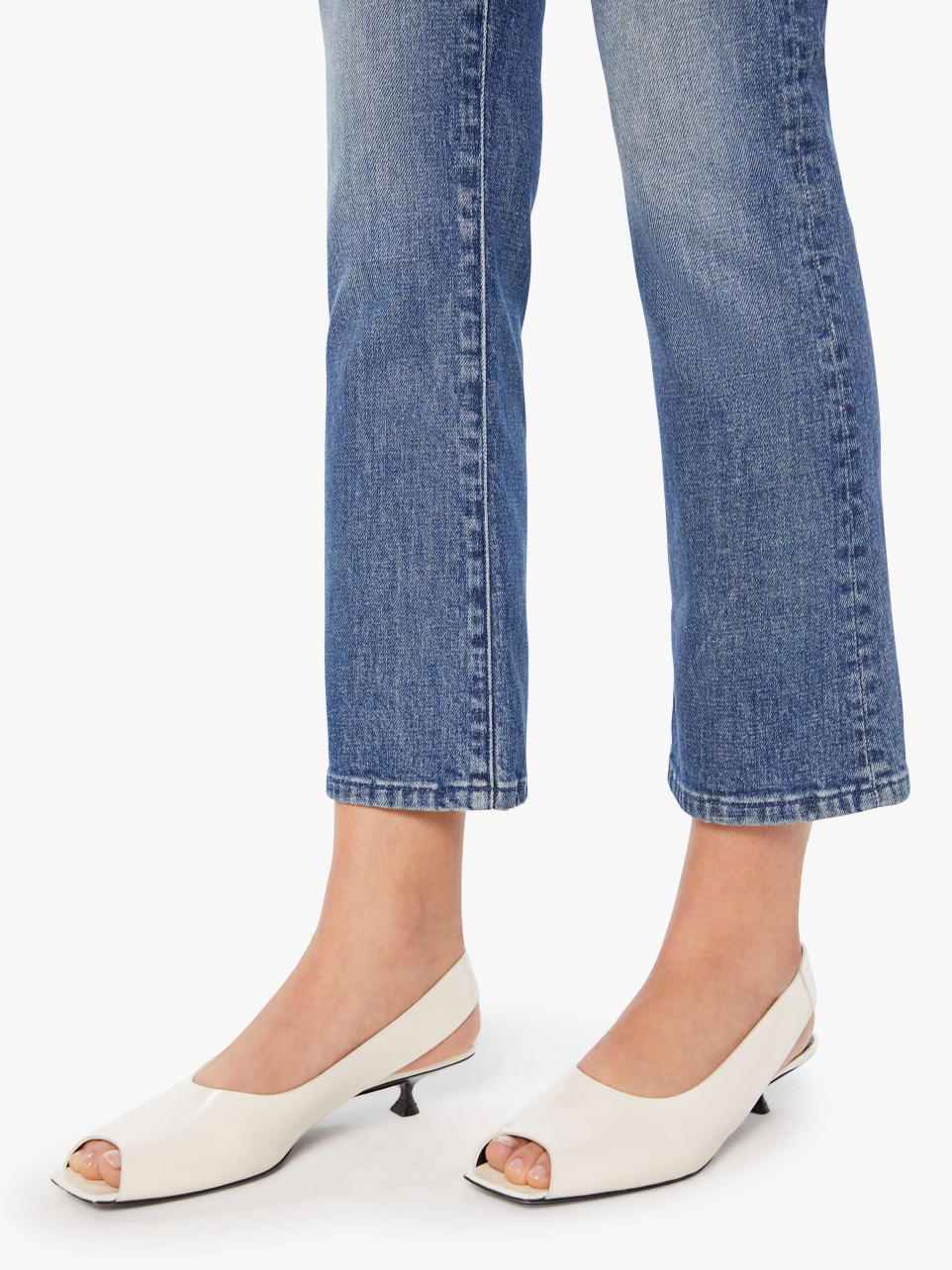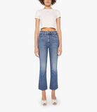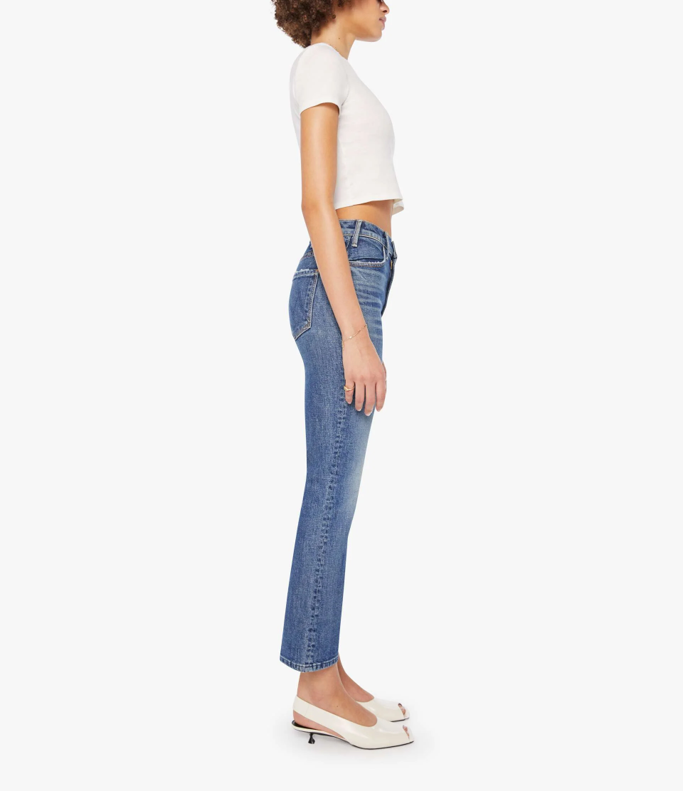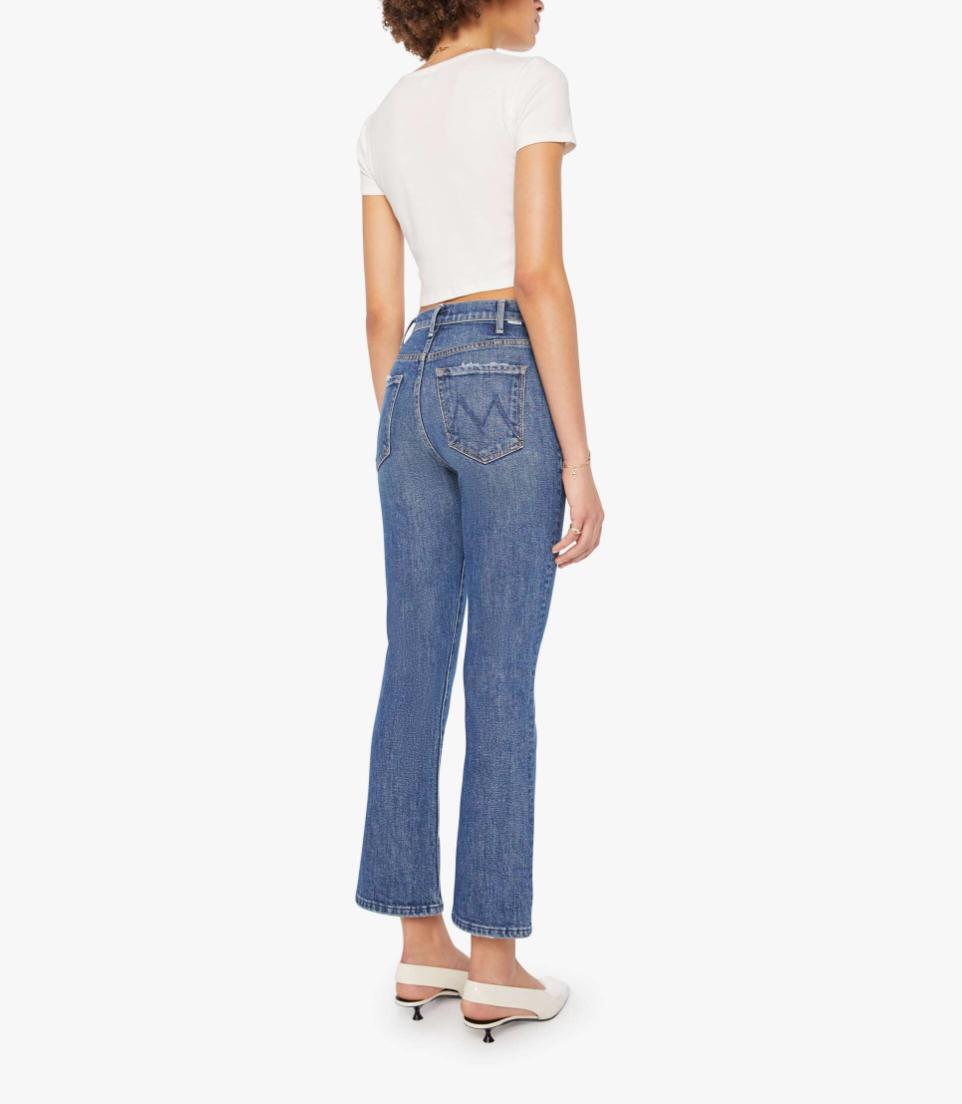 MOTHER makes the rules. This bestselling high-rise flare has a zip fly, ankle-length inseam and a clean hem. Crafted from semi-rigid denim, Bending The Rules is a mid-blue with whiskering and fading at the knees.