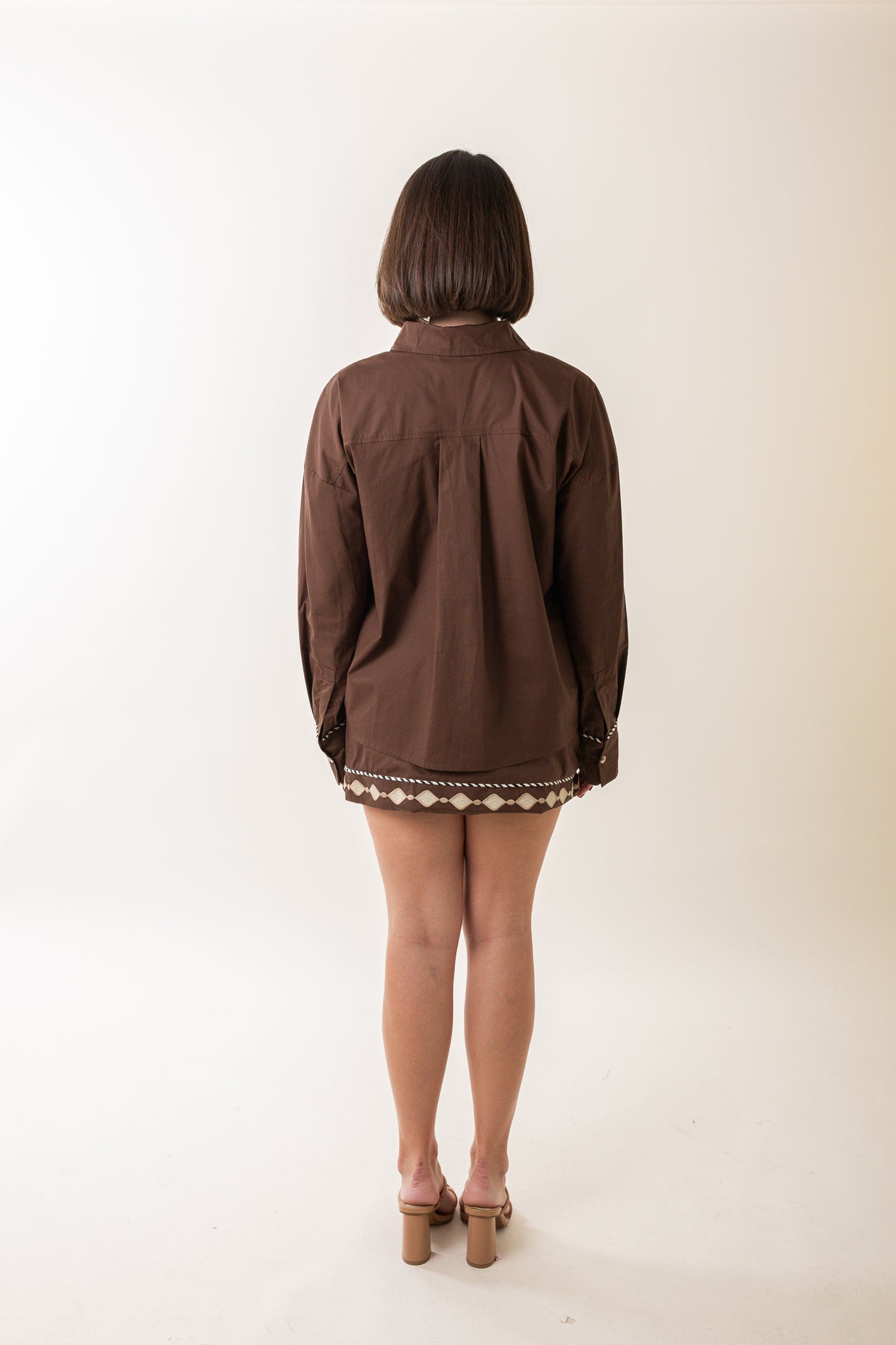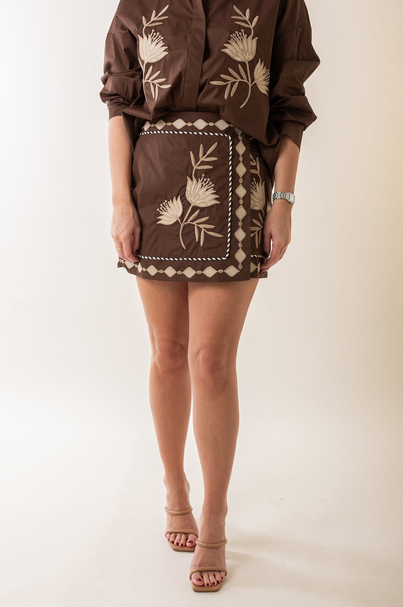 Embroidered Button Shirt And Mini Skirt Set