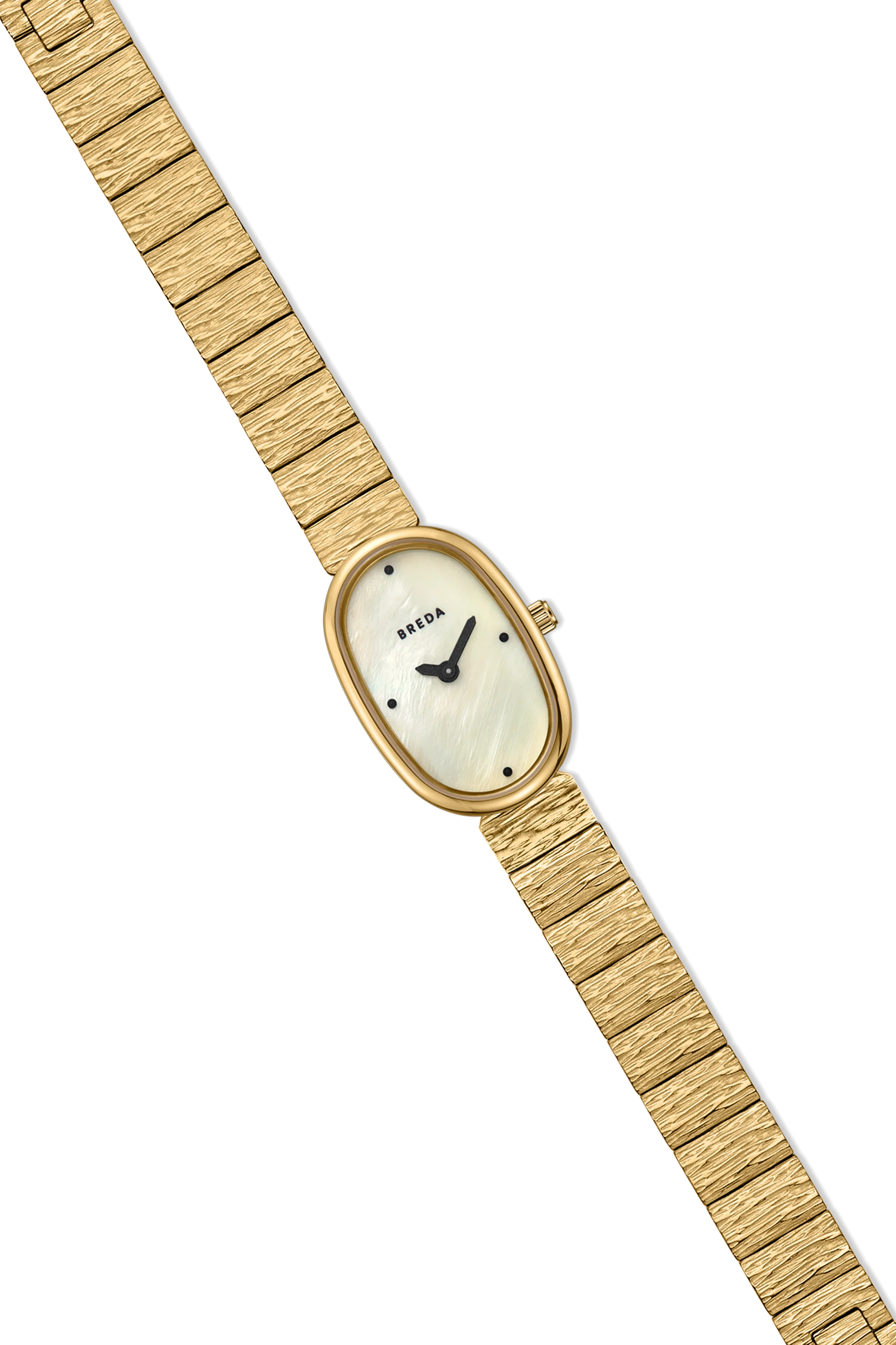 The Revival collection serves as a powerful reminder of our inherent ability to shape-shift, to reinvent ourselves, and to pivot towards higher purpose guided by instinct. The Jane (Revival) carries a delicate oval 18mm case, champagne colored mother of pearl dial and an intricately textured bracelet etched in a deep, 18K gold plating that fastens with a jewelry clasp.