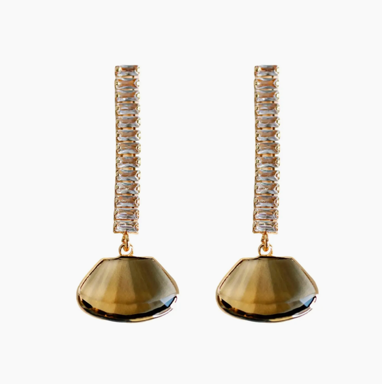 These exquisite 2.5" drop Fall statement earrings feature a delicate string of interlocking rhinestones leading to a rich faux brown gemstone. The delicate sway of these earrings adds a touch of glamour and sophistication to any ensemble, making them a perfect choice for holiday parties.