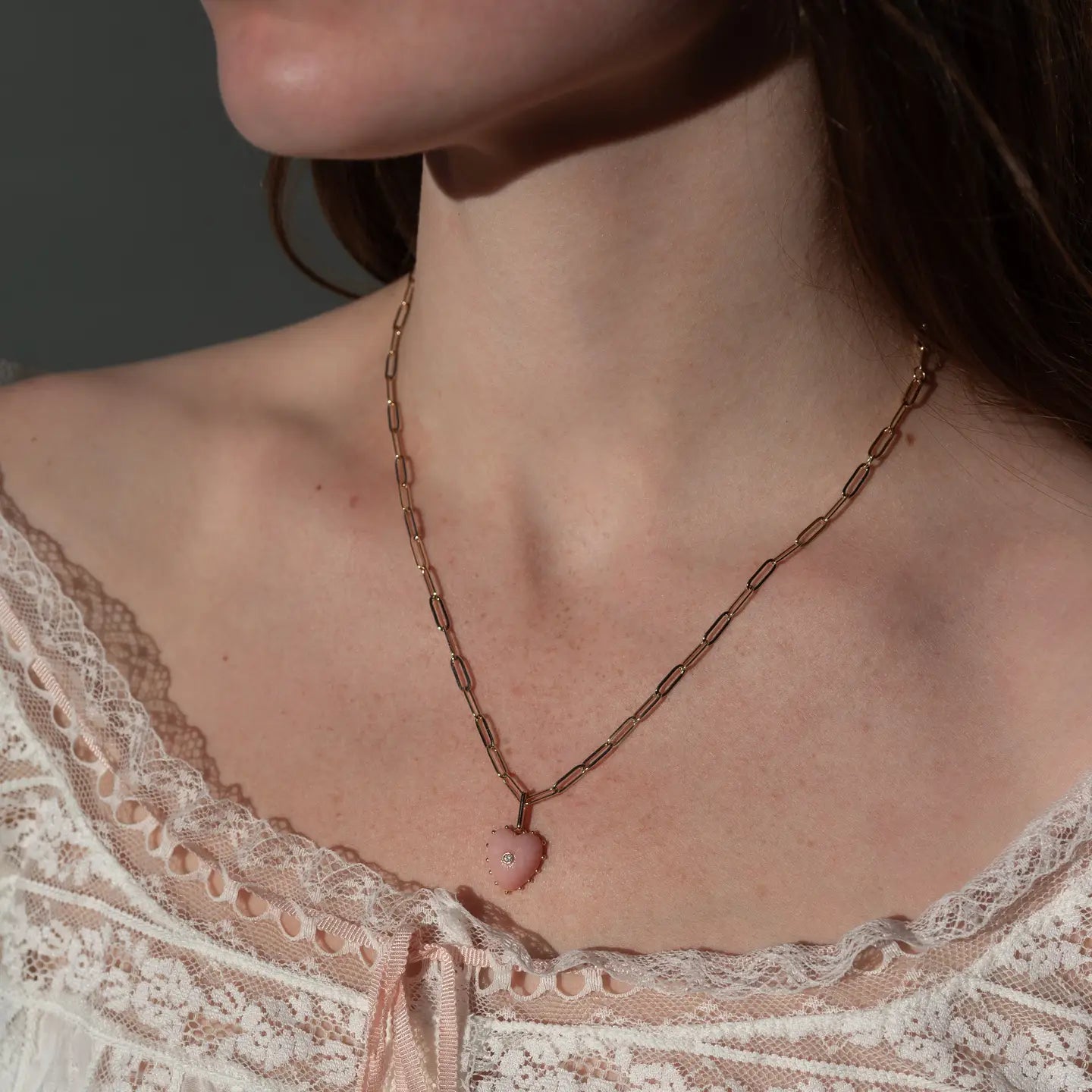 She's Malene's baby sister, a smaller hand-carved pink opal heart with a sparkling center stone. A favorite for gifting and layering.