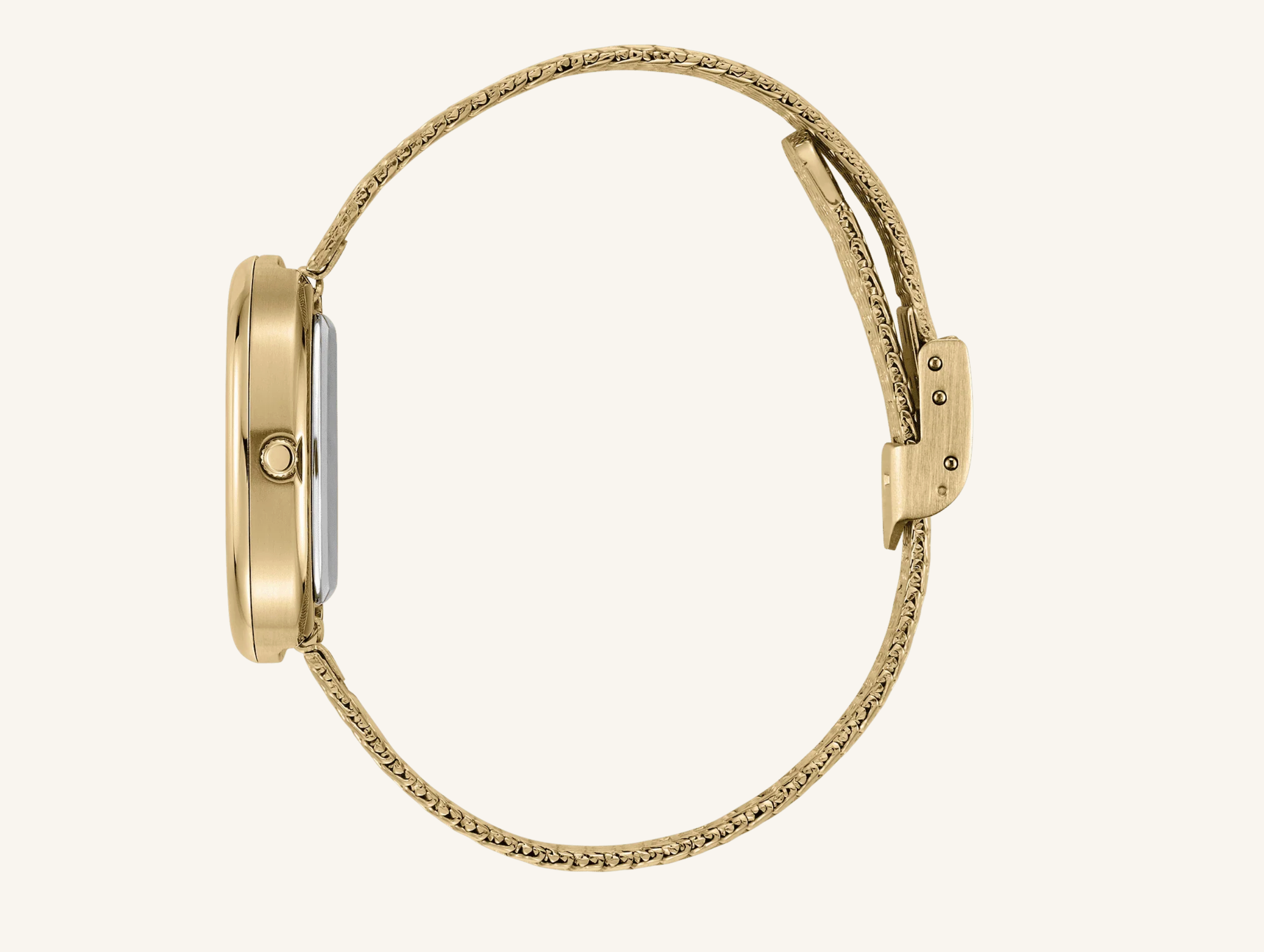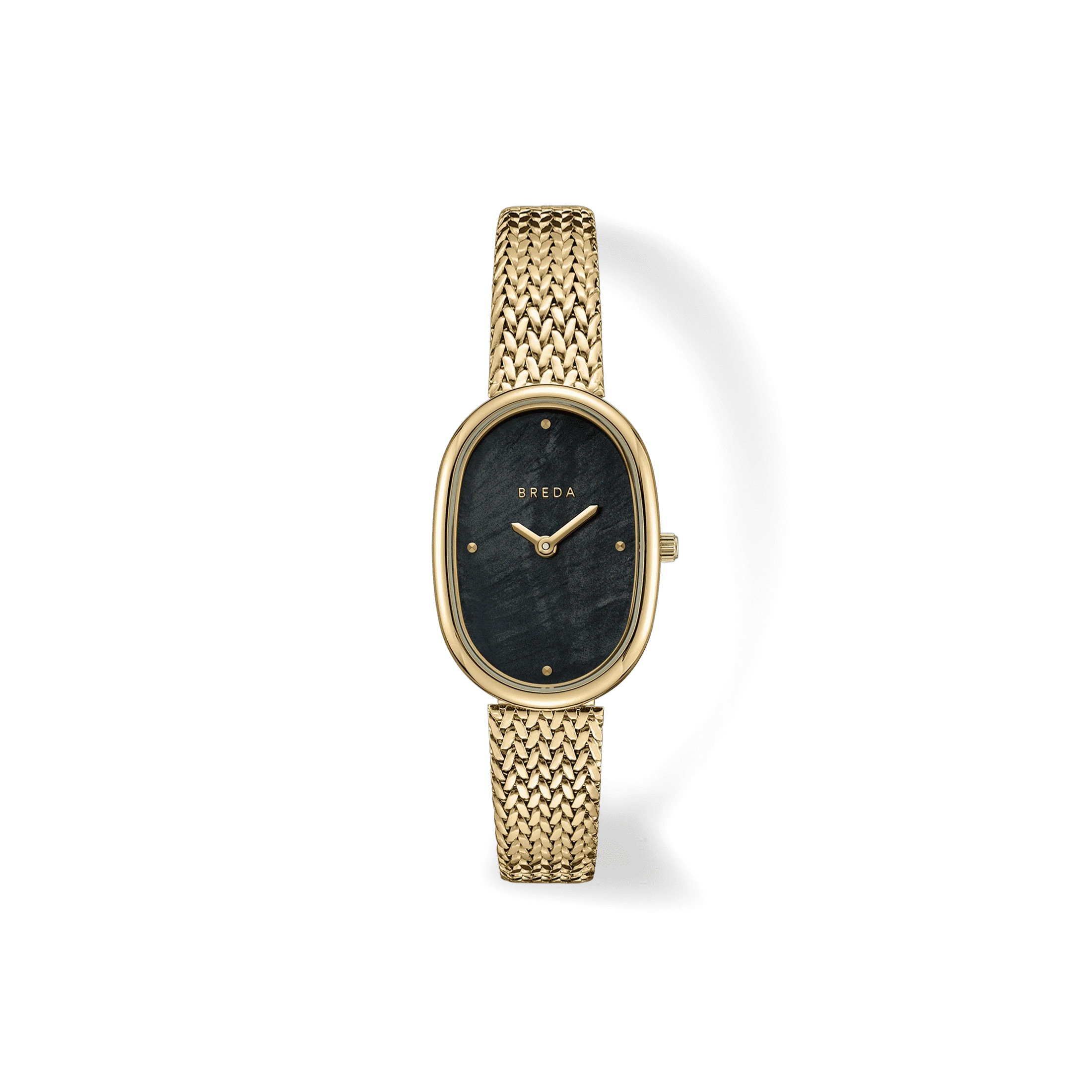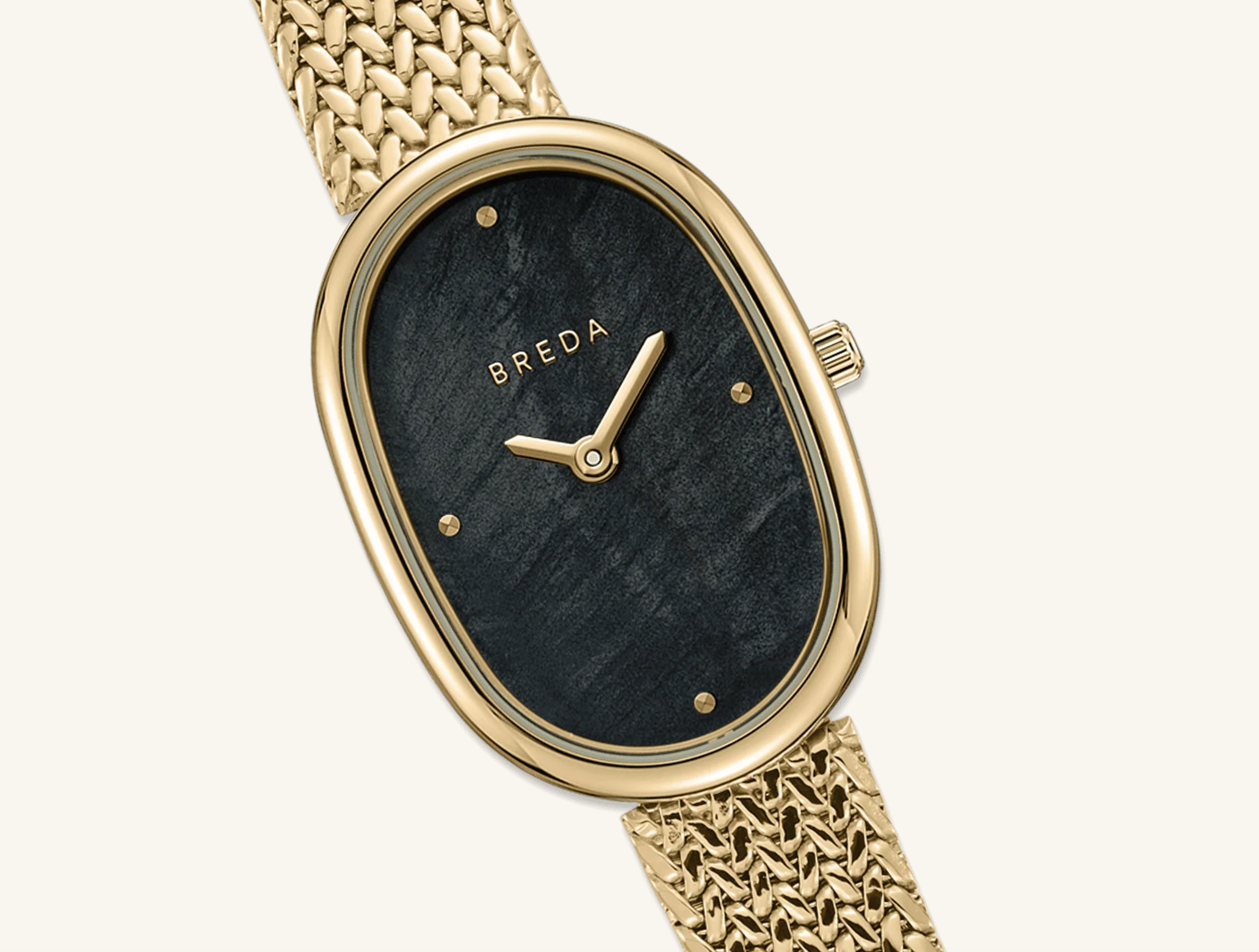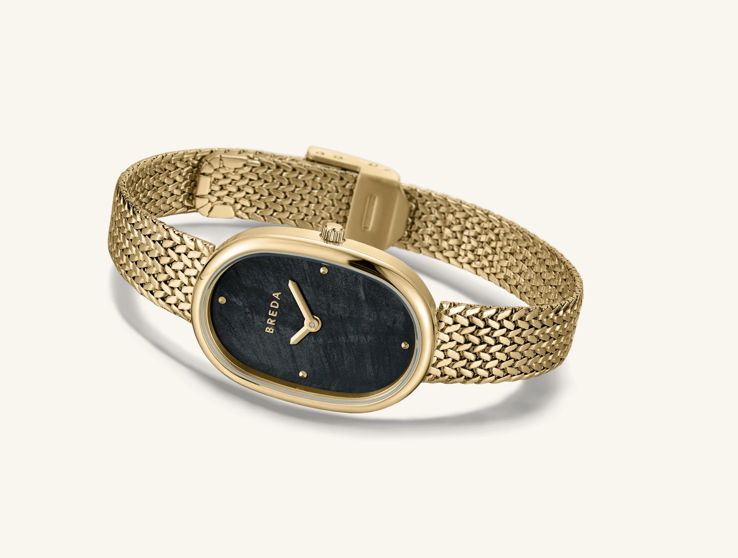 The Tethered collection exists as a daily reminder of our human connection and our shared memories intertwined, endlessly collapsing together. The Jane (Tethered) carries a delicate 23mm oval case, black mother of pearl dial and a tapered woven mesh bracelet that fastens with a quick release clasp.