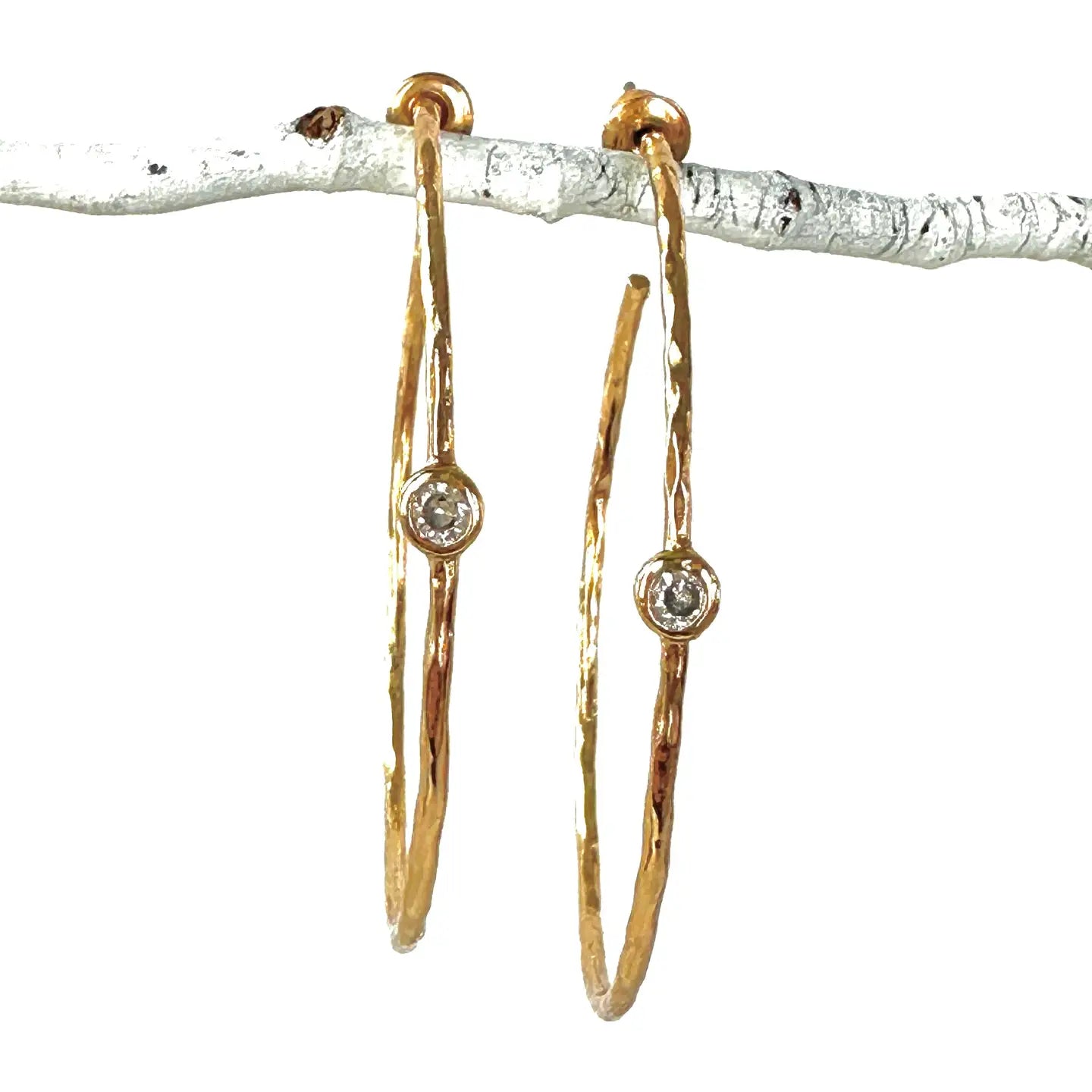 Discover the captivating allure of our Single CZ Hoops. These 2" gold-plated, hammered hoops from CV Designs reflect a modern, classic, and timeless aesthetic. Inspired by a love for fashion and a balanced life, these earrings embody simplicity and elegance. Handmade in our Atlanta, Georgia studio, they're a testament to over 22 years of dedicated craftsmanship. Enjoy these hoops as they bring a touch of charm to your ensemble.