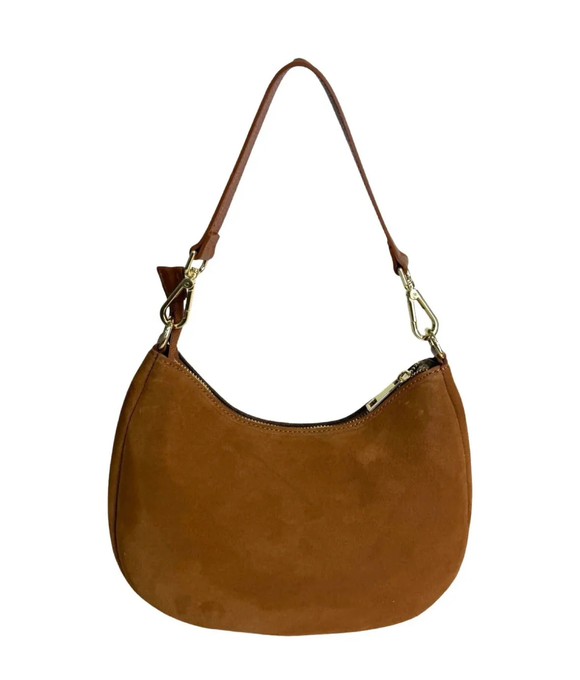 Half moon suede handbag with clean minimalist design with single short shoulder strap also comes with crossbody strap