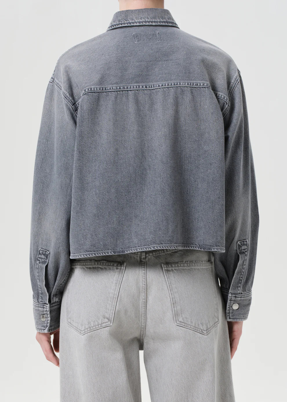 - Looks Like: Medium grey button front denim shirt