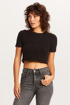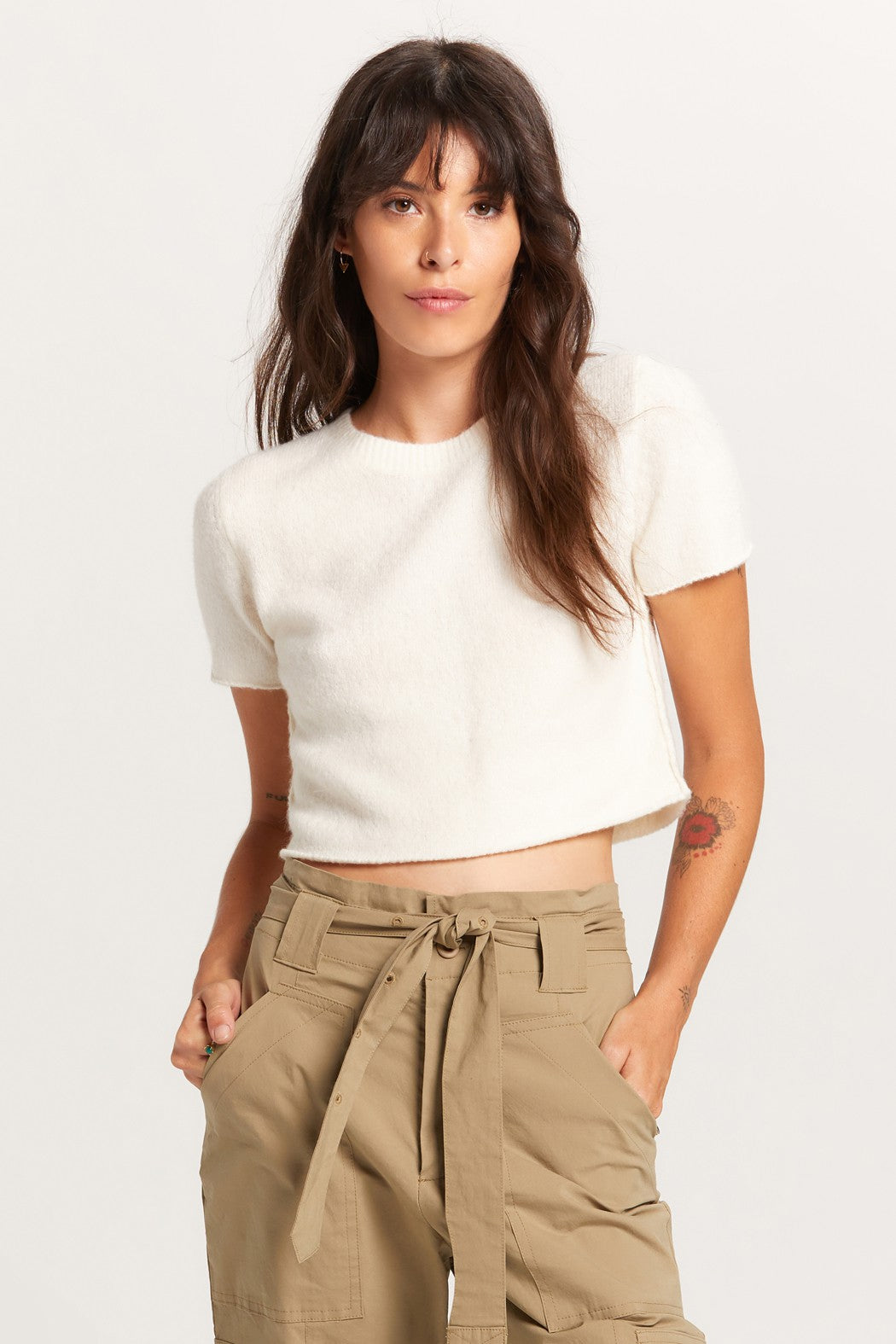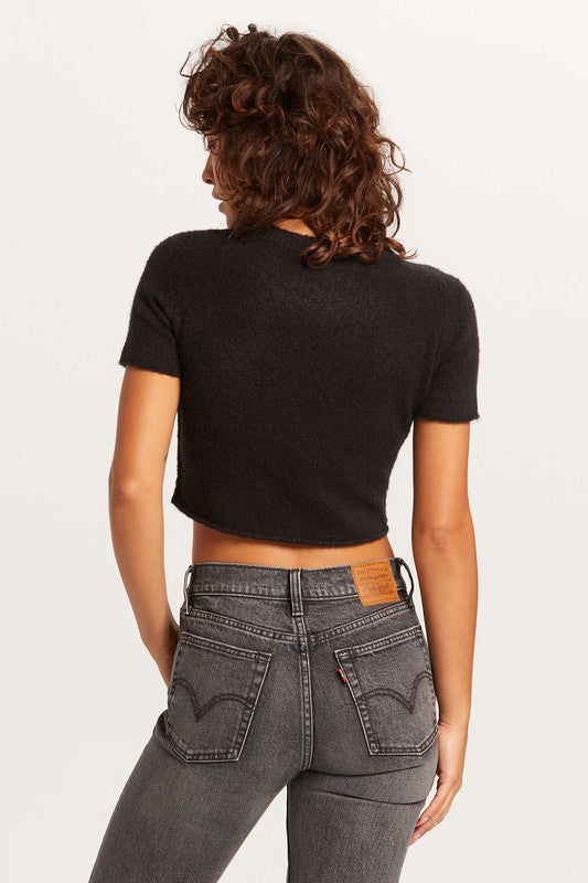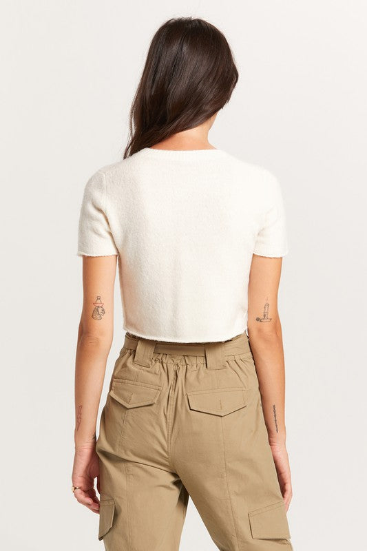 Our Fuzzy Cropped Sweater features a crew neck and relaxed fit.