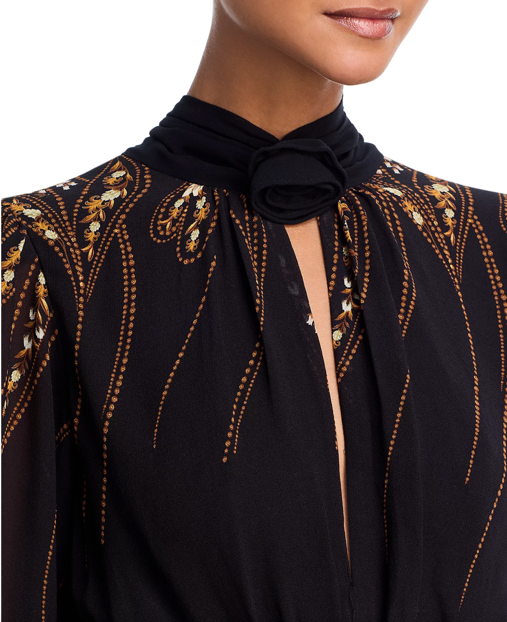 - High neck with rosette trim