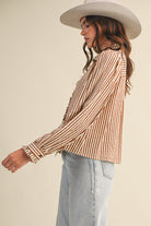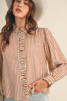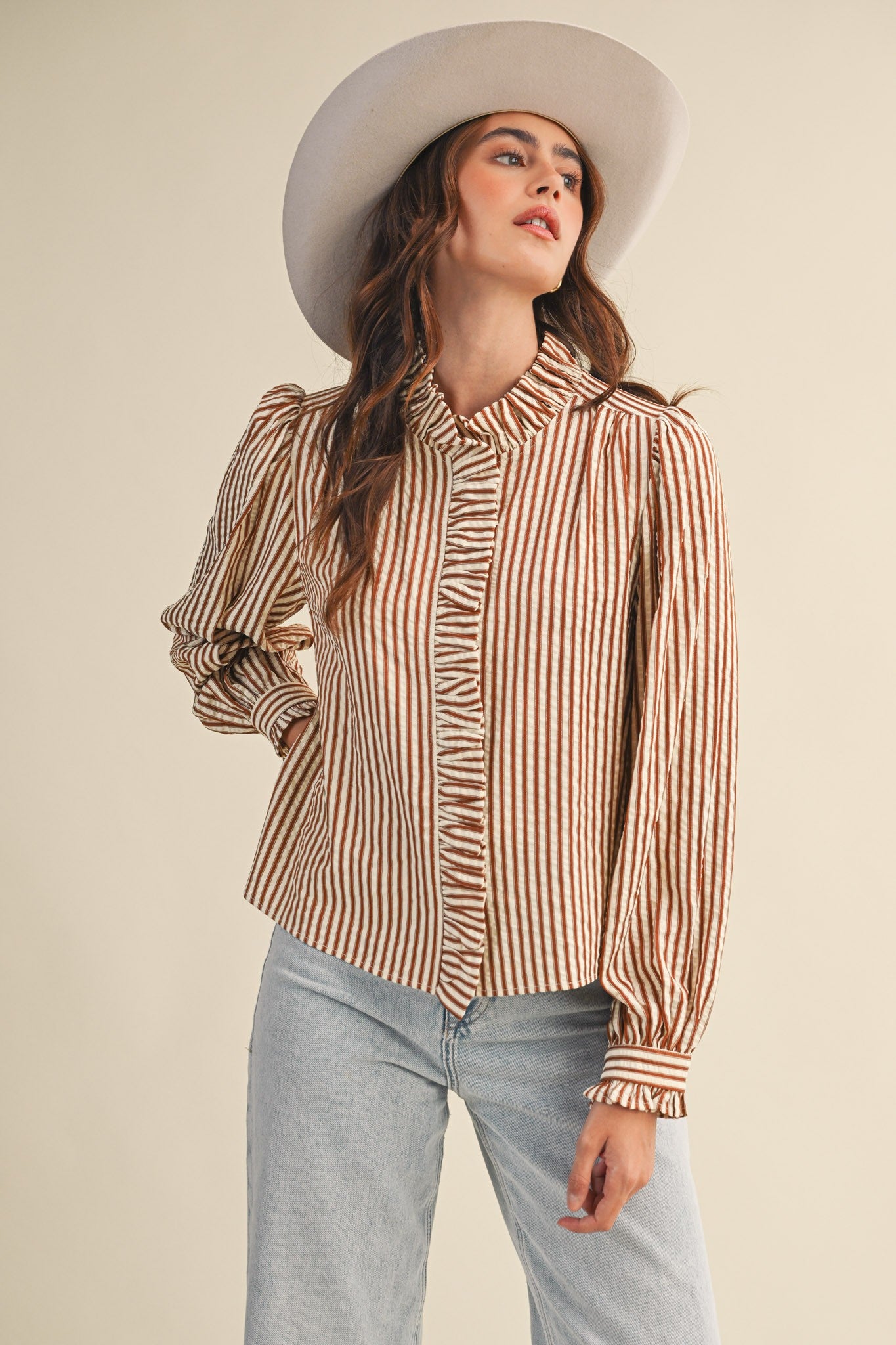 Pecan Striped Ruffled Button Down Long Sleeve Top