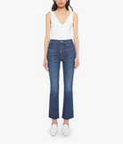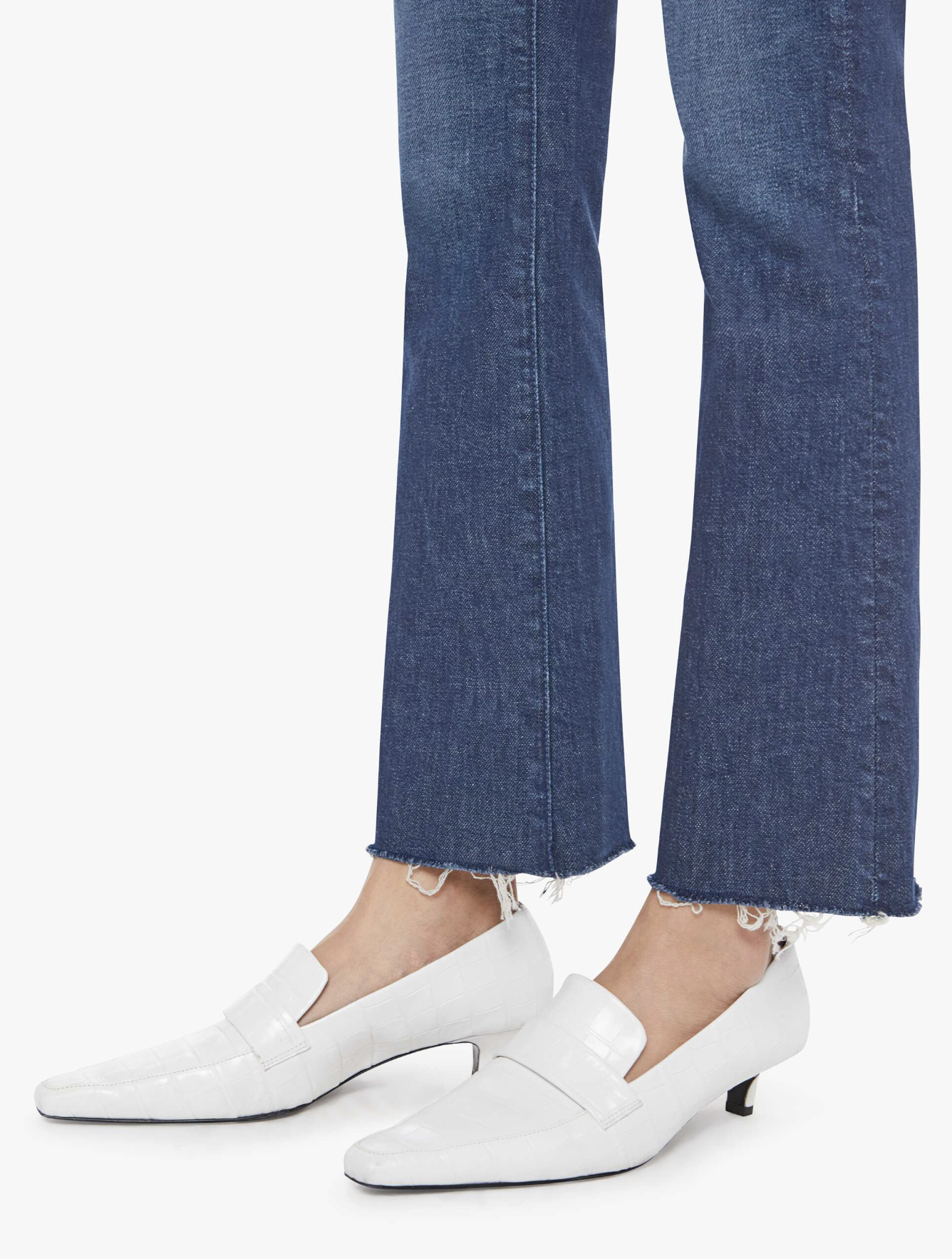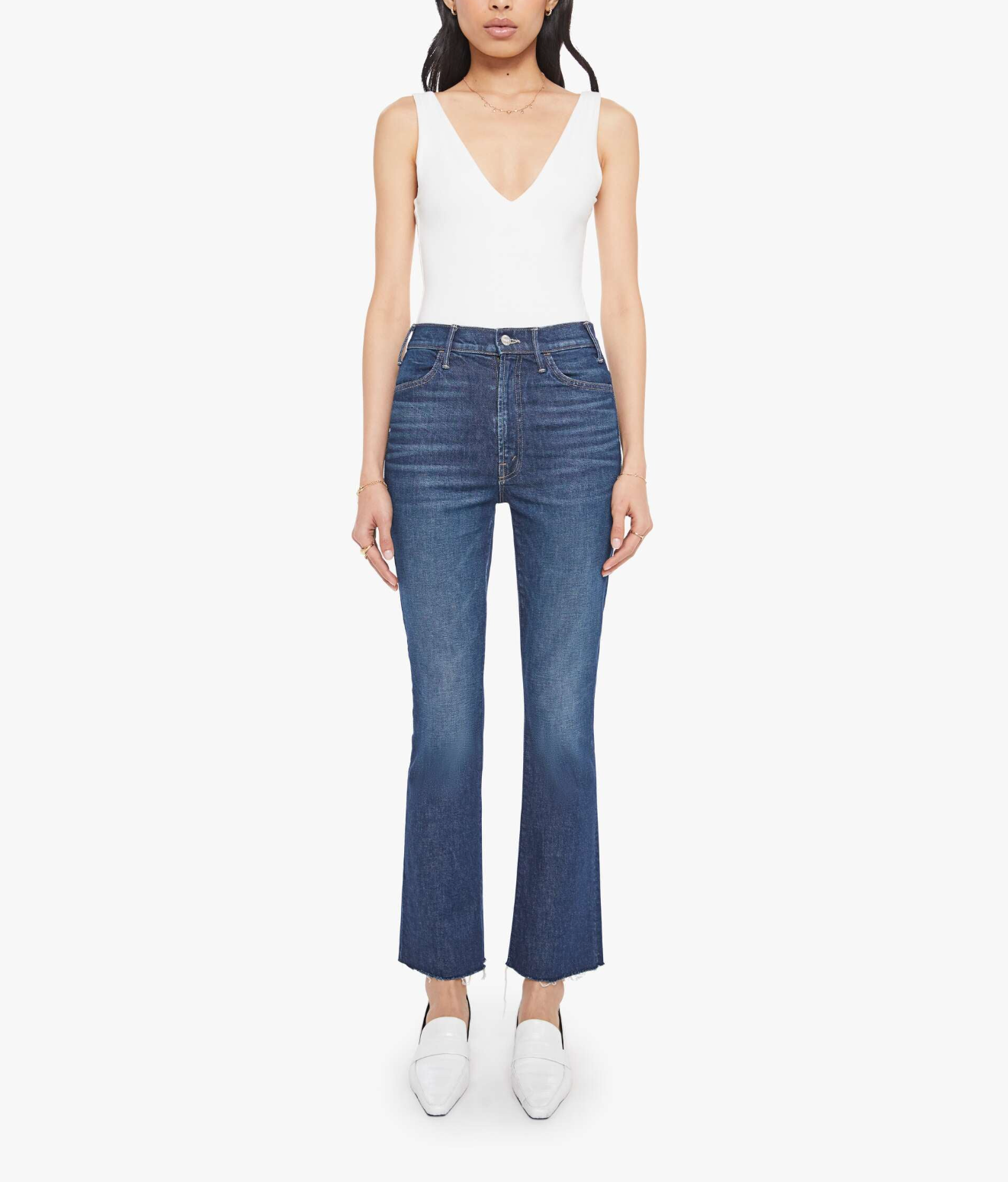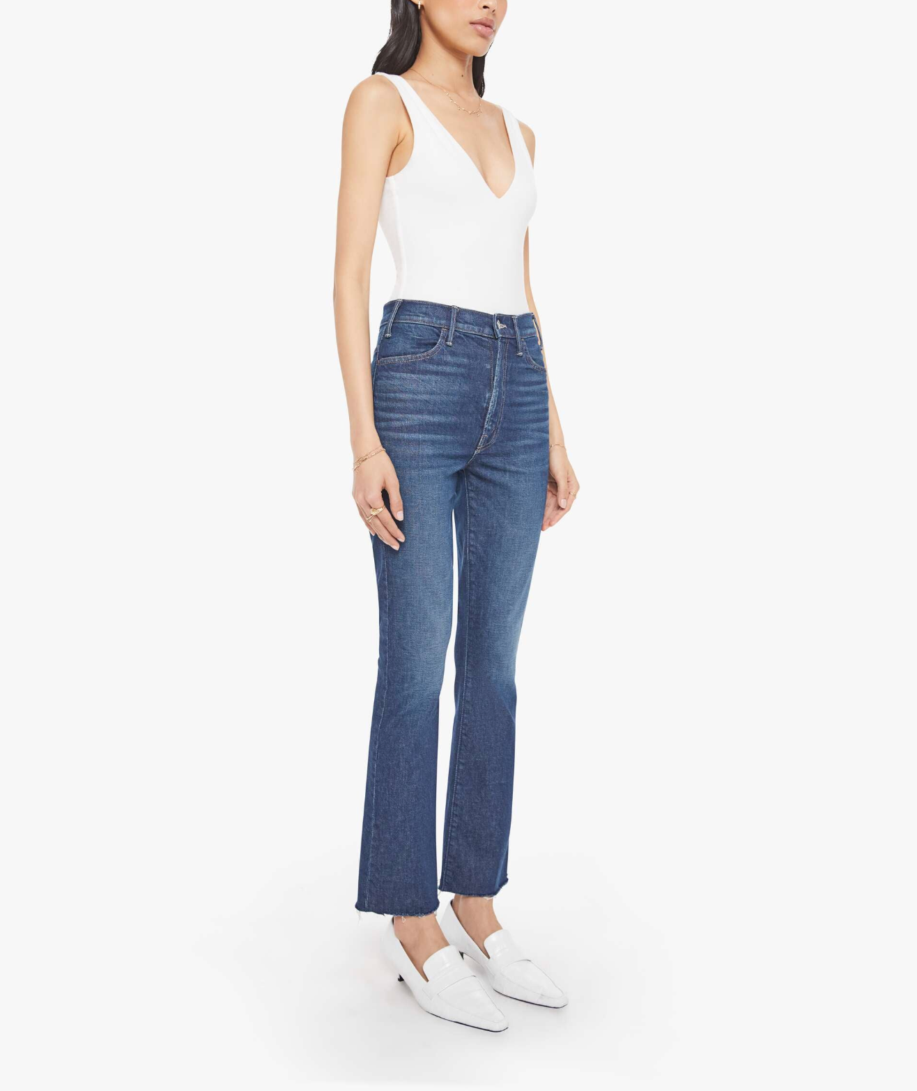 Amped up. This high-rise flare has a zip fly, 28.25-inch inseam and a frayed hem. Made from semi-rigid SUPERIOR denim, Kicks And Riffs is a dark blue with subtle fading and whiskering.