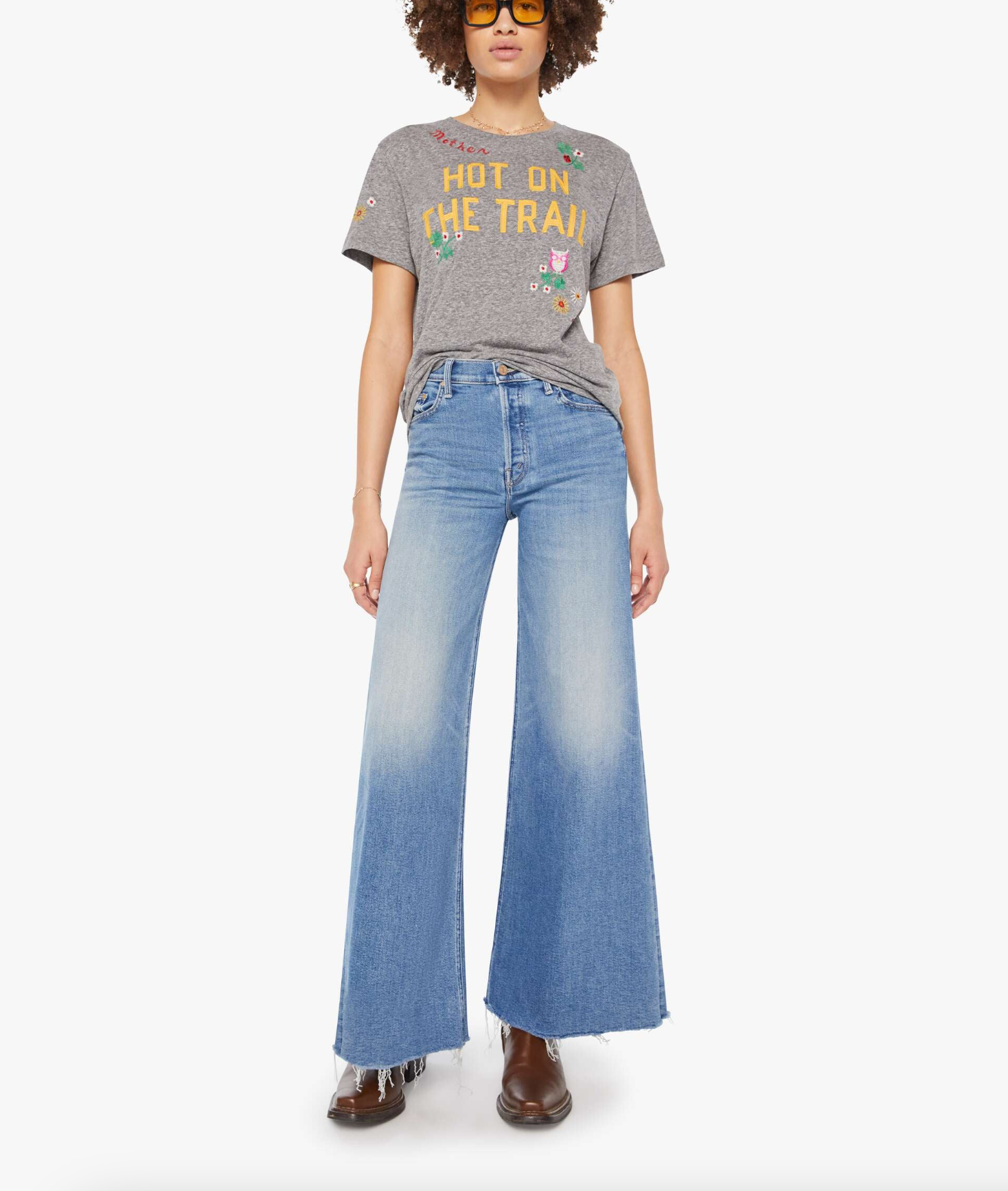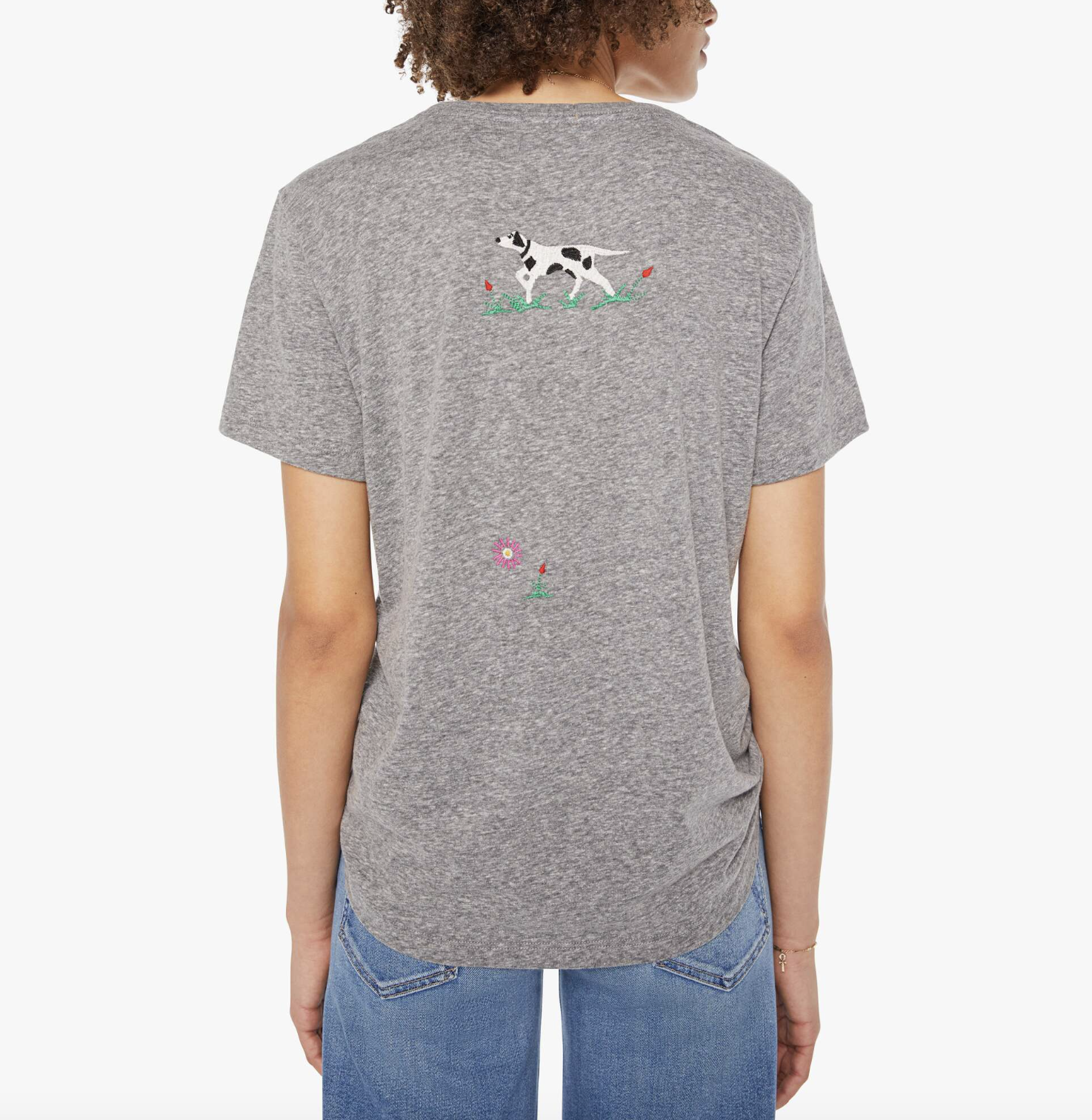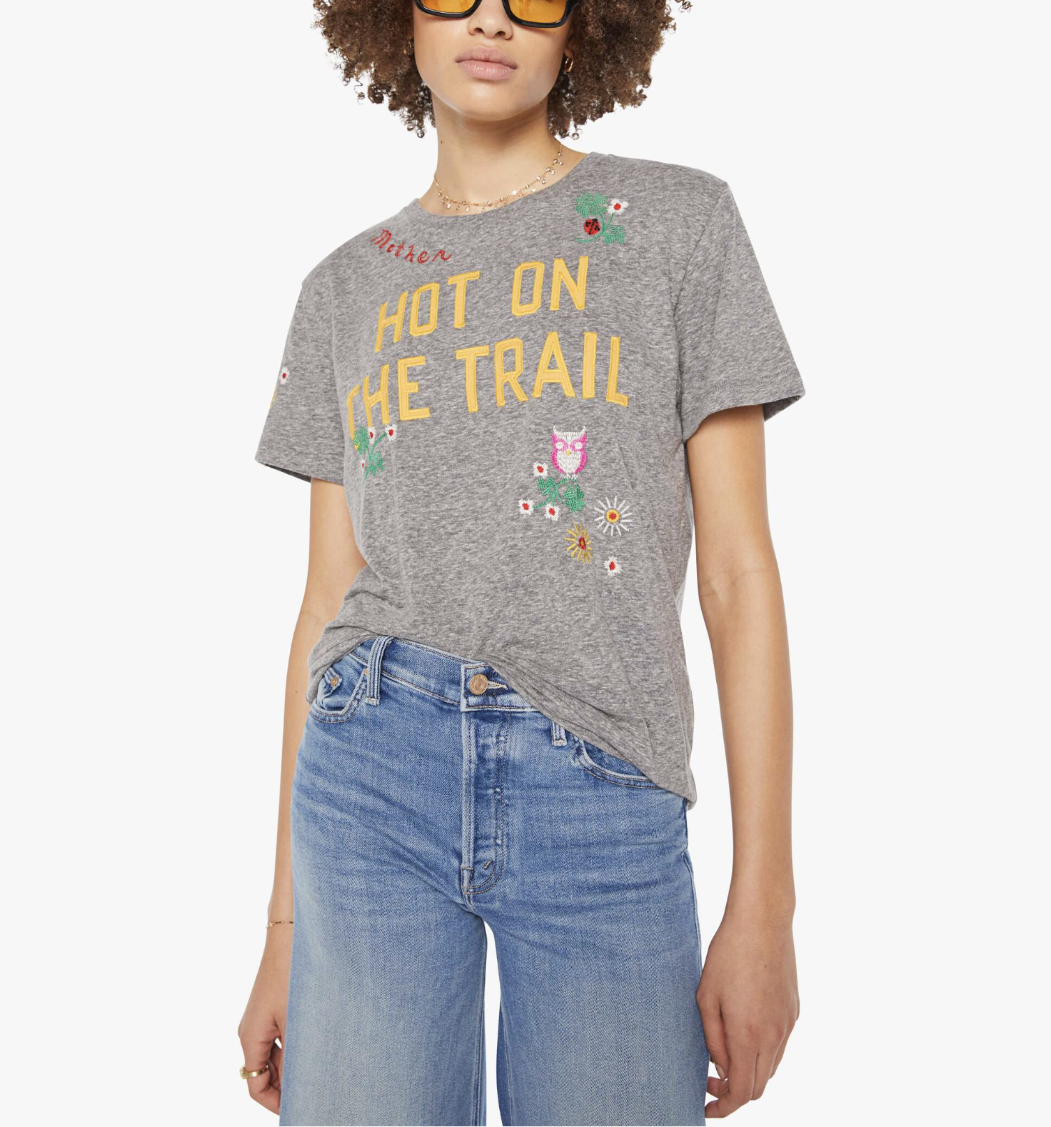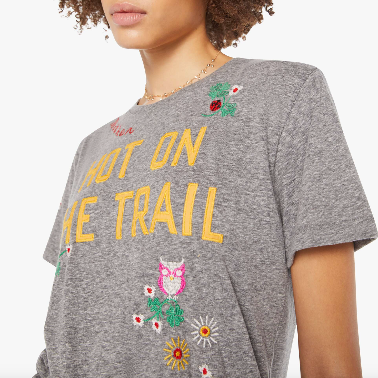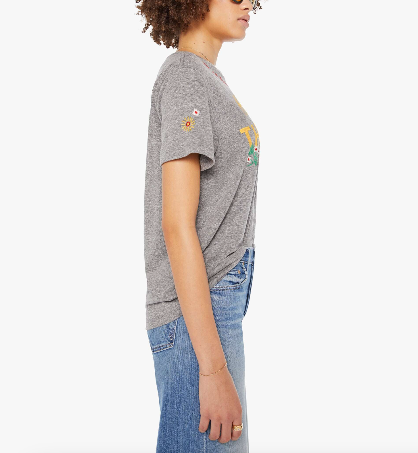 Run don't walk. A crewneck tee with an oversized fit and a clean hem. Made from a cotton blend, the heathered grey tee features yellow block text on the front and colorful embroidery throughout.