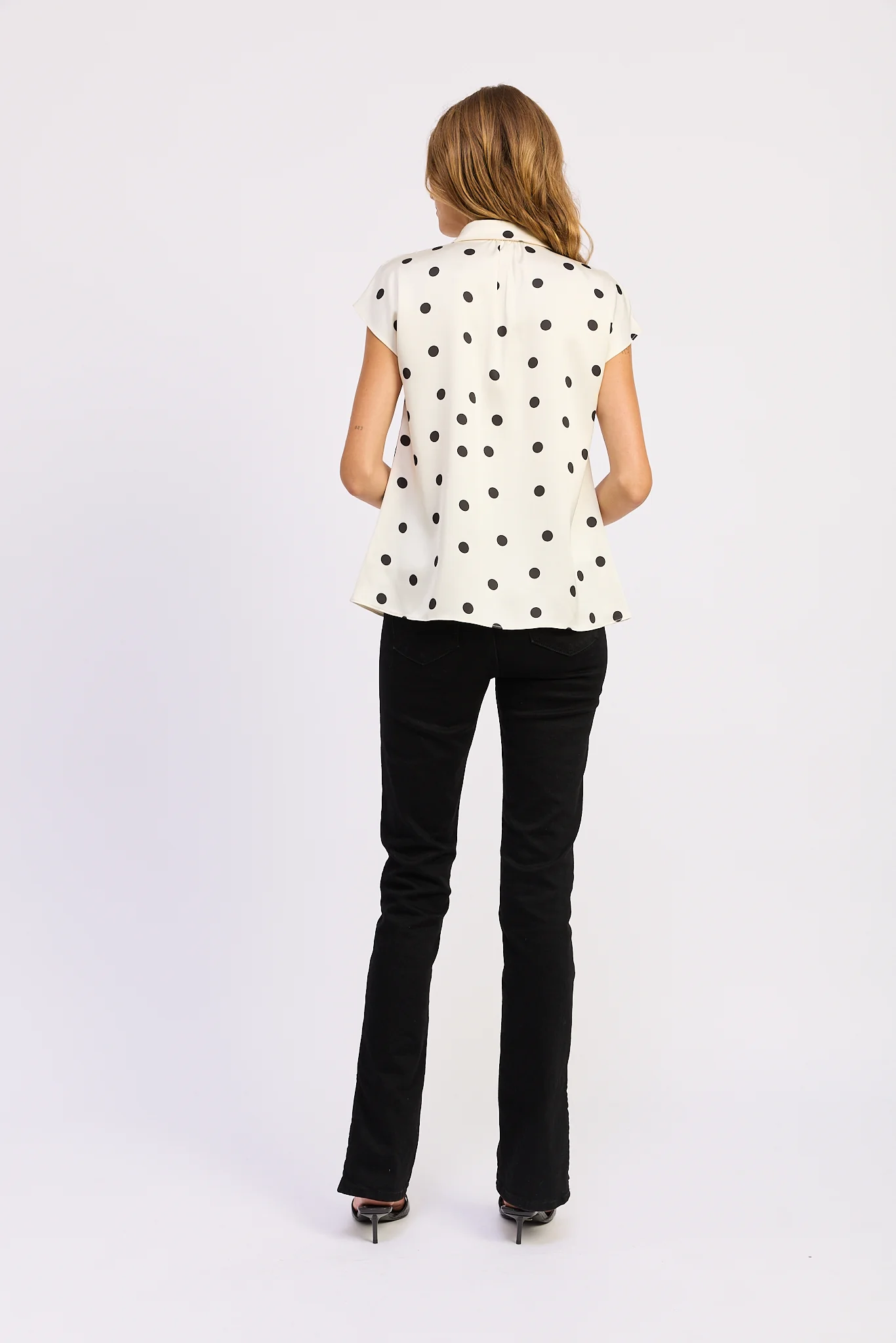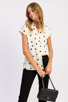 The Abigail Button Down Shirt is the perfect dressy casual blouse. Dressed up with a skirt, or down with blue jeans, the polka dot details are classic- making it a closet staple!