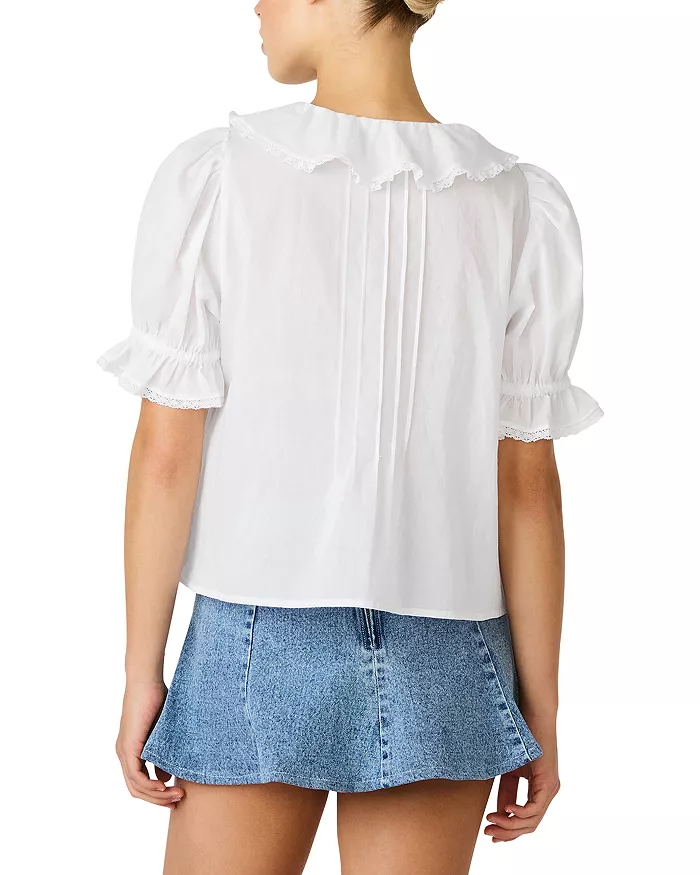 The Lyric Top is a romantic blouse featuring intricate lace-trimmed ruffles, delicate puff sleeves, and crisp pintuck details. This breathable, breezy top is designed for a feminine, charming aesthetic with a V-neckline and short sleeves.