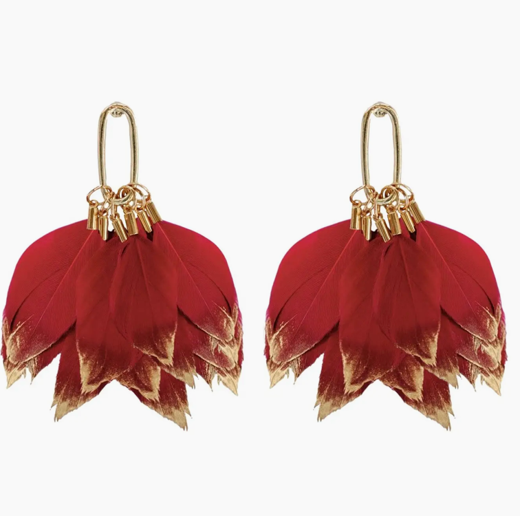New for 2023, we present the newest addition to our fall feather statement earring family! Our hand-selected garnet feathers are dipped in gold accent then combined with gold hardware for a touch of stunning glamour! The lightweight design ensures comfortable wear while the approximately 2.5-inch length adds an elegant touch!
