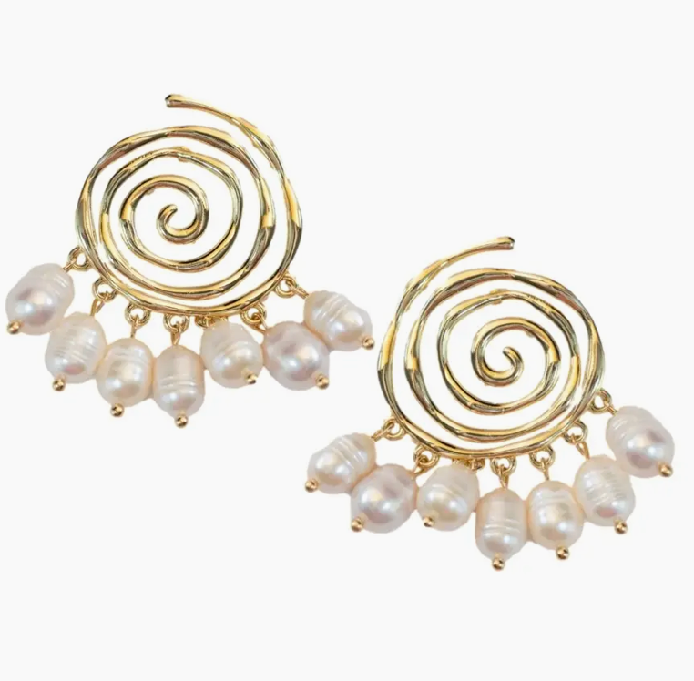 These ocean-inspired gold-plated brass earrings feature a sleek gold swirl design paired with genuine natural-shaped pearls. The gold and white combination effortlessly complements all summer outfits, from vibrant prints to monochromatic linens. At 1.75”, the earrings are a bold statement without being too oversized.