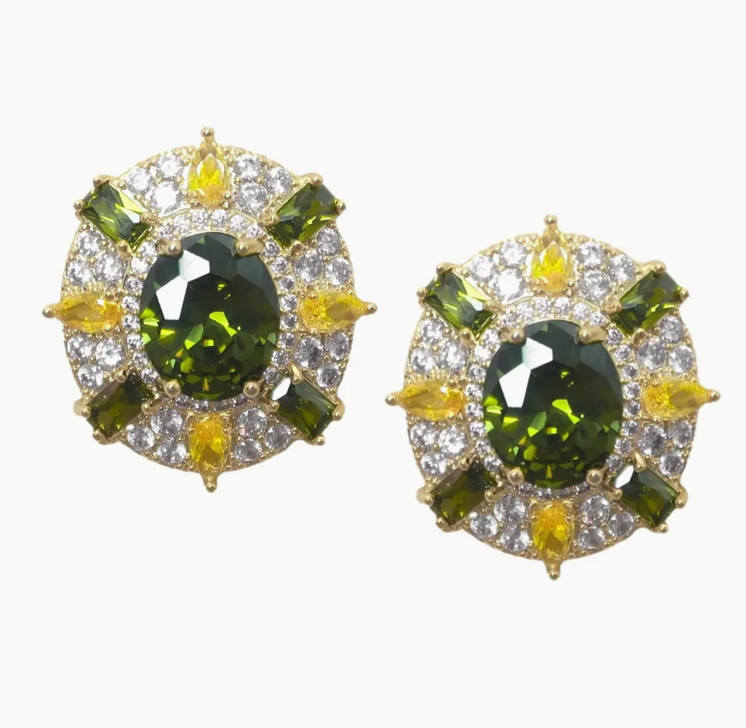 These fall-forward statement earrings feature a smooth canary yellow oval stone layered over a rich olive-toned crystal base. At 1" long, they’re bold yet refined—perfect for adding seasonal color to both fall looks and sunny resort wear.