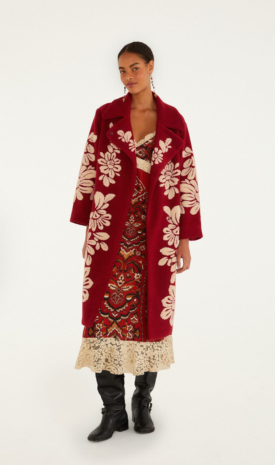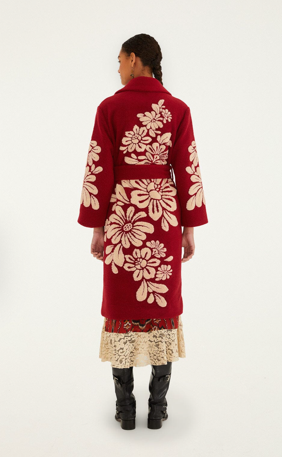 Wrap yourself in the cozy charm of the Burgundy Bold Flowers Fleece. This standout outerwear piece features a rich burgundy base adorned with large, playful cream floral motifs that dance across the fabric. Its relaxed silhouette and soft collar neckline invite warmth and ease, while the matching tie belt cinches the waist, adding a flattering shape. Perfect for bringing a touch of vibrant comfort to any day.