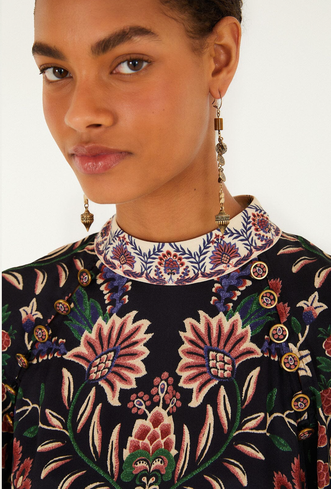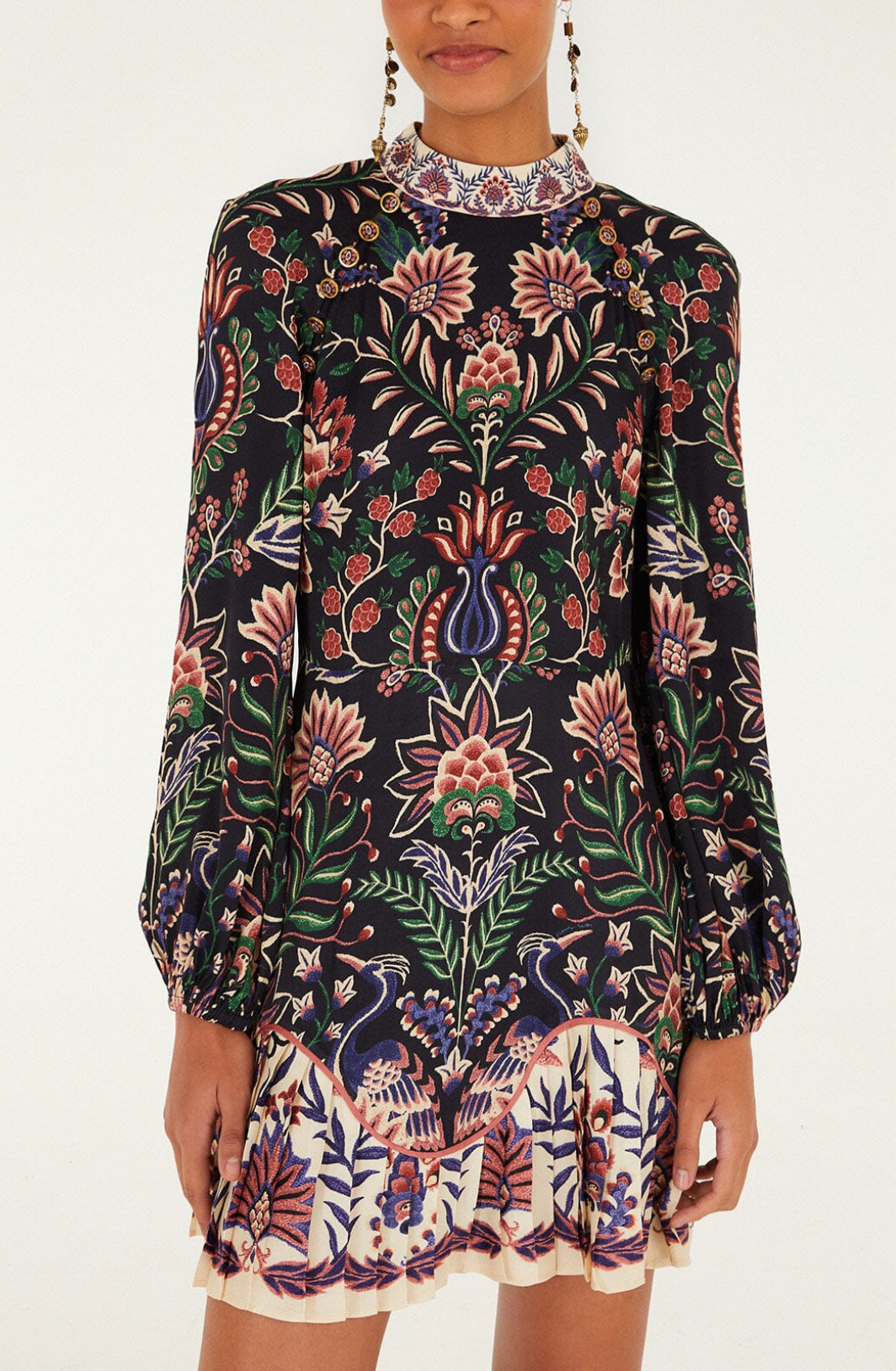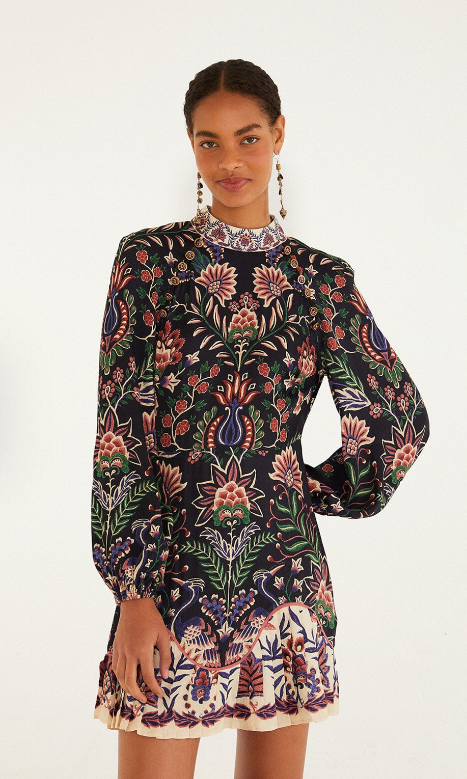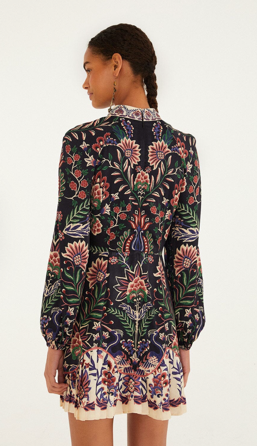 Embrace the enchanting allure of the Black Marvelous Garden mini dress, crafted from eco-responsible Lenzing Ecovero viscose. Its high neckline and softly gathered balloon sleeves frame a vibrant botanical print bursting with rich hues of green, pink, and blue. The flared silhouette ends in delicate pleats, adding graceful movement and a playful touch, while subtle gold ring details elevate its feminine charm with a warm, artful spirit.