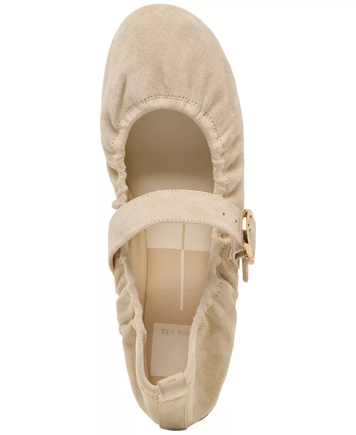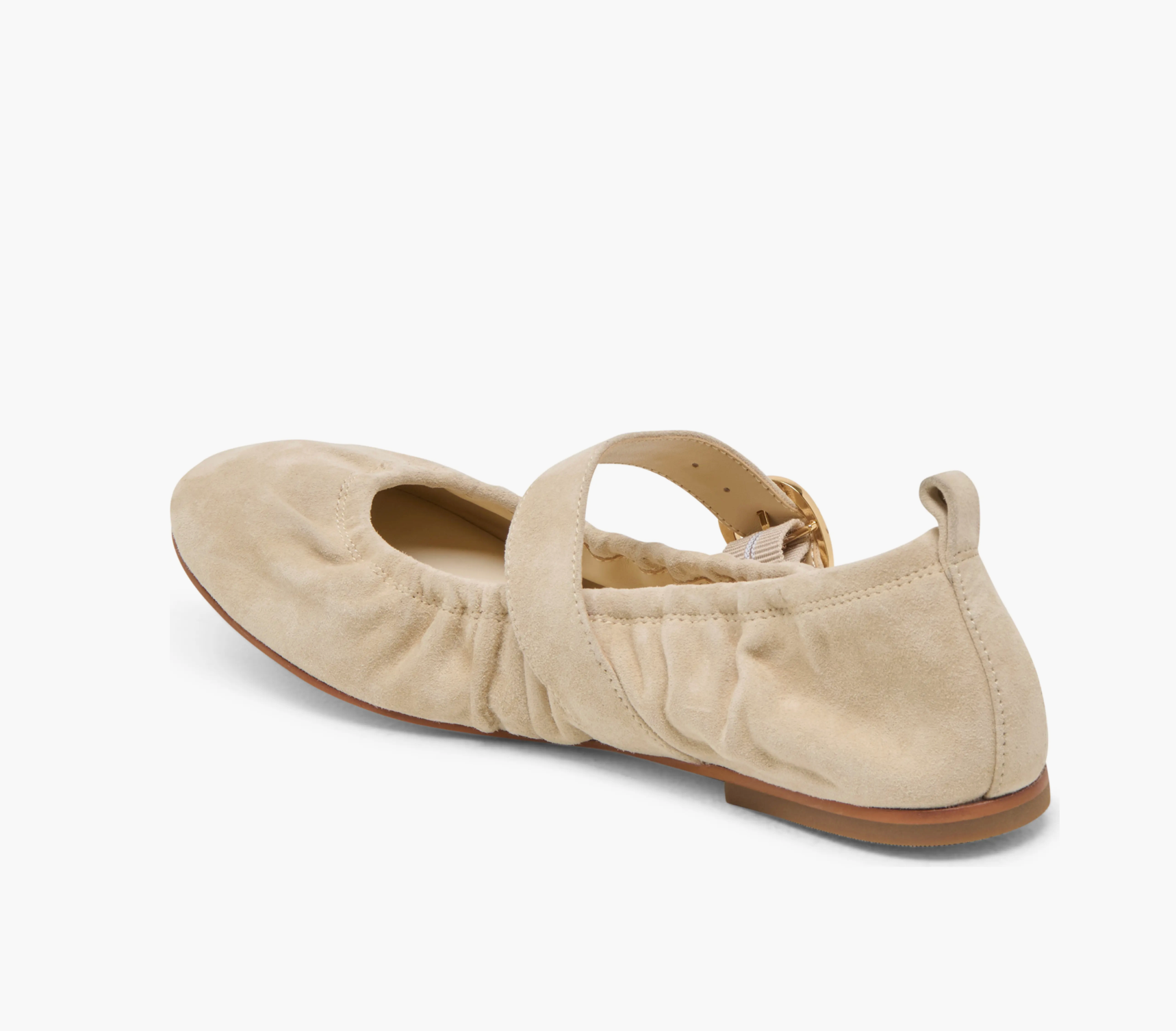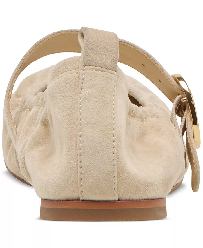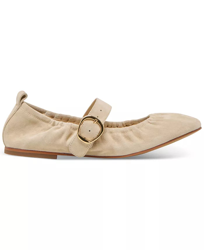 A geometric buckle makes a statement at the mary jane strap of a charming ballet flat designed with a gathered topline and flexible silhouette.