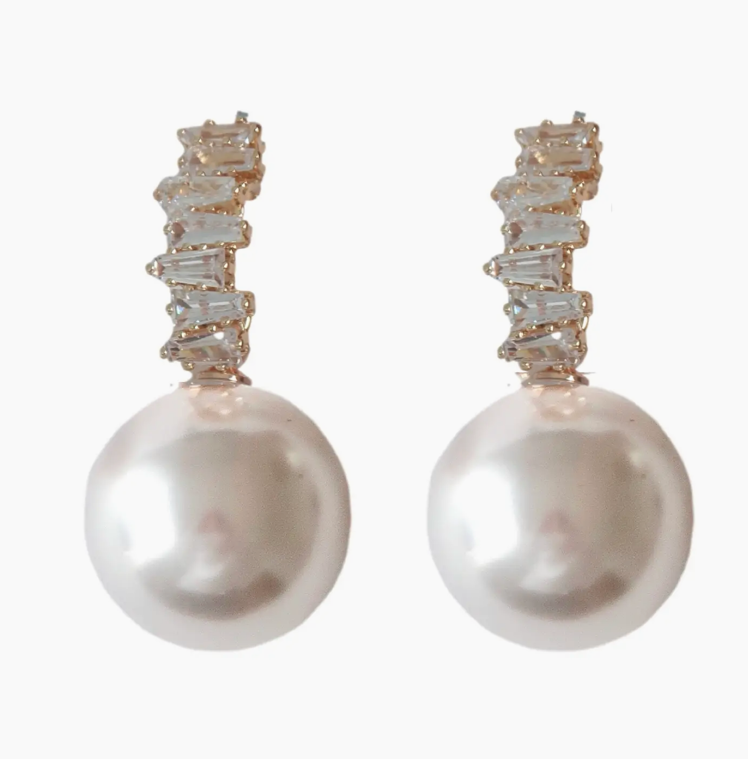 Elegant yet modern, these earrings feature a luminous faux pearl drop suspended from a vertical row of sparkling baguette-cut crystals. At 1” in length, the silhouette is refined and festive—perfect for Christmas parties, New Years Eve and weddings!