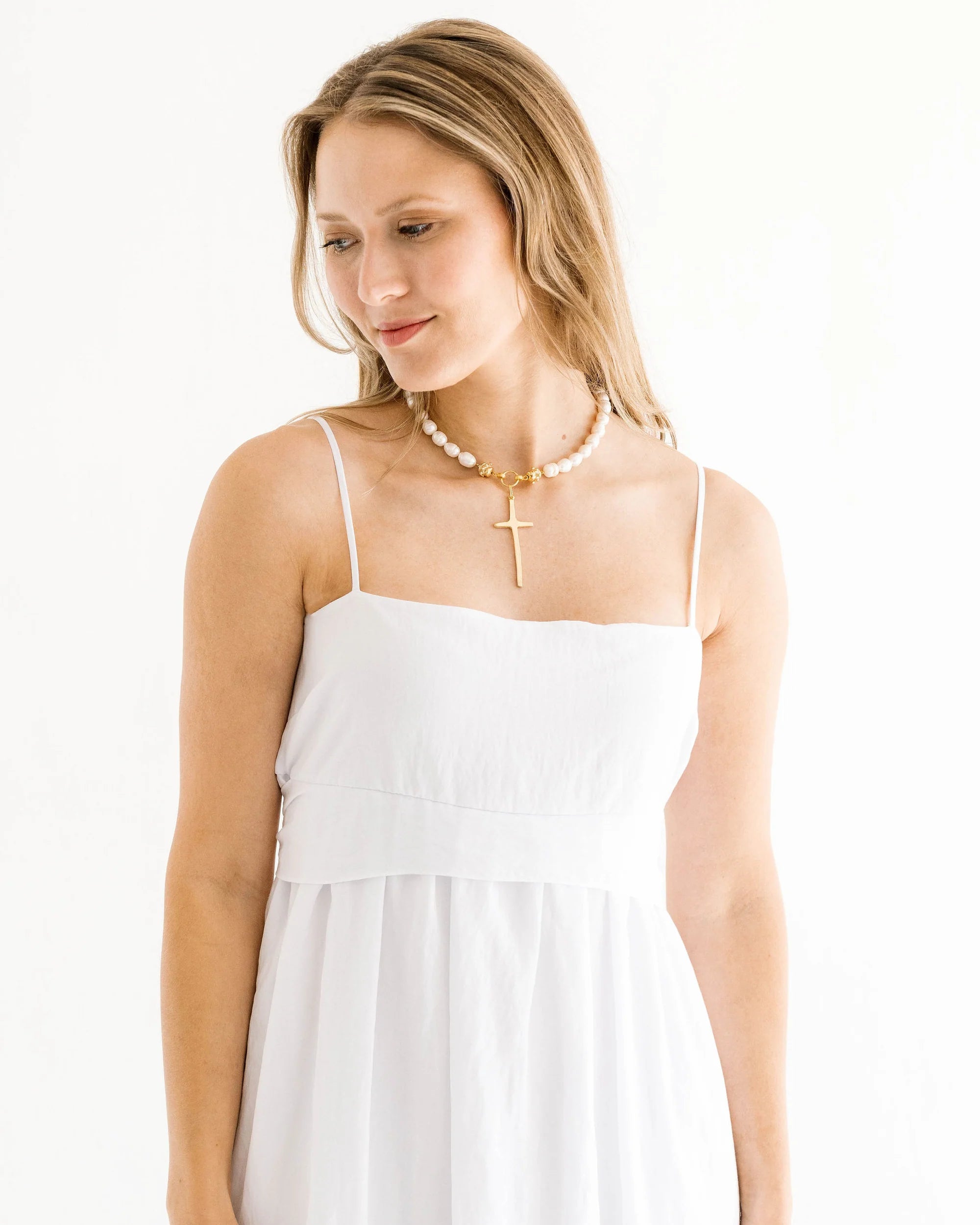Elongated Cross Pearl Necklace