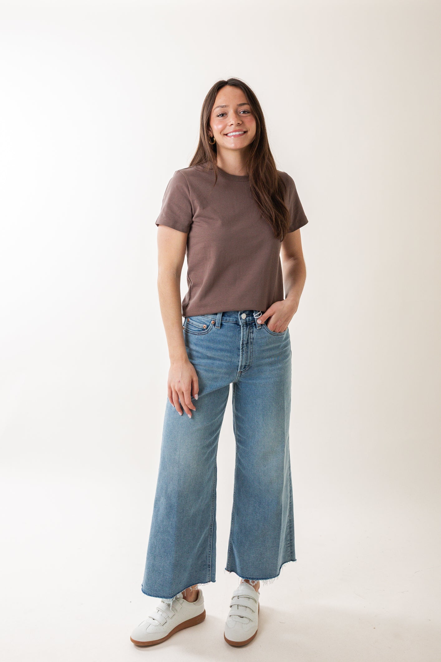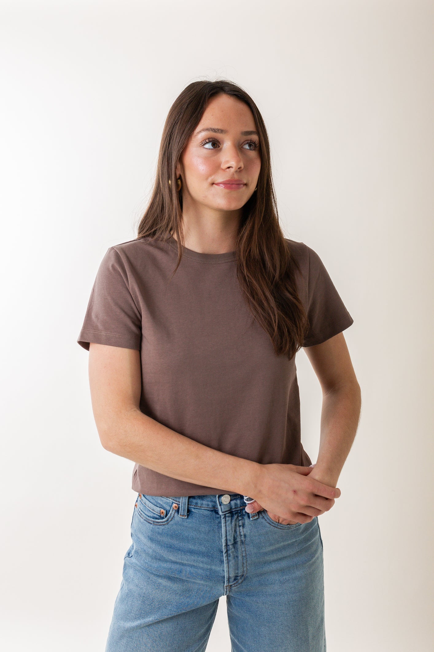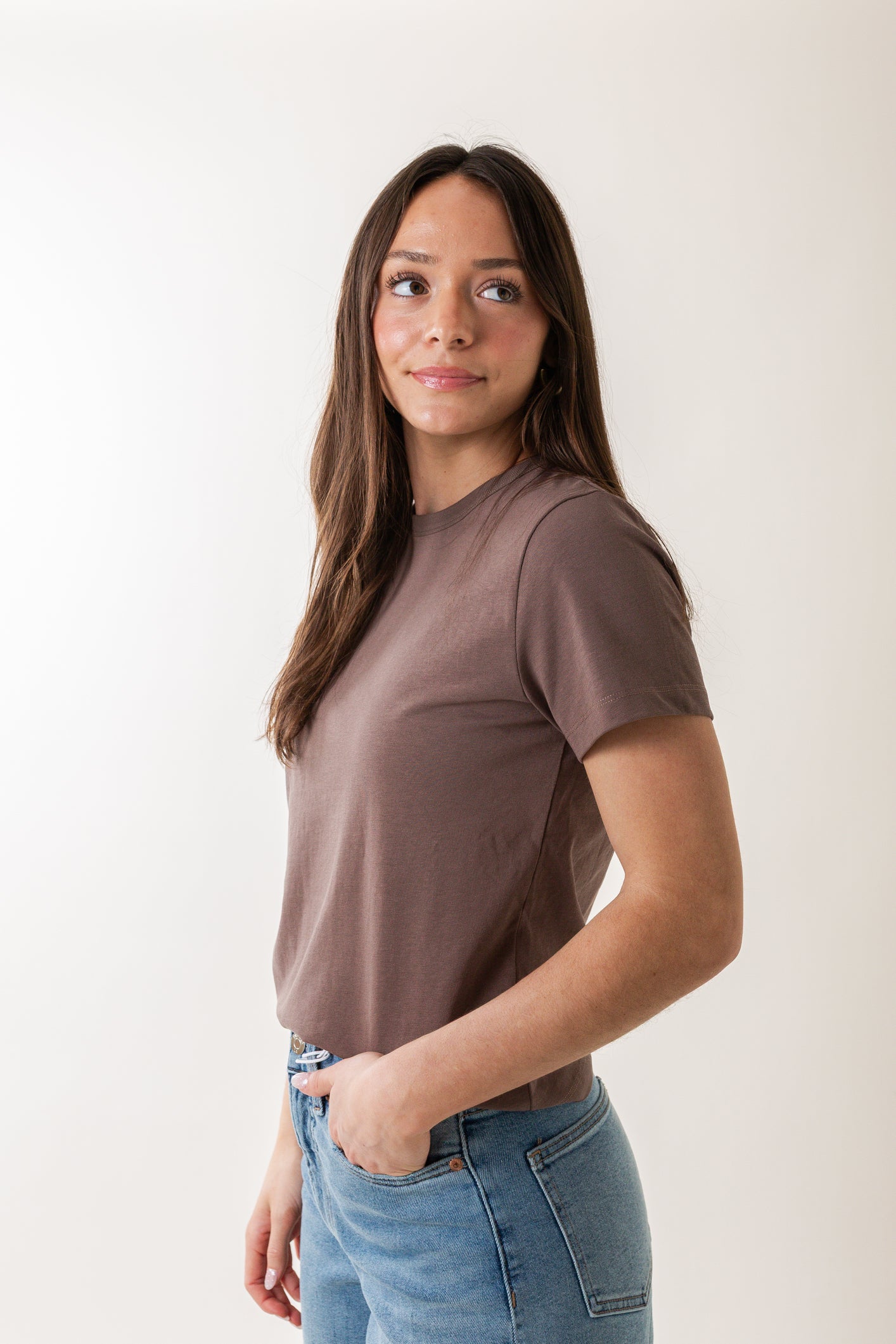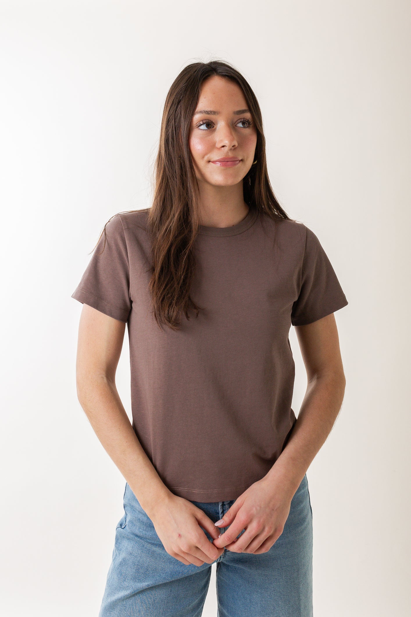 Simplify your style with the Alba Tee. This isn't just another basic – it's your new favorite essential, crafted from a rich and premium fabric that elevates your everyday look. The waist-hitting length ensures a flattering fit with all your favorite bottoms, from skirts to jeans. Layer it, tuck it, or wear it solo – the Alba Tee is designed for effortless versatility. Perfect for the woman who appreciates classic style with a modern edge, you'll find yourself reaching for this tee again and again.