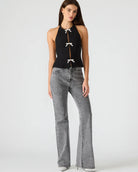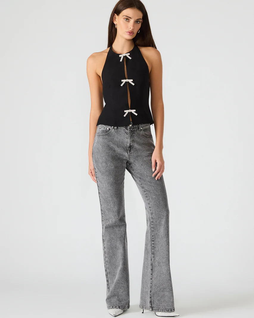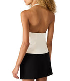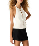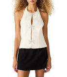 The Juvia Top features a sleek halter design that elegantly contours the neckline. Its refined bow detail adds a subtle statement of sophistication, making this top a versatile choice for both casual and upscale settings. Crafted to enhance your silhouette, the top merges style with expert tailoring for a polished look.