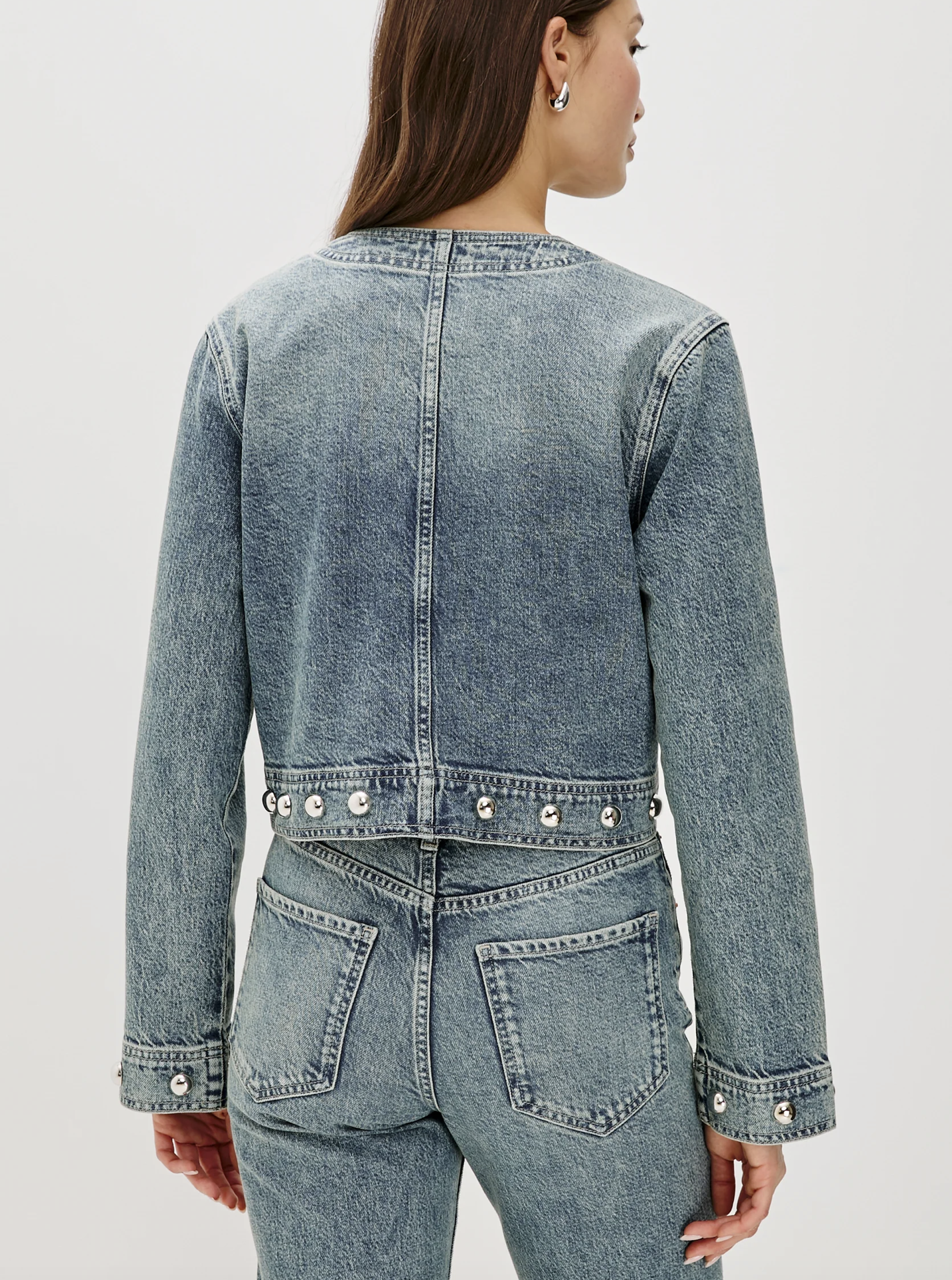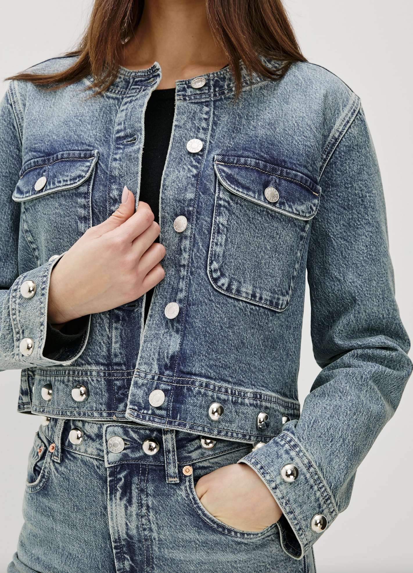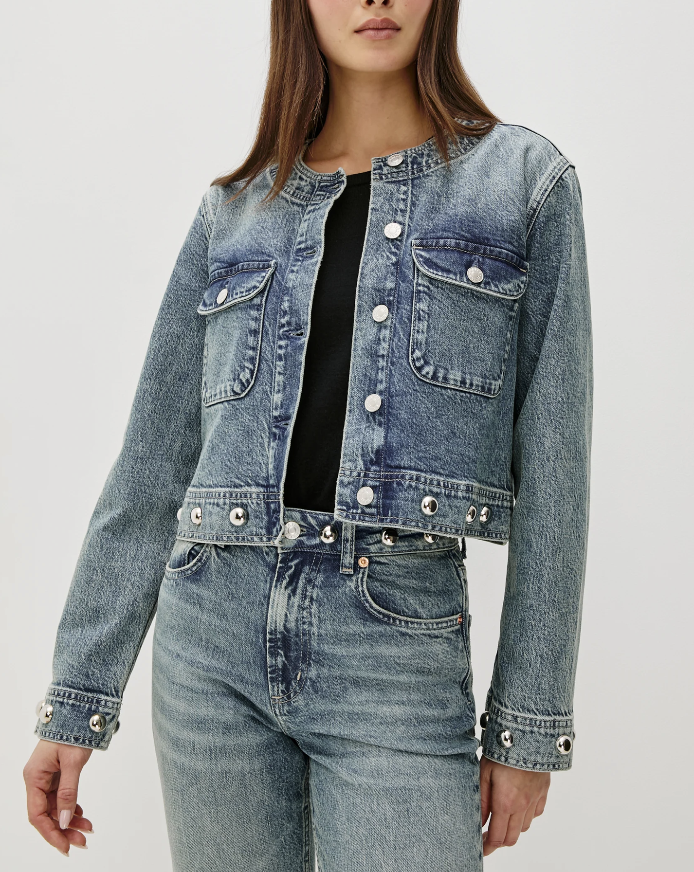 The Capistrano is a cropped, collarless 'lady' jacket with a boxy fit. Rounded studs at the hem and sleeves lend a little edge, and flap pockets finish the look. For a less cropped cut, see the Lido jacket.
