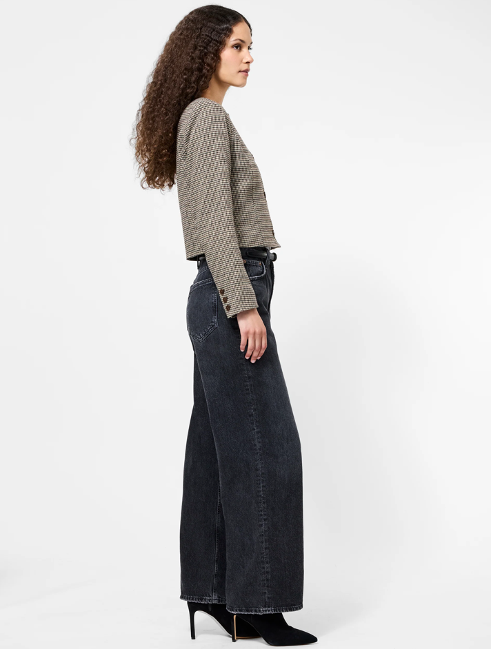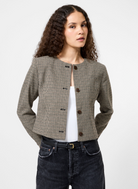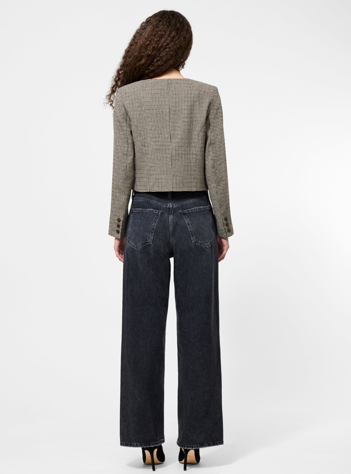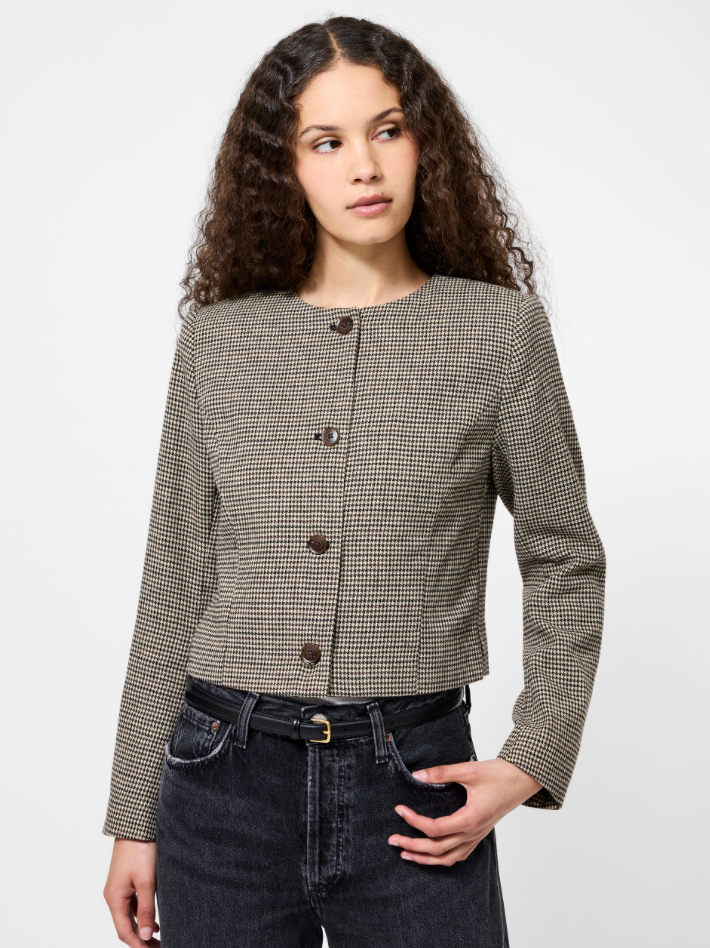 The Houndstooth Wool Jacket is a no-fuss, tailored essential. Made from our wool blend suiting in a timeless houndstooth, this collarless cropped jacket keeps things sharp and streamlined. Dress it up with a matching skirt or down with denim—either way, it pulls your look together instantly.