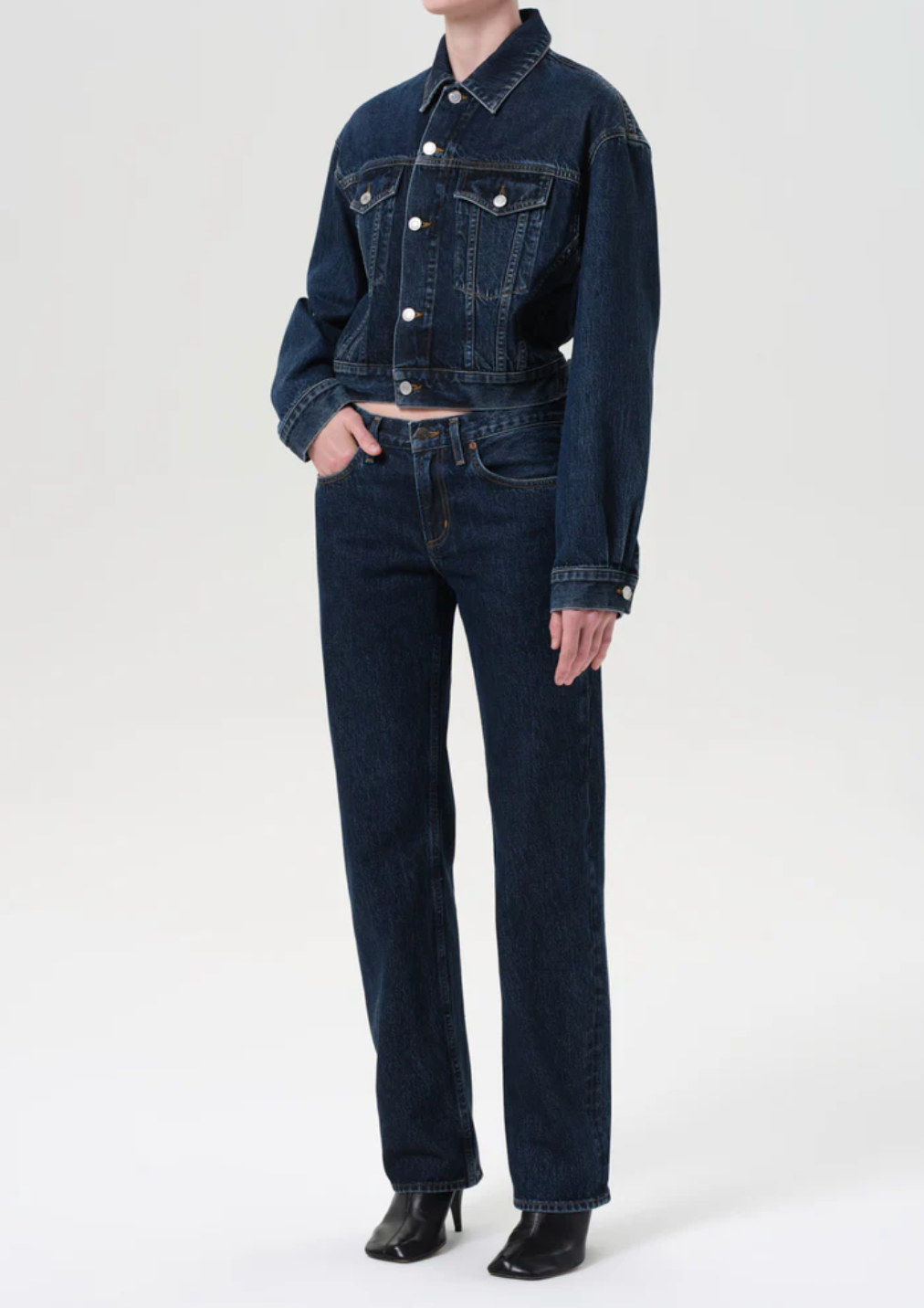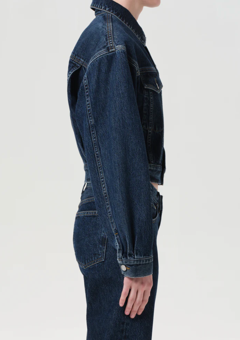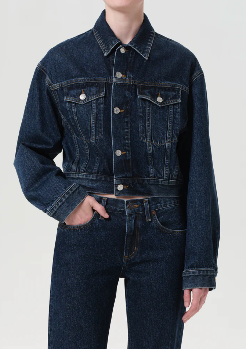 The Radley Jacket is a structured, cropped silhouette crafted from weightless, non-stretch denim in a deep indigo wash. Designed with clean lines, subtle marbling, and a defined waist, this jacket brings a modern feel to classic denim dressing. Style with vintage blues or sharp tailoring for contrast.