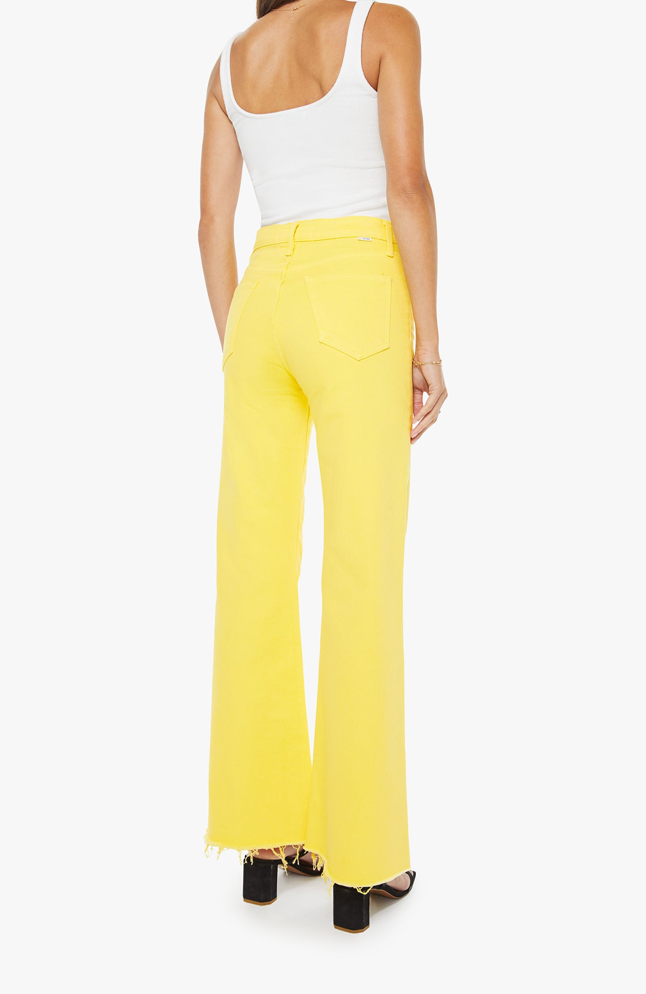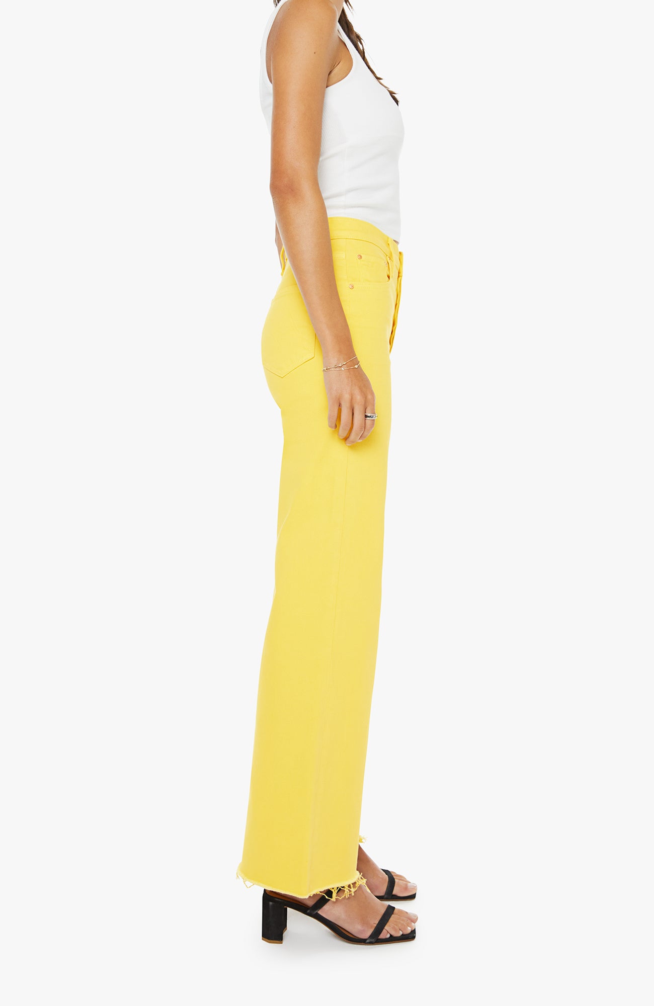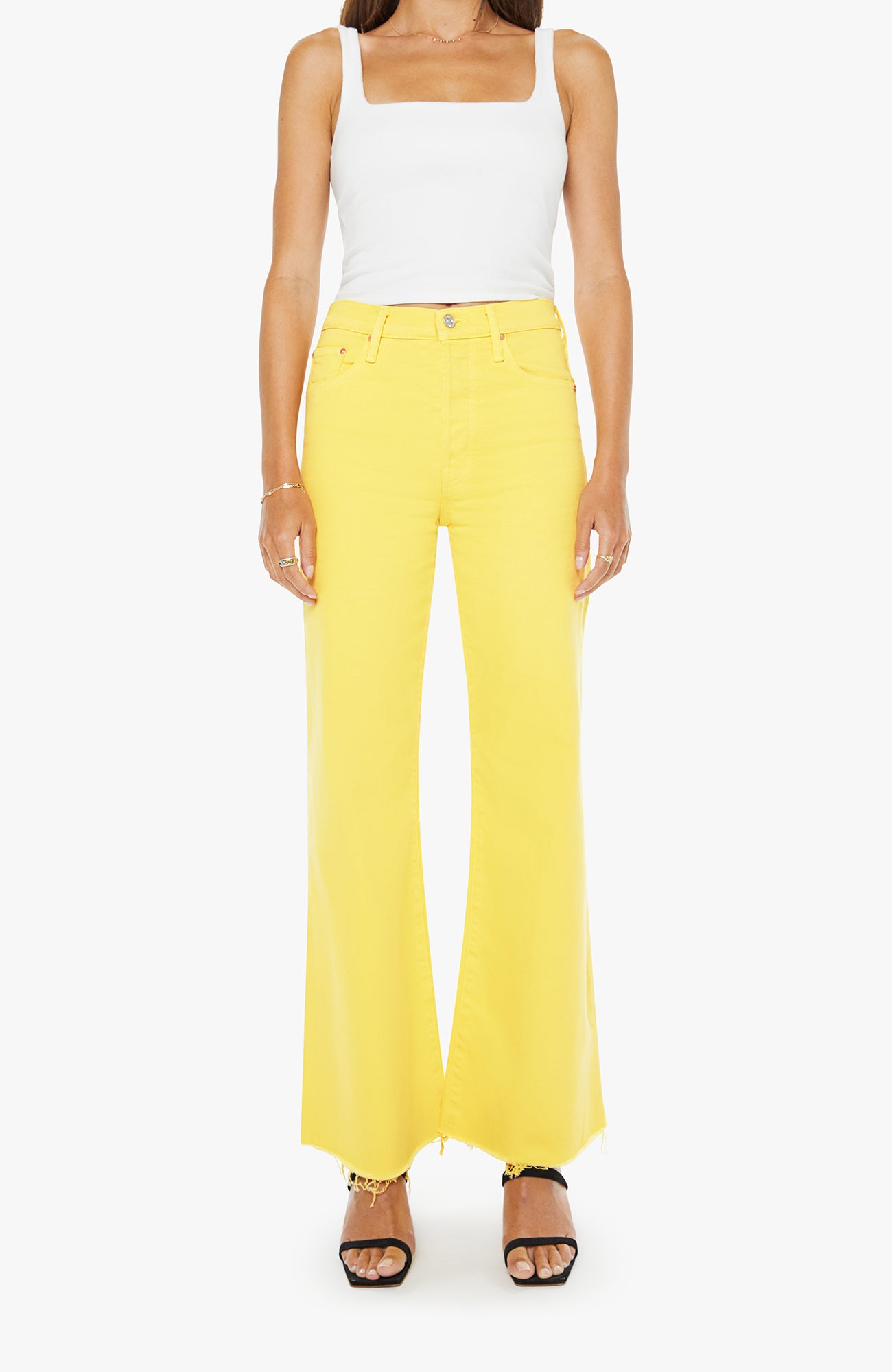 Sunny side up. High-waisted wide-leg jeans with a button fly, 31-inch inseam and a frayed hem. Made from rigid SUPERIOR denim, Sunshine is a bright yellow with subtle fading at the knees.