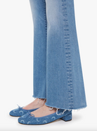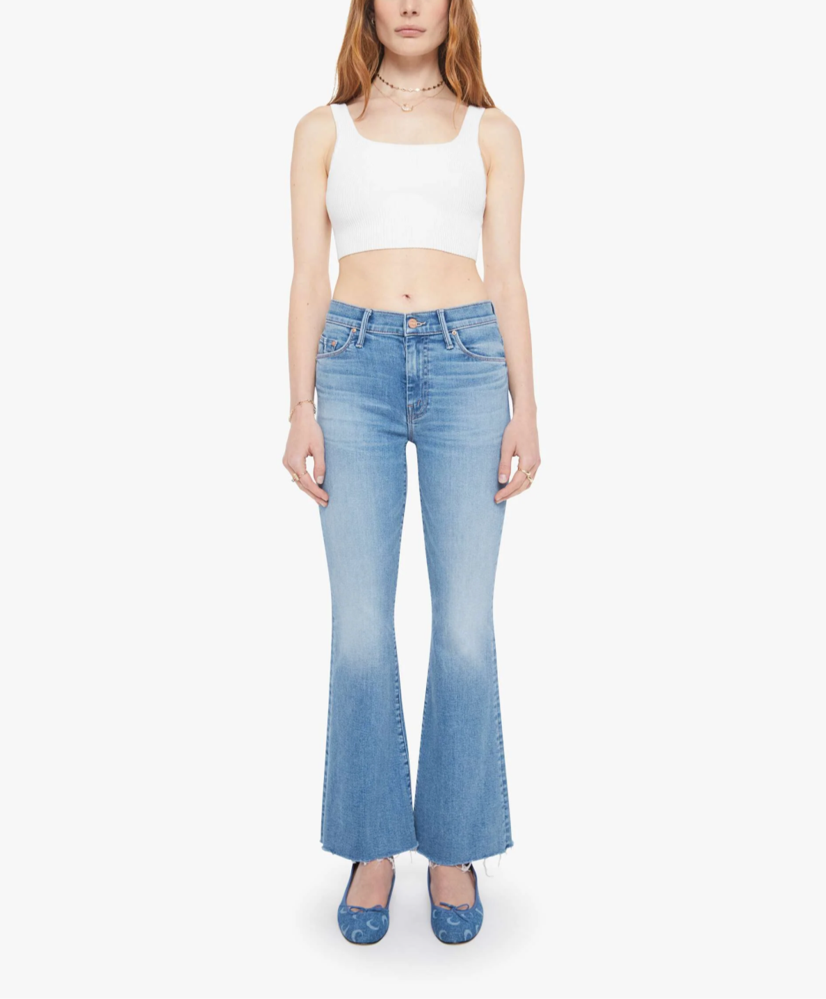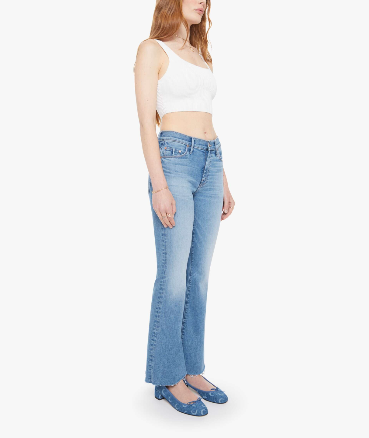 Full throttle. Our most popular mid-rise flare has a zip fly, 32.25-inch inseam and a frayed hem. Made from a blend of recycled stretch denim, Ride Hard Live Louder is a light blue with subtle whiskering and fading at the knees.